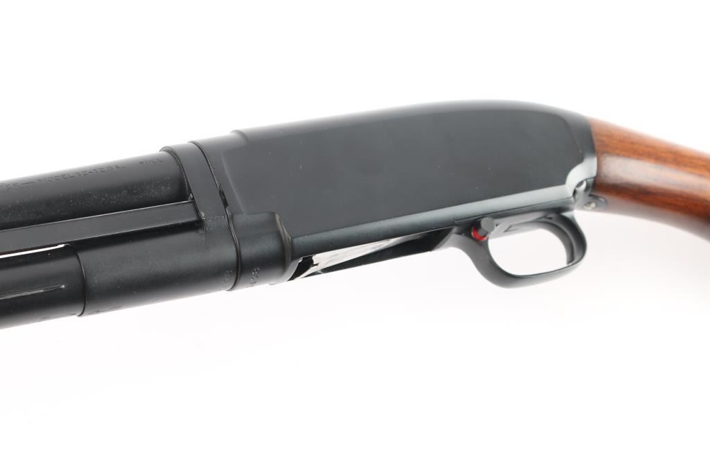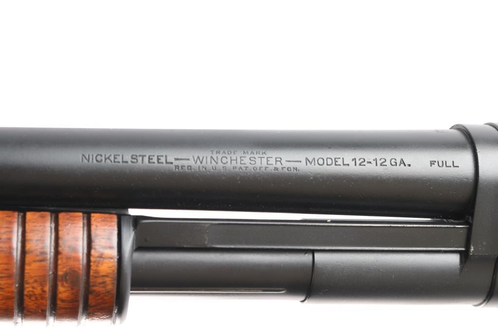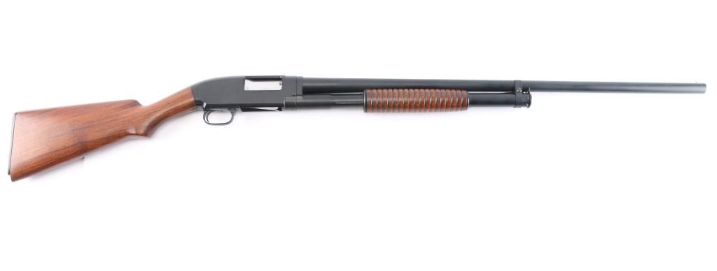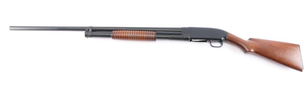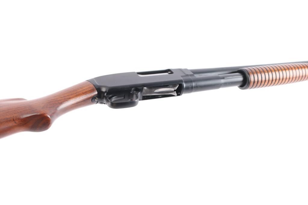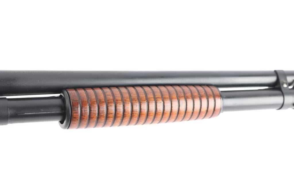 This shotgun has been professionally restored. Vintage take down pump action shotgun manufactured circa 1922. Features 30" round barrel, barrel marked "FULL" choke, steel front bead, matte blue refinish, polished bolt, walnut stock & grooved pump handle, factory composite butt plate (13 1/4" LOP), push button safety. Bore is excellent/bright. Retains 99% blue refinish Wood is near excellent. Numbers match on receiver & extension. Action is smooth. Winchester markings are crisp, readable. There is a 1/2" chip out of the bottom of the buttplate.