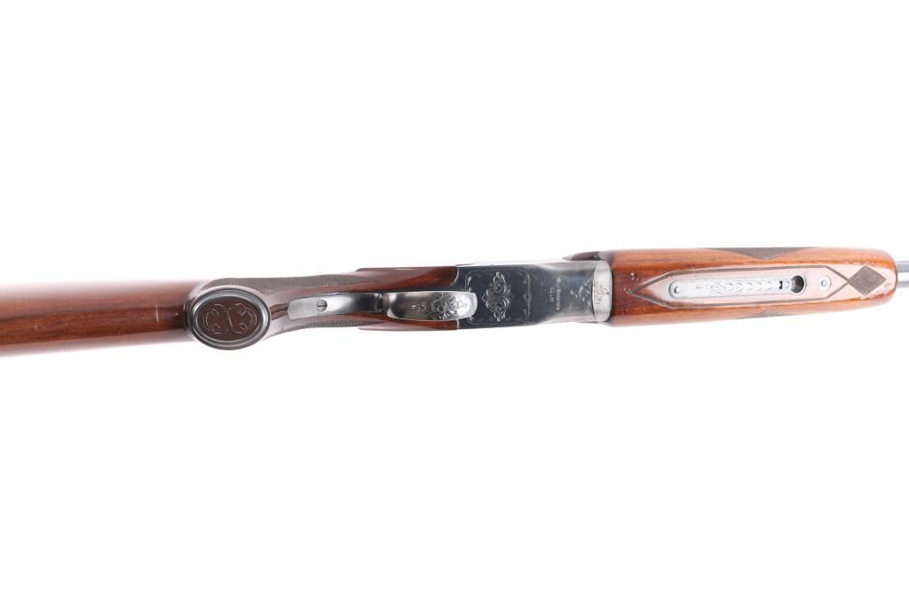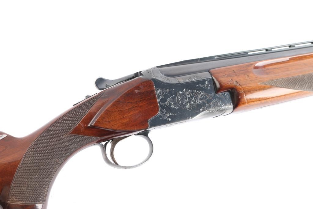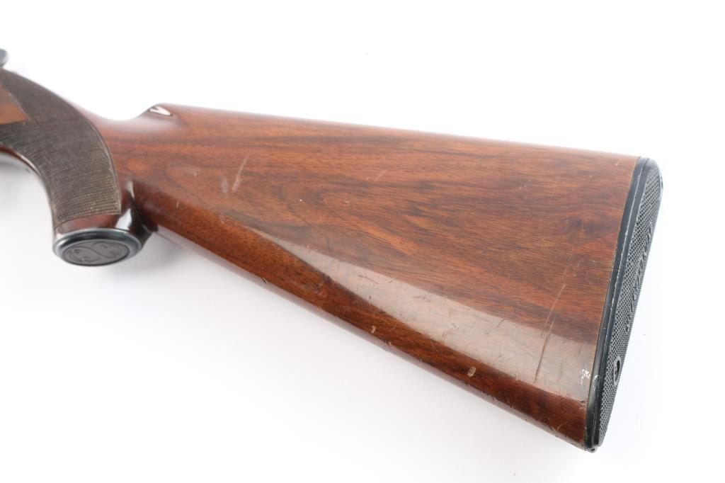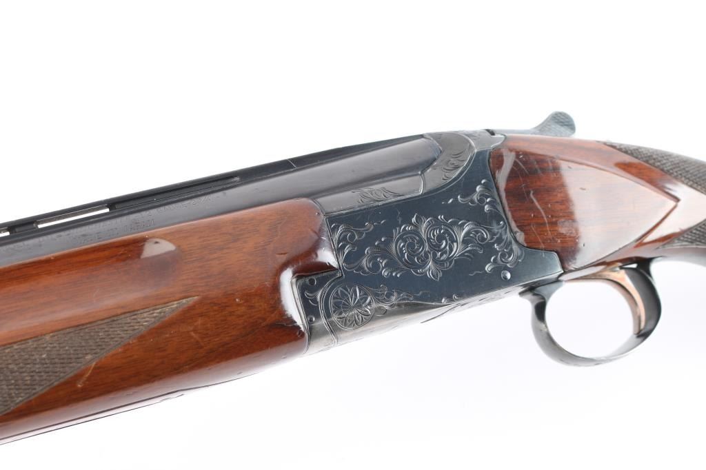 Field grade O/U. Break-top action, boxlock. Made by Olin Kodensha Co. Ltd. in Japan for Winchester. 28" barrels with ventilated, checkered, full length sighting rib with brass sighting bead. 2 3/4" chambers. Choked Full over Modified. Floral/scroll engraved receiver, triggerguard. Blued finish. Combination thumb safety/barrel selector on tang. Auto ejectors. Checkered high gloss walnut, pistol-grip stock, beavertail forend. factory black plastic buttplate, steel grip cap. Bores are excellent, bright. Barrels lock-up tight. Blued finish is about 90% with handling wear on the bottom metal, minor scratches. Wood is overall good/sound with many minor scratches/dings. This shotgun has become a classic over the years. Produced 1969. LOP-14".