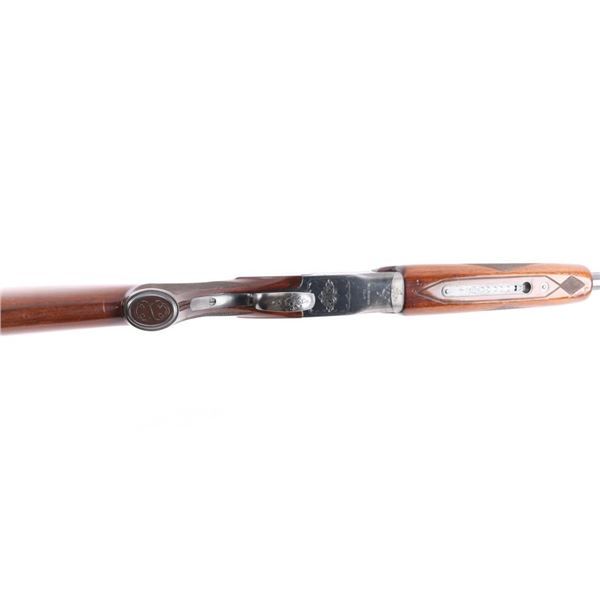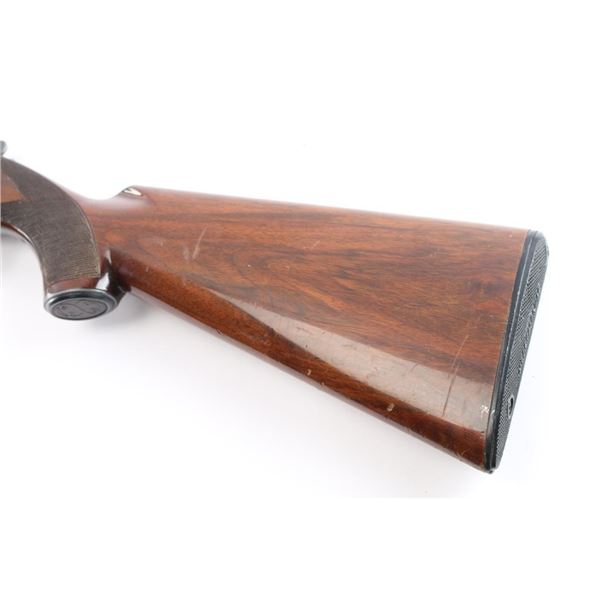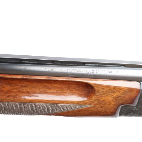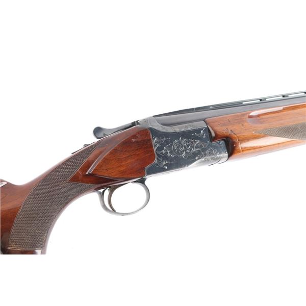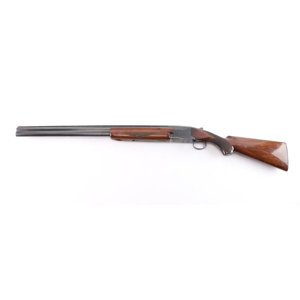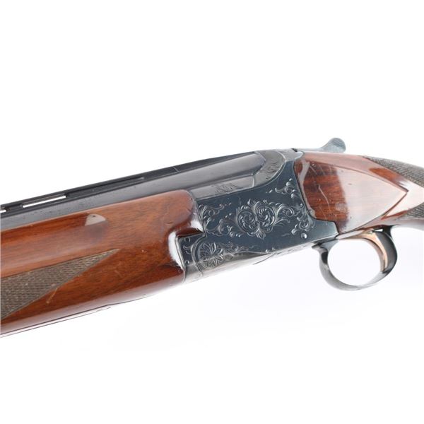 Field grade O/U. Break-top action, boxlock. Made by Olin Kodensha Co. Ltd. in Japan for Winchester. 28" barrels with ventilated, checkered, full length sighting rib with brass sighting bead. 2 3/4" chambers. Choked Full over Modified. Floral/scroll engraved receiver, triggerguard. Blued finish. Combination thumb safety/barrel selector on tang. Auto ejectors. Checkered high gloss walnut, pistol-grip stock, beavertail forend. factory black plastic buttplate, steel grip cap. Bores are excellent, bright. Barrels lock-up tight. Blued finish is about 90% with handling wear on the bottom metal, minor scratches. Wood is overall good/sound with many minor scratches/dings. This shotgun has become a classic over the years. Produced 1969. LOP-14".