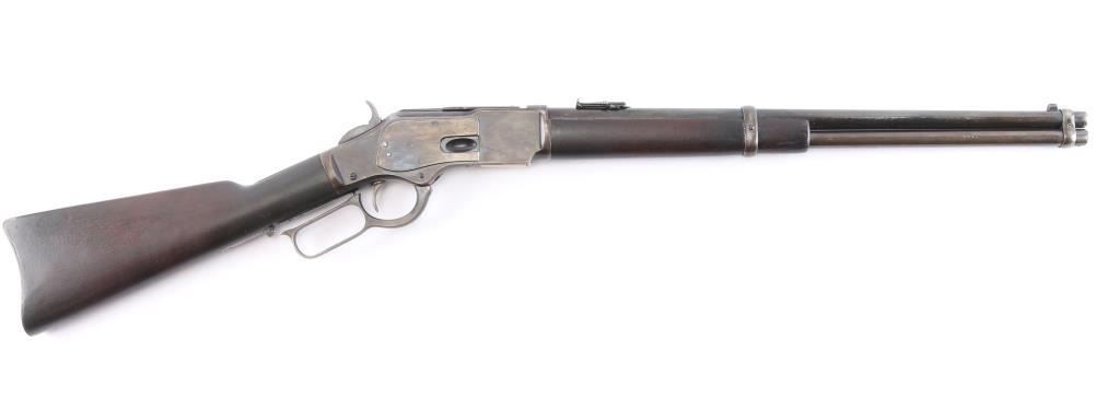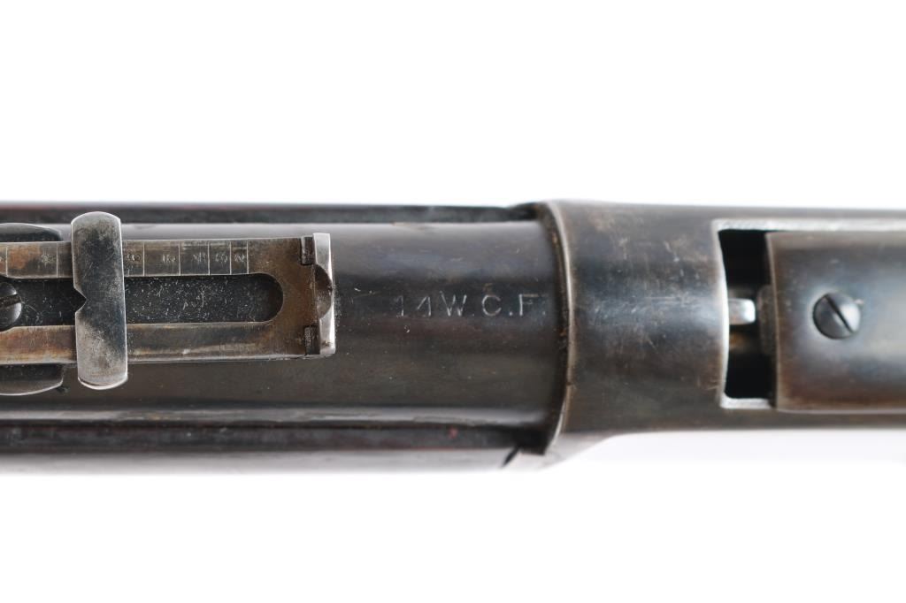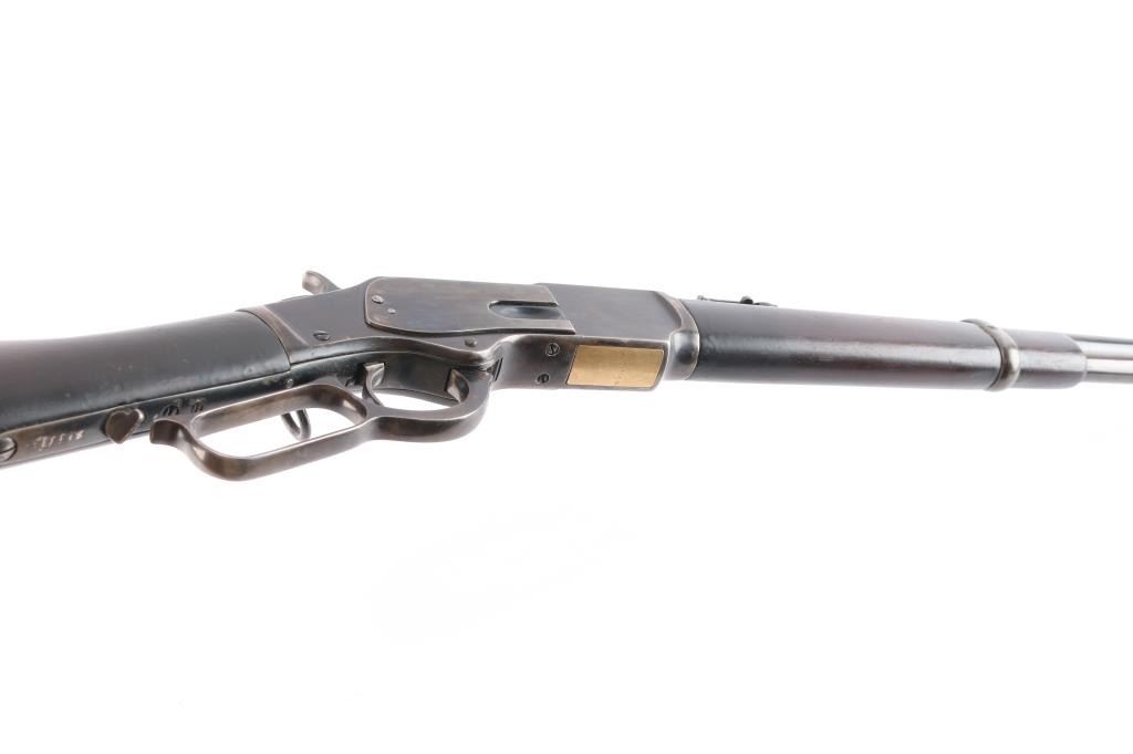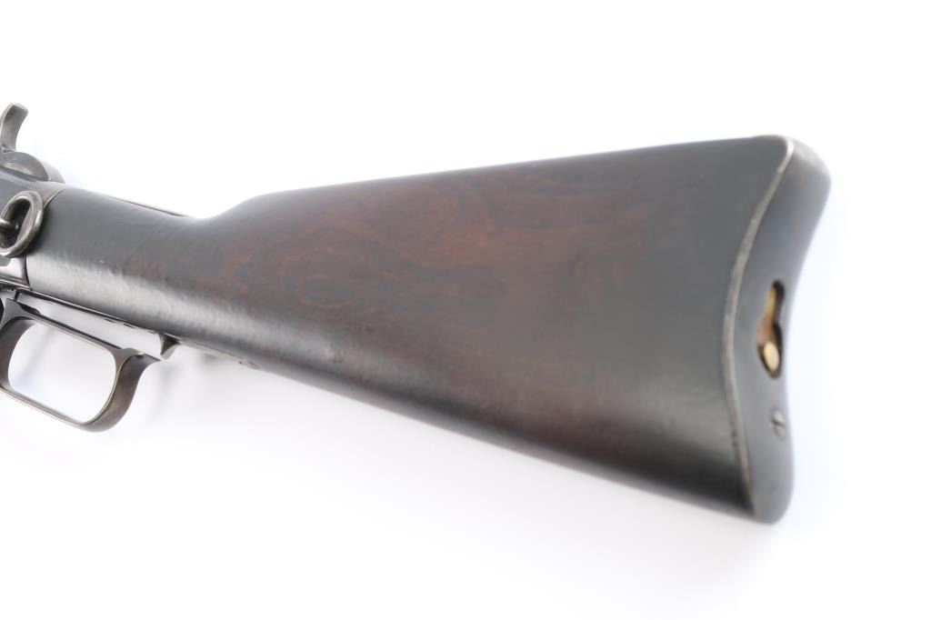 Third model 'SRC', circa 1893. 20" barrel, full length magazine tube, blade front sight, dovetailed u-notch rear sight, saddle ring and dust cover present, two barrel bands, smooth walnut forend and straight grip shoulder stock with metal carbine brass trapdoor buttplate. Rifle displays an old reblued finish, barrel markings are faint, partly washed out from wear/refinish, serial number on lower tang is faint, model markings on upper tang are very good, caliber markings on brass lifter is clear, action is smooth, and bore has rifling present, with some scattered areas of light pitting. Wood stocks are good/sound, have been refinished at some point, minor scratches/dings. The blue refinish is about 75% with handling/edge wear. magazine tube is plum colored.