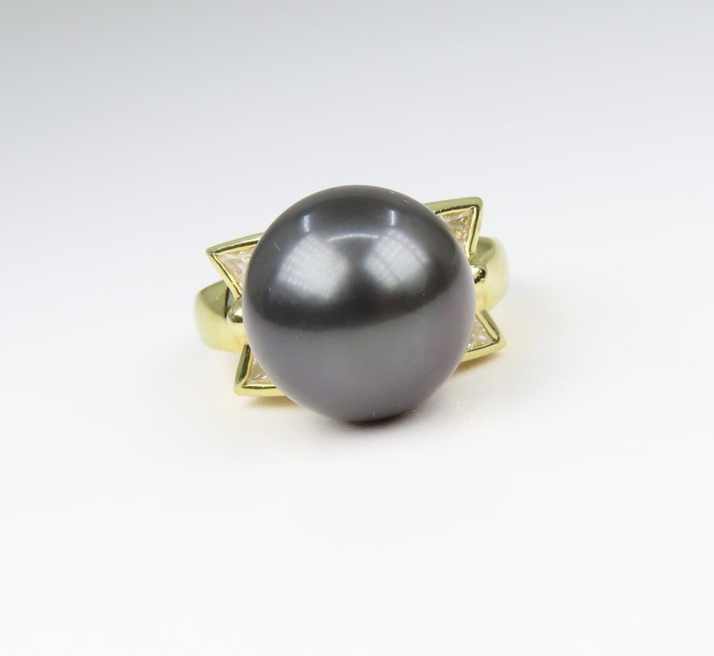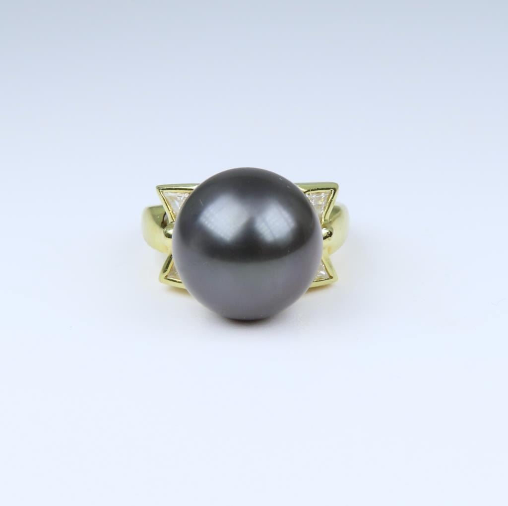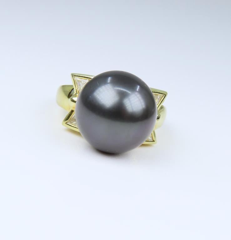 featuring a huge near flawless, approx. 13.5-14 MM Black Pearl accented with 4 triangular cut Diamonds with H-I colors and VS clarity set in a designer style setting crafted in 18 karat yellow gold. Ring size 5 ¾ Retail $4,000-$6,000