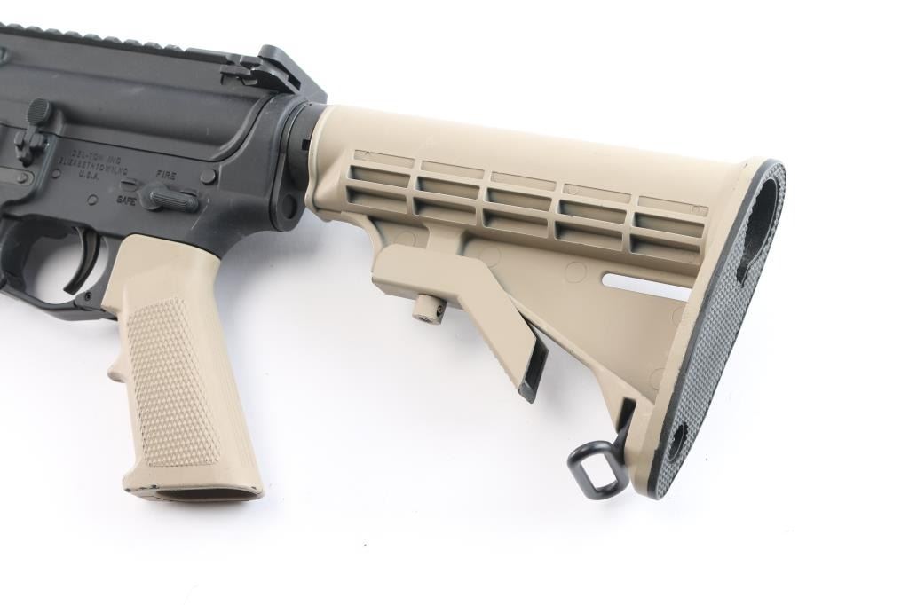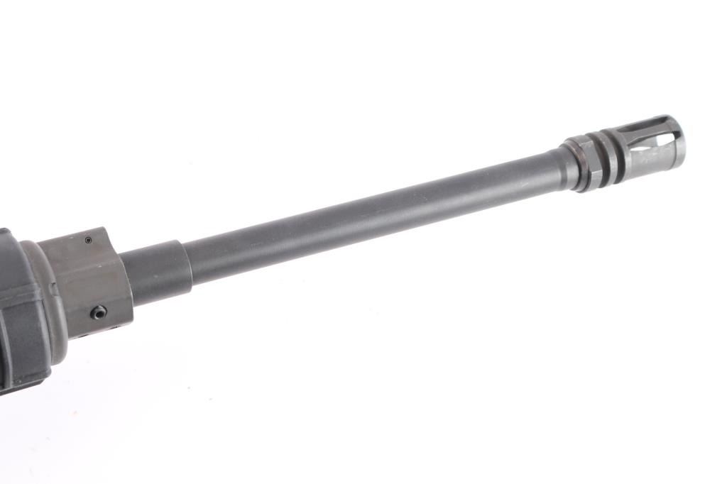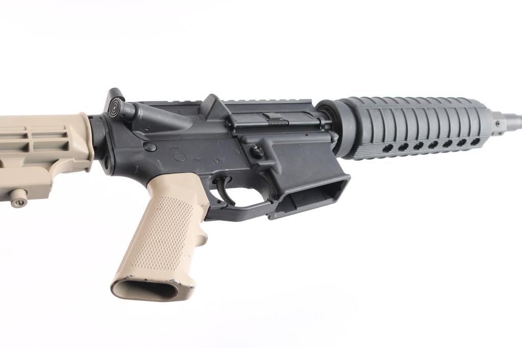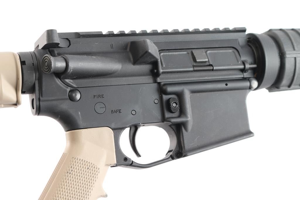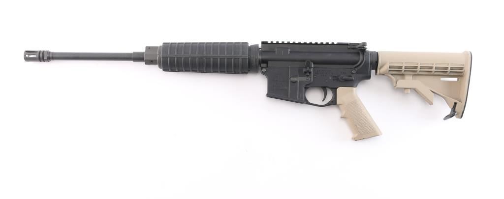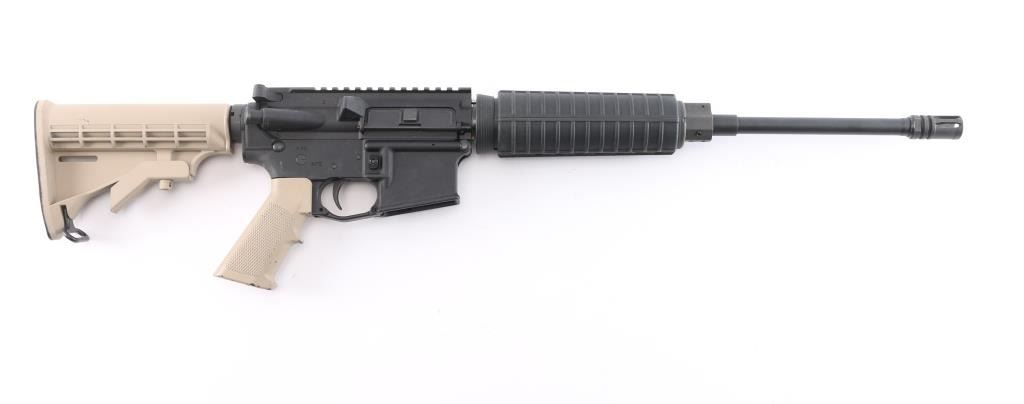 Semiautomatic rifle built on the AR15 design. Features matte black finish with tan painted grip and carbine stock, 16" slim profile barrel with 1:9 twist, A2 bird cage flash hider, round two piece black polymer handguard, carbine stock with sling swivel, rotating safety, flat top Picatinny upper,. Bore is very good. Retains 95% finish with handling marks. No magazine.