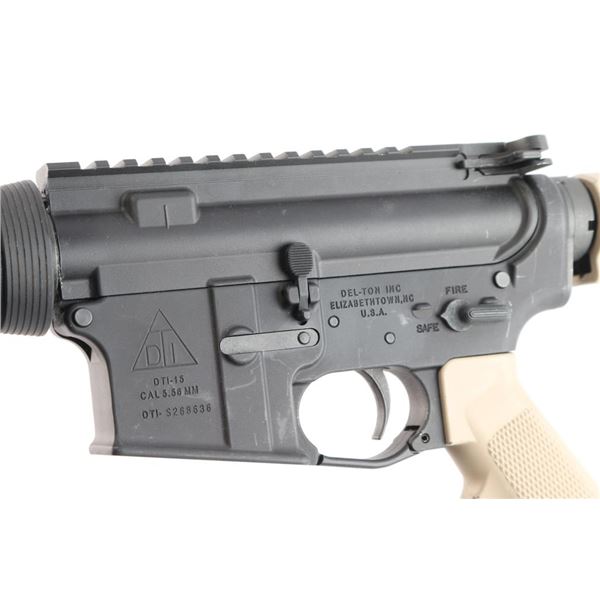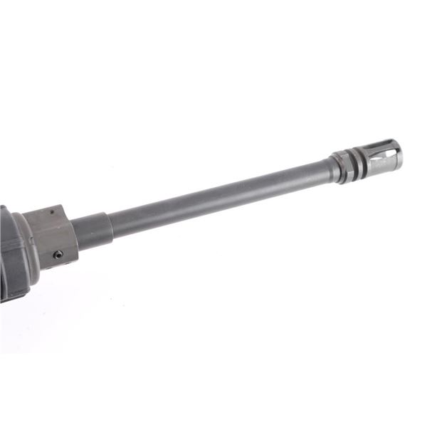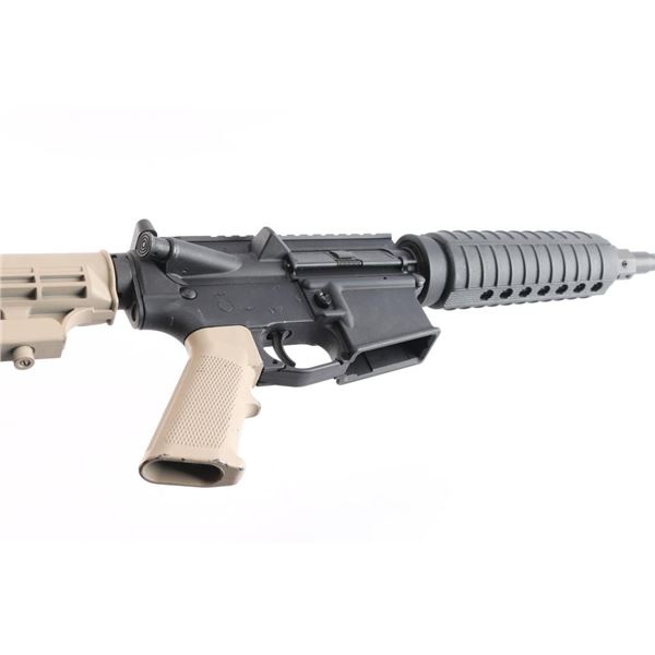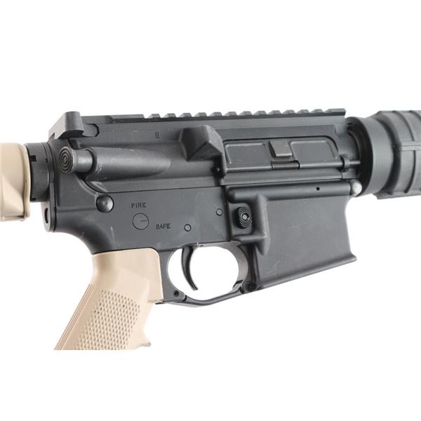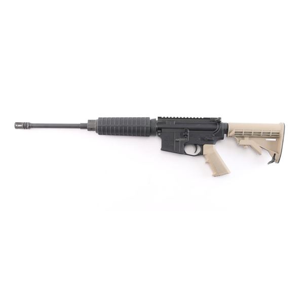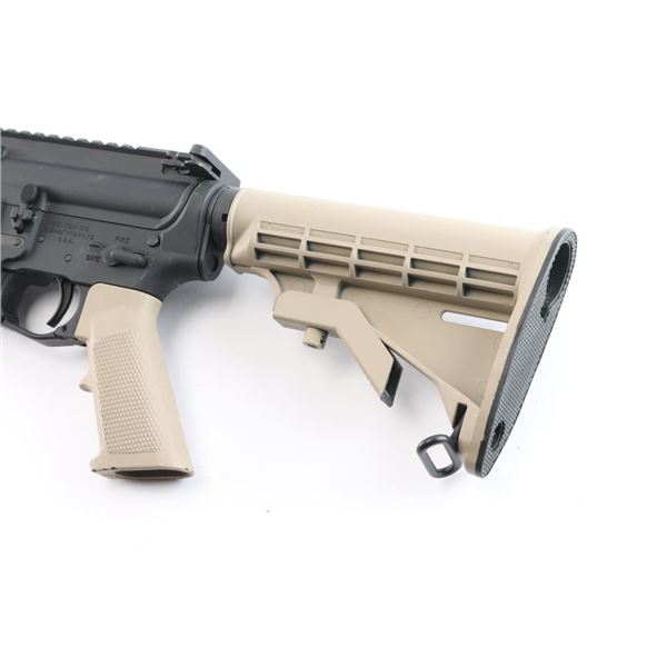 Semiautomatic rifle built on the AR15 design. Features matte black finish with tan painted grip and carbine stock, 16" slim profile barrel with 1:9 twist, A2 bird cage flash hider, round two piece black polymer handguard, carbine stock with sling swivel, rotating safety, flat top Picatinny upper,. Bore is very good. Retains 95% finish with handling marks. No magazine.