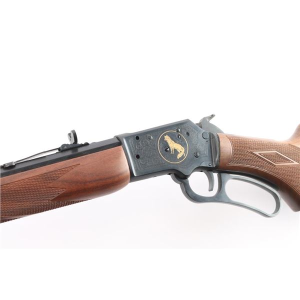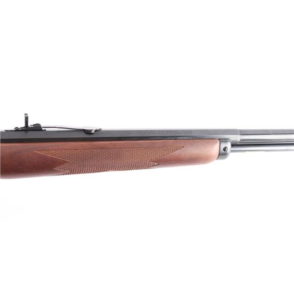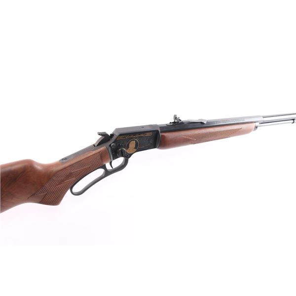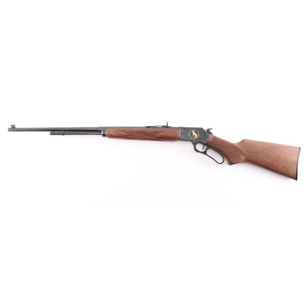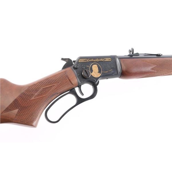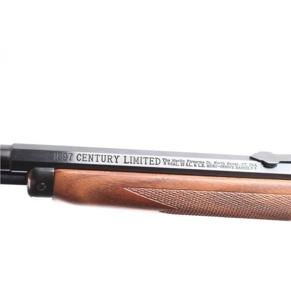 Marlin 1897 manufactured in 1997 to commemorate the 100th Anniversary of the Marlin Firearms. This example features a 24" blued 1/2 octagon 1/2 round barrel with 3/4 length magazine tube. Rear adjustable semi-buckhorn sight with white diamond insert and front blade with brass bead. Top of the barrel is stamped "1897 Century Limited" followed by Marlin Address and caliber. Blued receiver with matte top, stamped "Marlin Safety". Left side of the receiver features a gold fox in a gold circle inlay surrounded by floral scroll engraving. The right side of the receiver features gold lettering "1897 - Century Limited - 1997" above a gold portrait of John M. Marlin in a gold circle centered in a banner of gold lettering "One Hundred Years", all surrounded by floral scroll engraving. The stock is satin walnut with a pistol grip and diamond centered checkering. Matching forearm with large diamond centered checkering. A factory checkered synthetic Marlin butt plate. Comes in the original box with factory paperwork. Rifle is in like new condition, bore is pristine. Appears unfired.