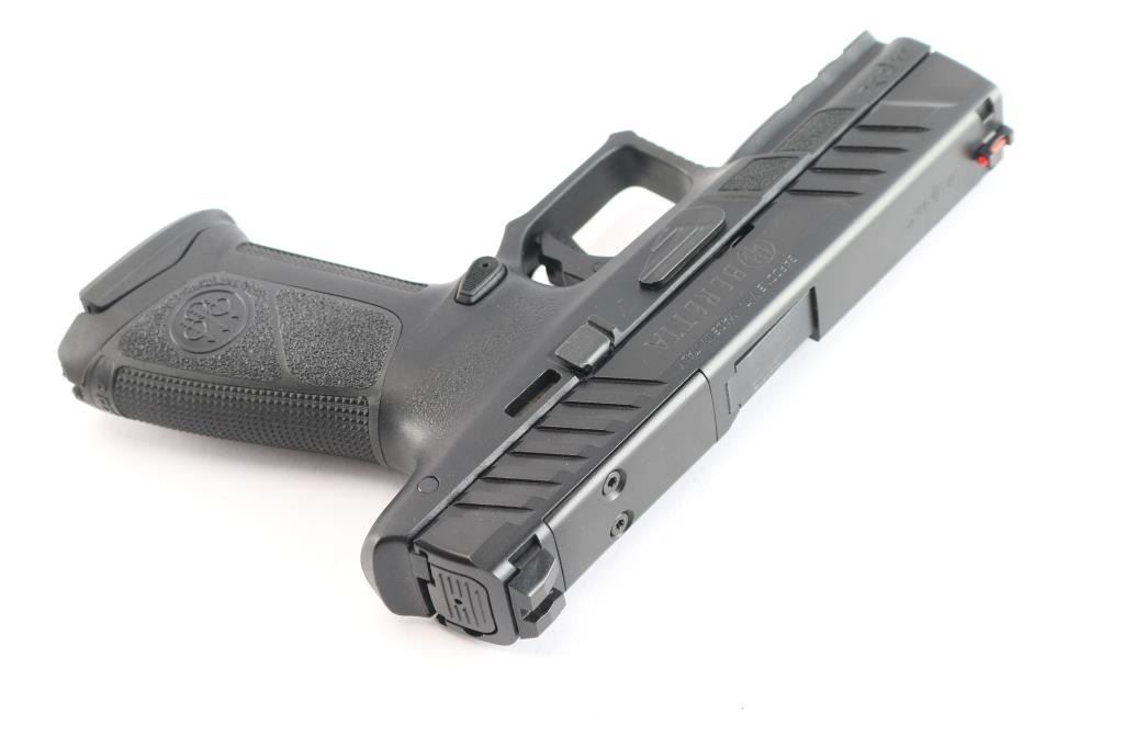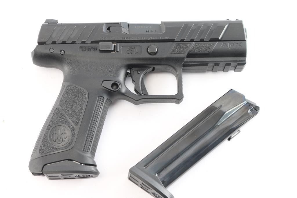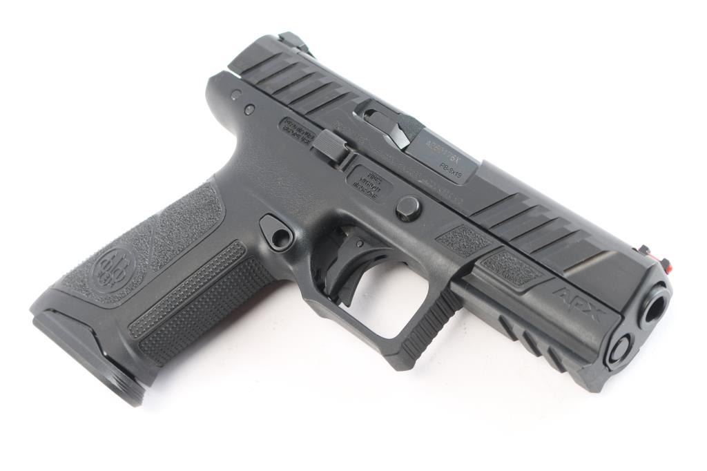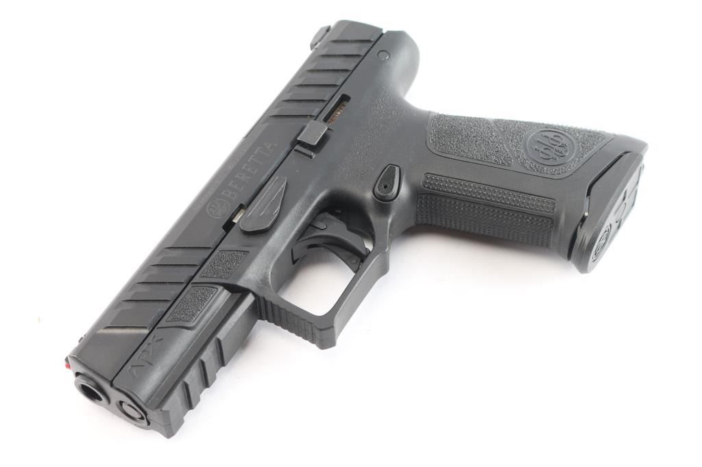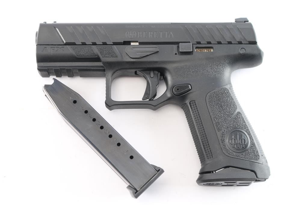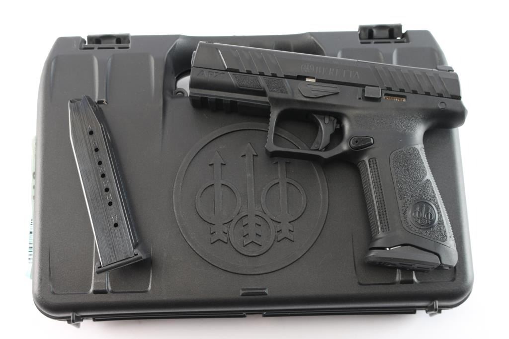 Modular striker fired semi-automatic compact pistol chambered in 9x19mm, manufactured in Italy. Features a black Nitron finished slide with full-length cocking serrations, 3.7” barrel, dovetailed red fiber-optic front sight with square notch rear sight, polymer trigger with integrated safety, ambidextrous slide catch, reversible push button magazine release, 17 round factory magazine, removable serialized chassis and replaceable black polymer grip frame housing with accessory rail, textured front strap & interchangeable backstraps. Includes the original factory hard case with matching label, literature, lock, magazine loader, spare magazine, two additional backstraps and cleaning gear. Pistol retains all of its original finish showing very little wear. Action is smooth, the bore is pristine and the polymer is fine. Like new condition.