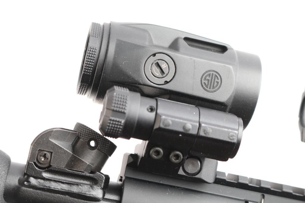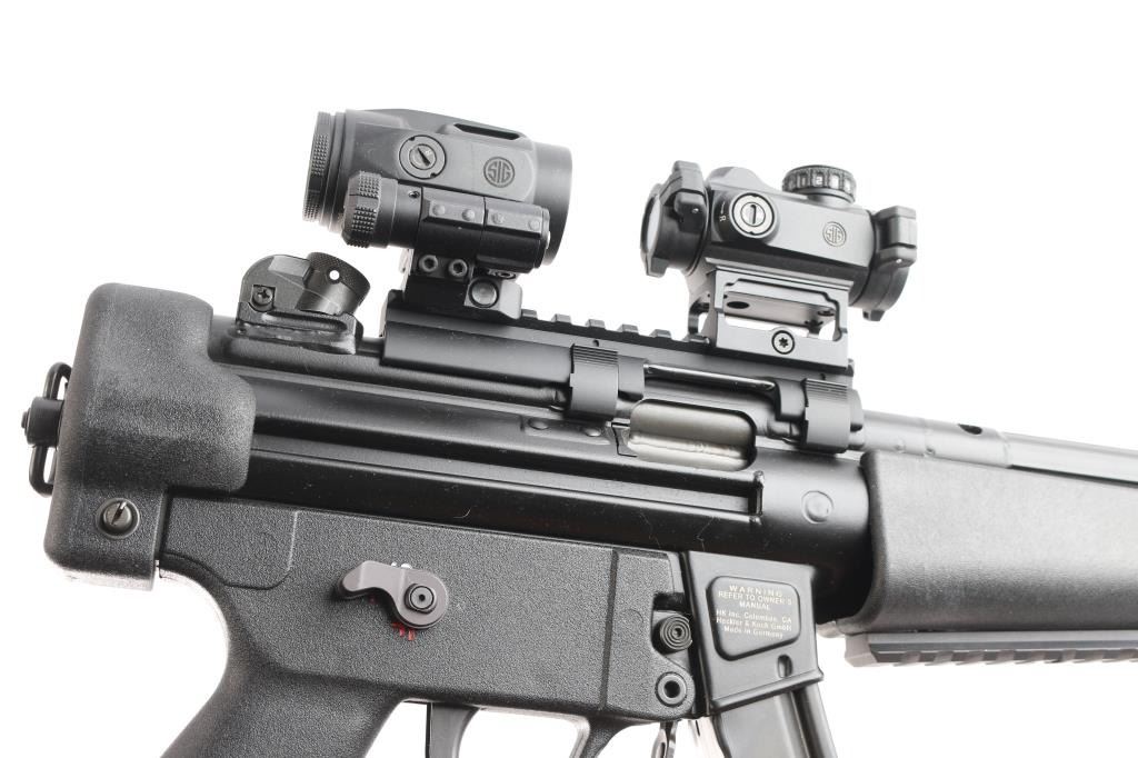German semiautomatic pistol imported by HK Inc, Columbus GA. Features matte black finish, black polymer furniture, 9" 3-lug barrel, threaded muzzle without thread protector cap, ring protected post front sight, adjustable drum rear sight, ambidextrous manual safety. Sig Sauer Romeo and Juliet sight combination installed. Franklin Armory HK SP5 Binary Trigger Group has been installed, the original factory H&K trigger group is included with the gun. Overall condition is like new. Bore is pristine. Includes one 30 rd factory magazine.