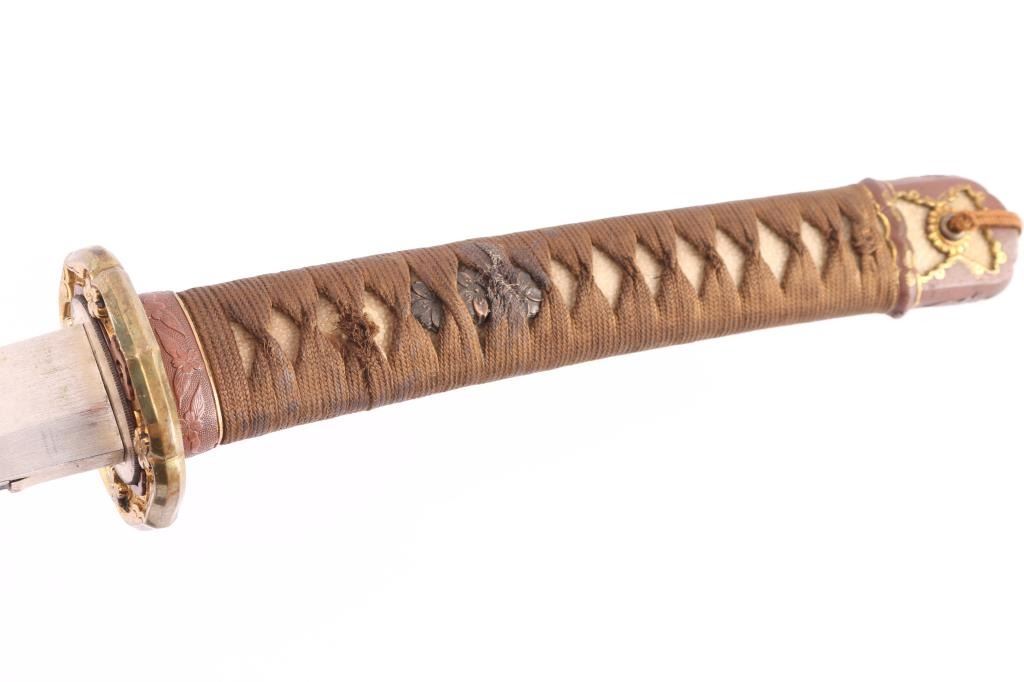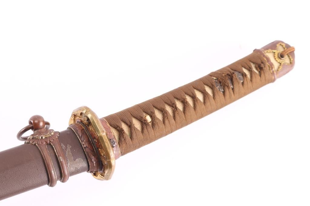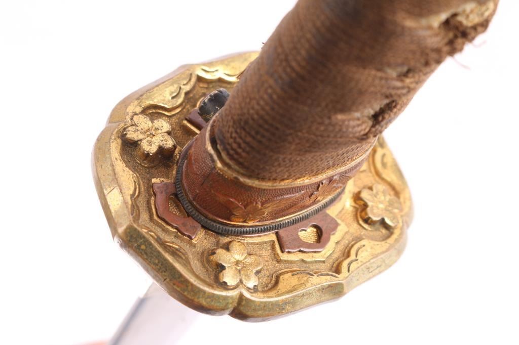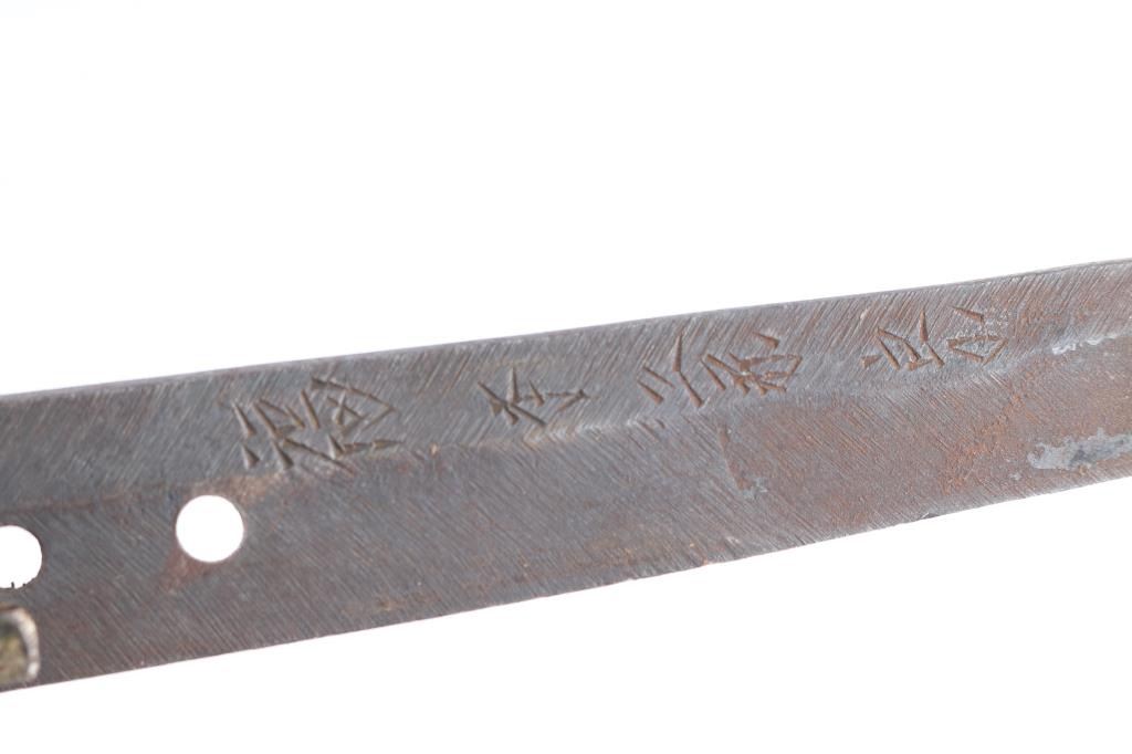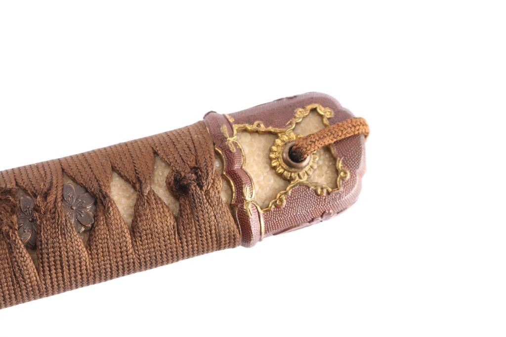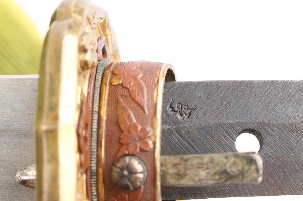 Two Holes in the tang. Visible temper line ("hamon") Blade is signed on the tang by the maker ("Mei") and has the Cherry blossom stamp with character for Sho.(1930's-40's),blade tip (Kissaki) is sharp. Blade length is approximately 27 1/4 inches and overall length 39 1/2". The temper line (Hamon) is visible, and is of the wavy O-Notare (large, sweeping waves) type.The blade mountings are the classic later WWII era Type 98 Army Shin-Gunto style, brass with gilt accents. Rounded tsuba (cross guard) with brass Imperial Army cherry blossom menuki (grip decoration), and a nice Kabuto-Gane (Pommel Cap). The cross guard and pommel cap have matching cherry blossom motifs, which are also found on the steel scabbard fittings, and the fuchi (grip collar). There are 4 Seppa (spacers) around the cross guard to keep the fit tight, and all are inletted for the scabbard lock. Locks perfectly into the scabbard. The blade collar (Habaki) looks to be copper alloy, with some nickel plating. The handle (tsuka) has an nice faux stingray skin (Sa-Me) grip, which is in great shape. It has a complete Ito (cloth binding), which shows almost no wear. The single bamboo securing peg is still present, but is most likely a replacement. The Scabbard (saya) is steel and in very nice condition,with much of the original paint intact and has the correct single hanger loop of the Type 98 style. The top fitting is inletted for the scabbard lock on the hilt. .