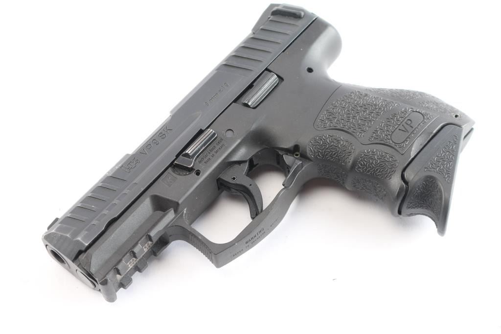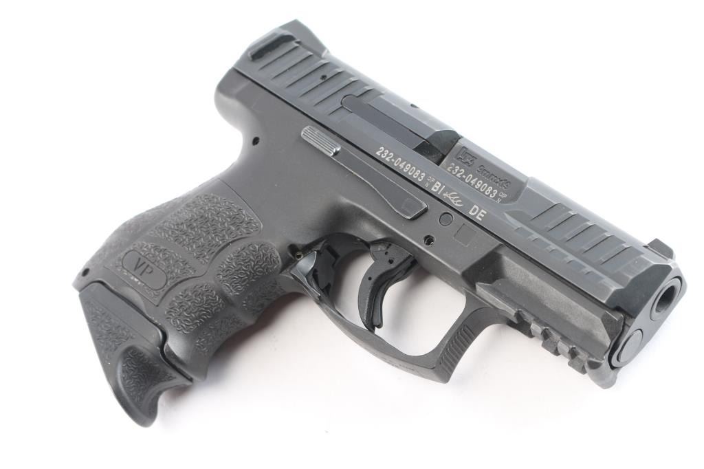 The Heckler & Koch VP9SK 9mm Luger Striker-Fired Pistol, which is constructed with a cold hammer-forged barrel, is designed for concealment. The pistol features an integrated abbreviated Picatinny MIL-STD-1913 rail and an adjustable grip with molded finger grooves. HK VP precision strike trigger. 3.39" barrel, safety trigger, three-dot luminescent sights, loaded chamber indicator, ambidextrous mag release in triggerguard. Pistol shows holster wear and minor contact wear on the barrel hood with approximately 95% finish intact. Bore is excellent. Includes factory hard case, one 10 rd magazine with finger extension. two additional grip panels and back straps and manual.