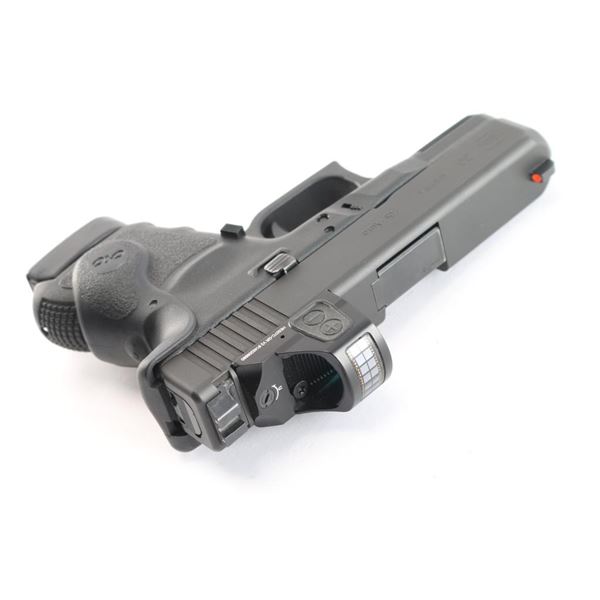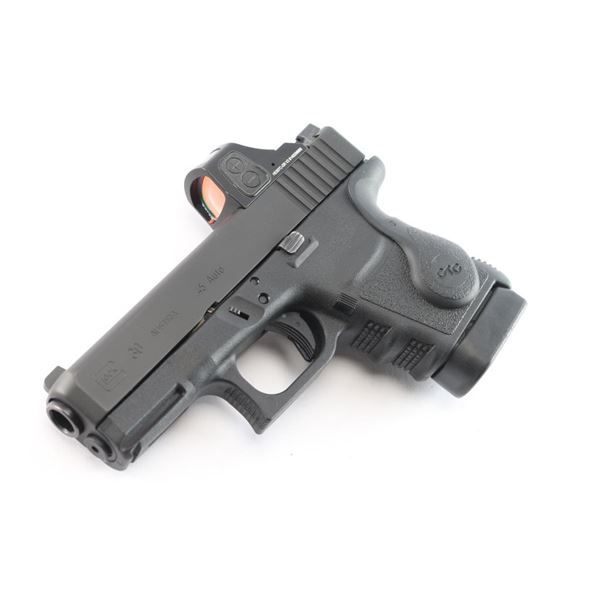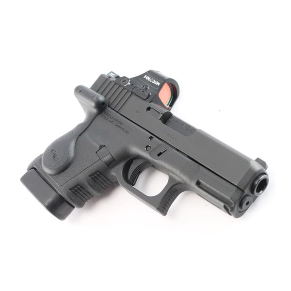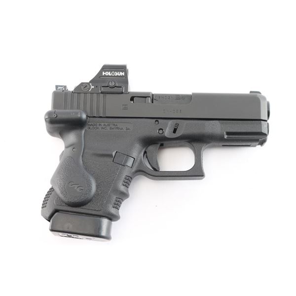 Upgraded Austrian semiautomatic 'Short Frame' pistol, imported by Glock Inc, Smyrna GA. Features approx 3.75" barrel, Trijicon orange outline front and two dot u-notch rear sights, Holosun HE507C-GR-V2 Green Dot Sight installed, in good working order. Striker fired, manual safety in trigger. All black finish. crimson Trace red dot laser sight installed on grip, in good working order. Bore is pristine, retains 99% finish on slide, Polymer frame is excellent. Includes one Glock 10-rd magazine with extended floorplate.