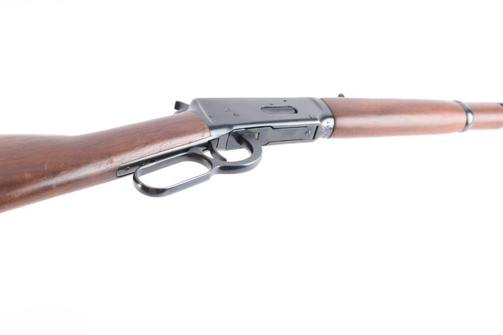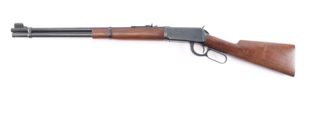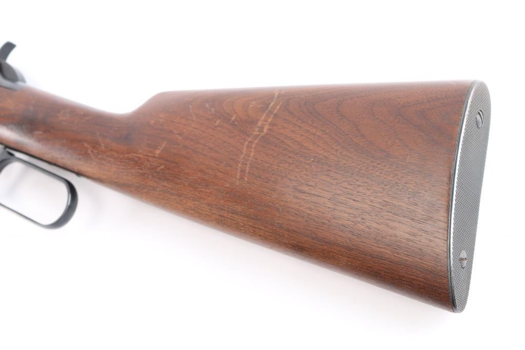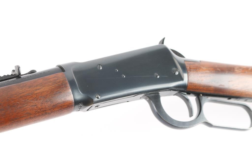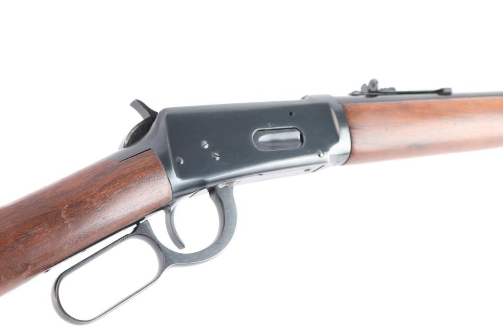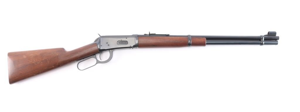 Pre-64 Eastern Carbine' Vintage lever action repeating rifle chambered in .32 Winchester Special, manufactured in New Haven, CT circa 1949. Features a blued finish, 20" tapered barrel, full-length tube magazine, hooded ramped blade/bead front sight, adjustable sporting rear sight, smooth trigger, serrated hammer spur, steel receiver, two barrel bands, smooth walnut forend and straight grip shoulder stock with knurled metal buttplate. Bore is excellent/bright. Retains 95% original blue finish with some slight edge wear/scratches. Wood is very good/sound with scratches/dings mostly on the shoulder stock, action is smooth. Winchester markings are crisp/clear. The lower barrel band screw slot is broken,