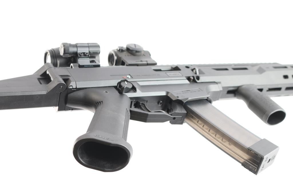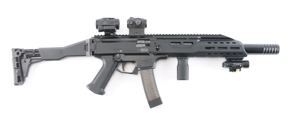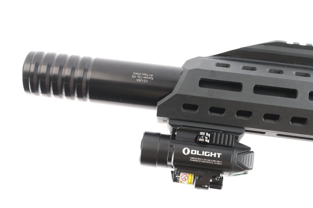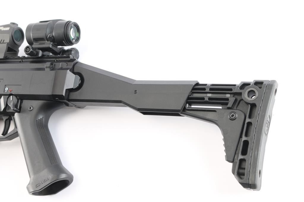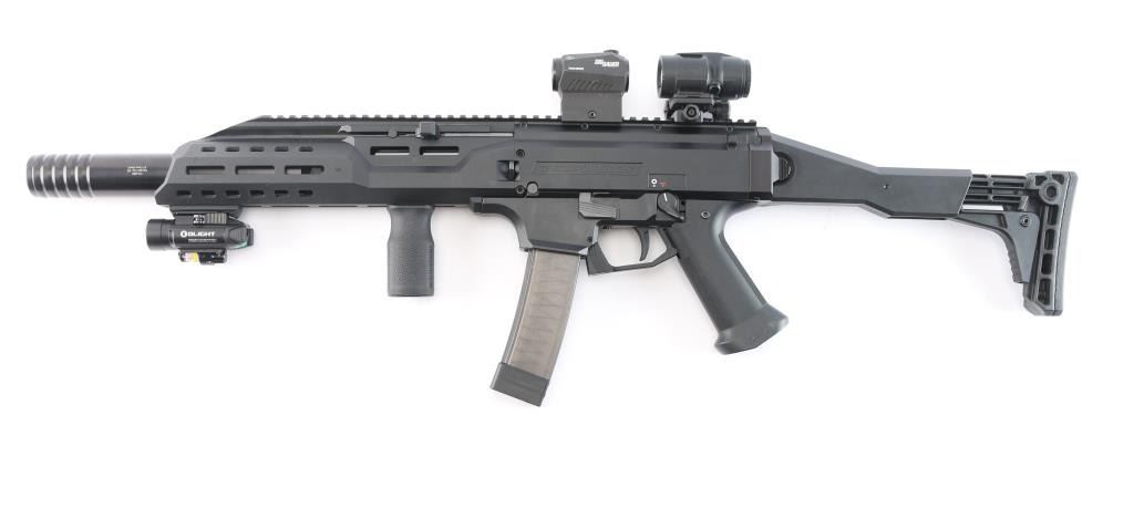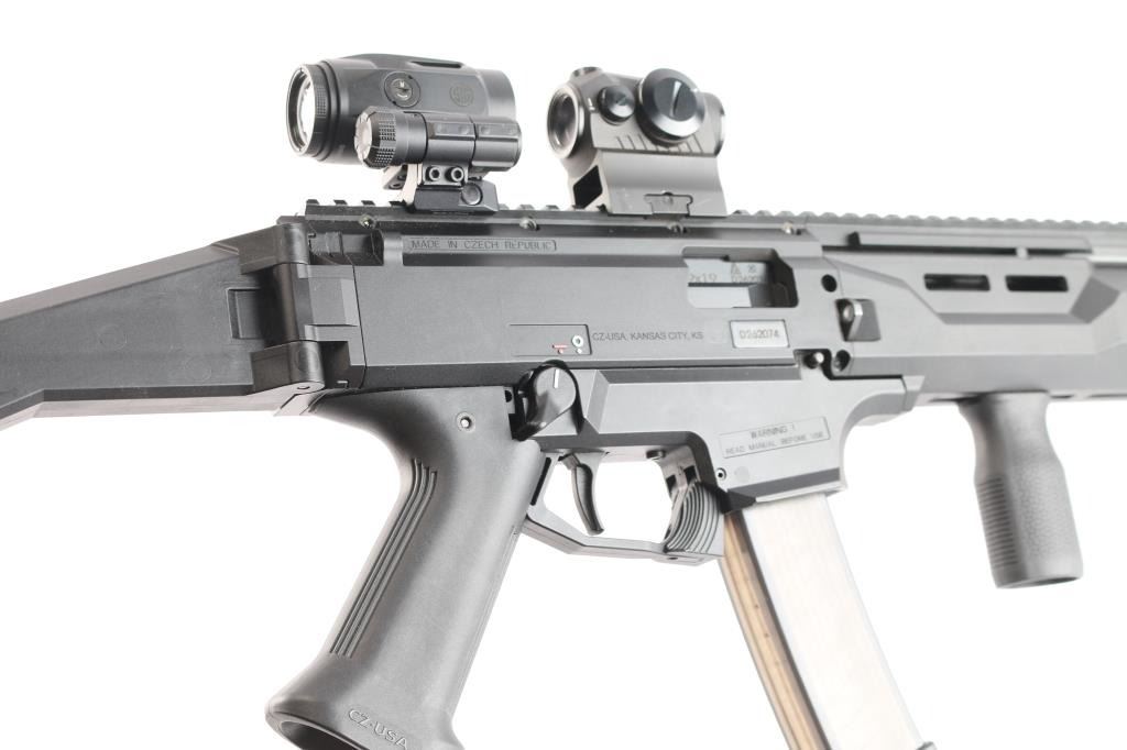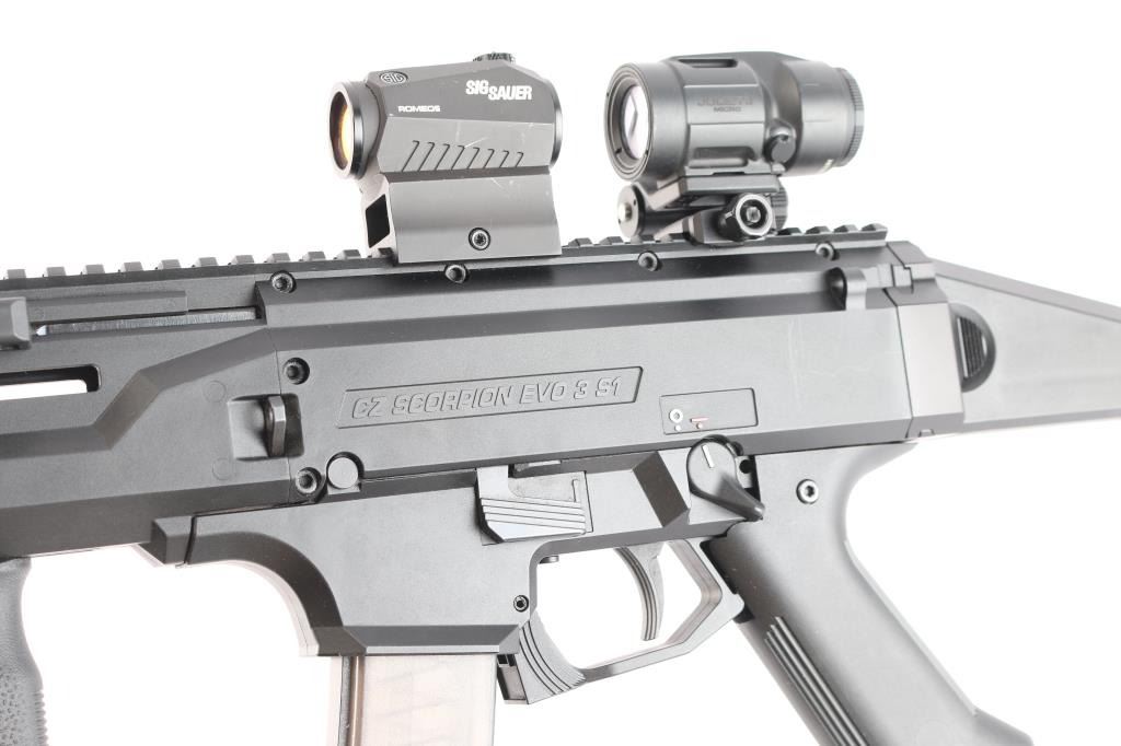 Czech Semiautomatic carbine imported by CZ-USA. 16.1/2" threaded Barrel w/ Removable Faux Suppressor. 16.30", Threaded Barrel w/ Removable Faux Suppressor. Features matte black finish, polymer construction. Features Scorpion EVO folding stock with 3 adjustment points, vertical grip, full length Picatinny rail, ambidextrous safety,M-Lok handguard with Baldr green dot laser sight installed, good working order, Sig Sauer Romeo5 and Juliet3 Combo red dot magnifier sights installed on top rail, in good working order. Bore is pristine, overall excellent with some minor scuffs to the crown of faux Suppressor. One CZ polymer 20-rd magazine.