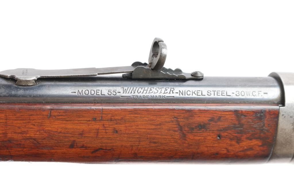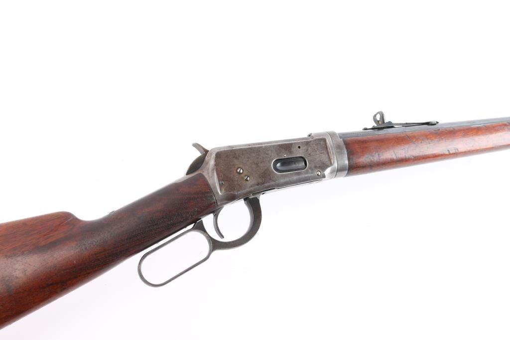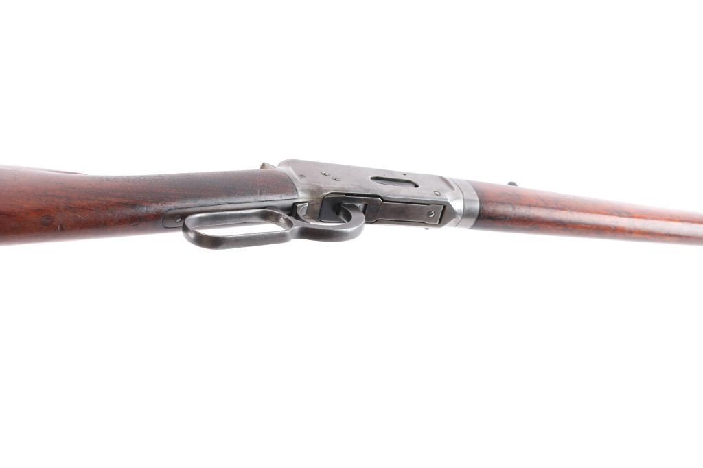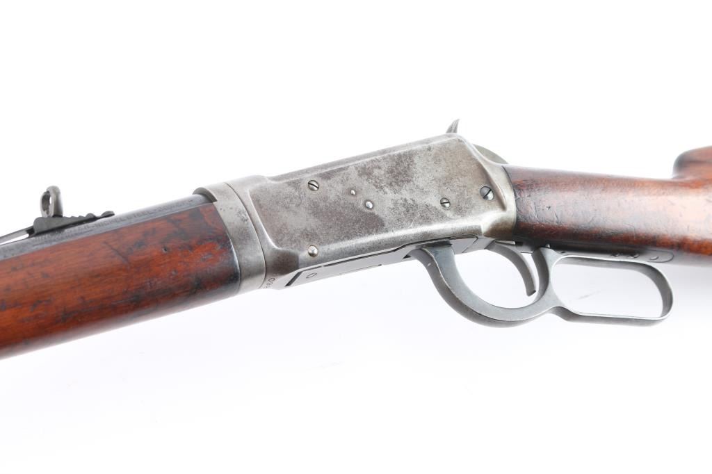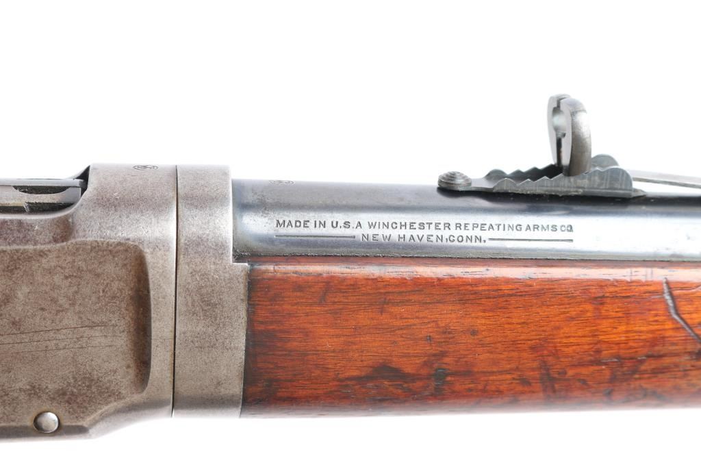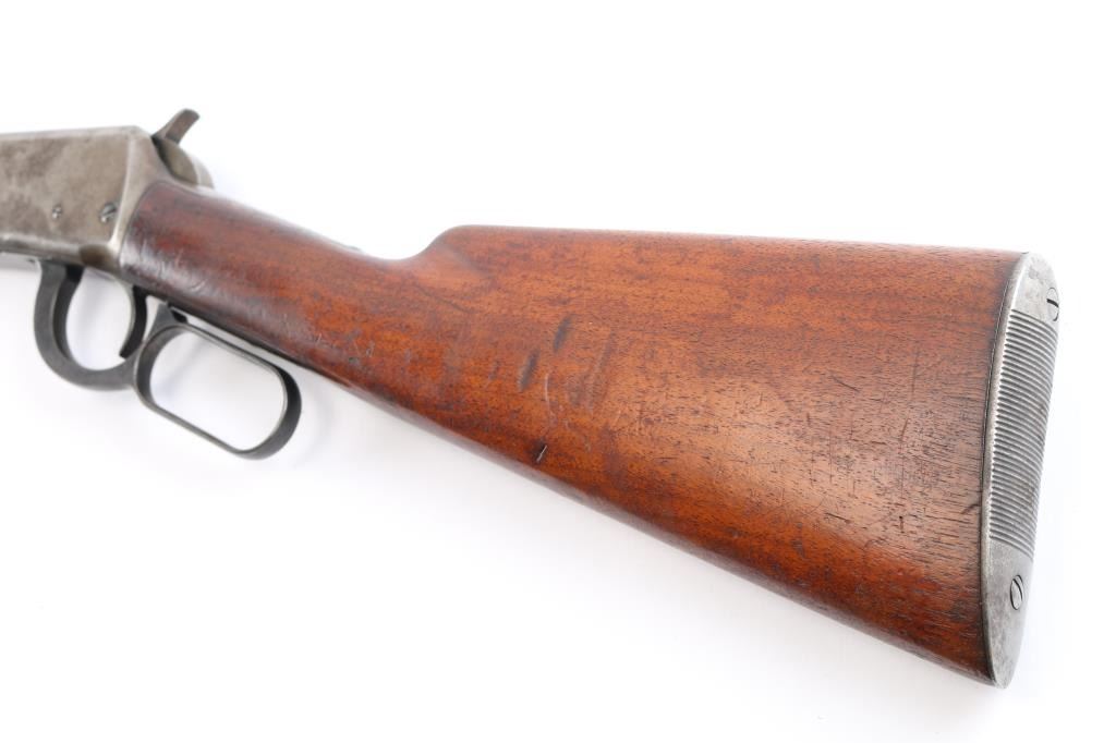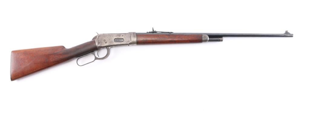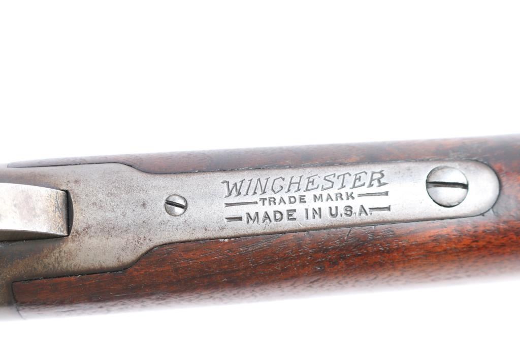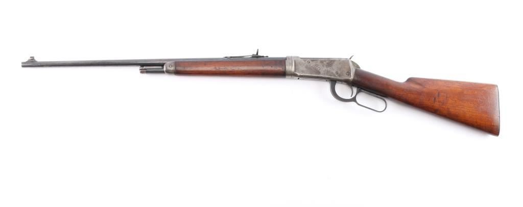 'Take-Down' rifle manufactured circa 1925. Features 24" tapered barrel, 2/3 length magazine tube, take down lever at magazine cap, buckhorn sights, dovetailed post/bead front sight, straight grip, shotgun butt with grooved steel buttplate. Bore is very good condition, strong rifling. Retains about 50% blued finish mostly on the barrel/lever, handling wear on the receiver with many small patches of patina or light pitting on receiver, has a molted gray/brown appearance. Wood is overall good/sound with many small dings/dents, there is a minor chip out the the right forearm where it meets the barrel, good fit to metal. Action operates smoothly. Markings are crisp.