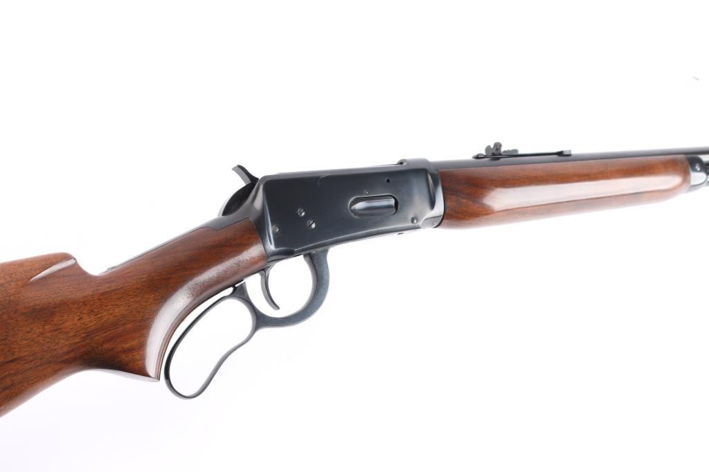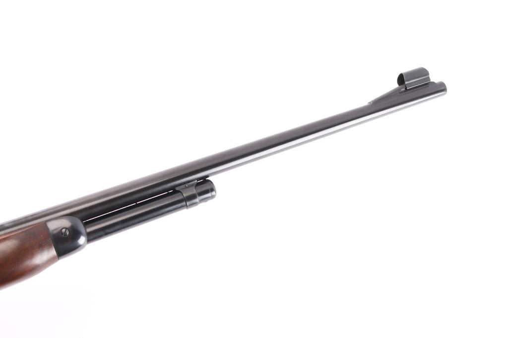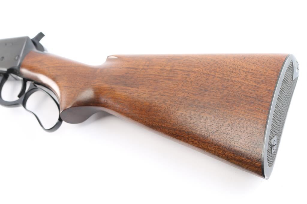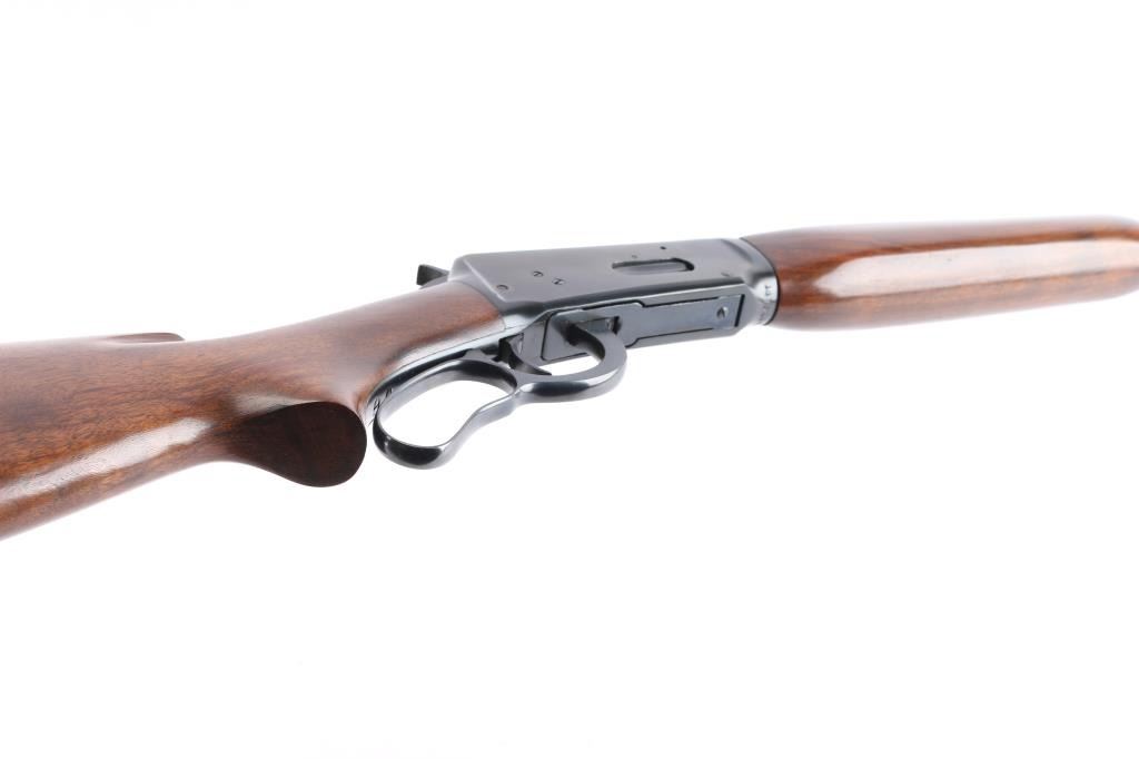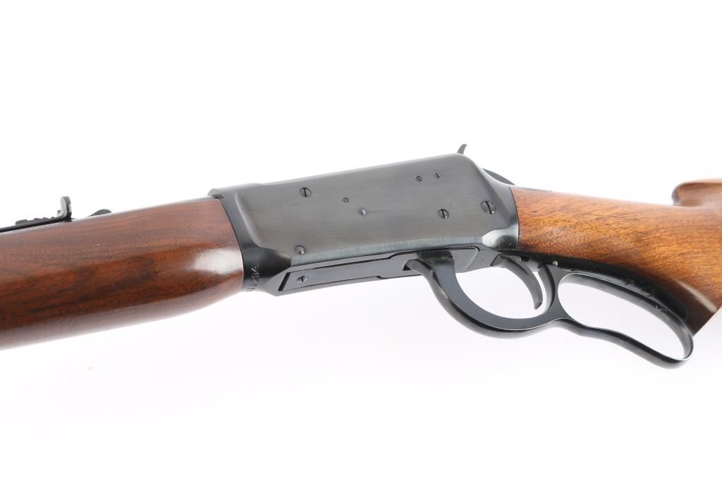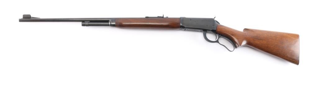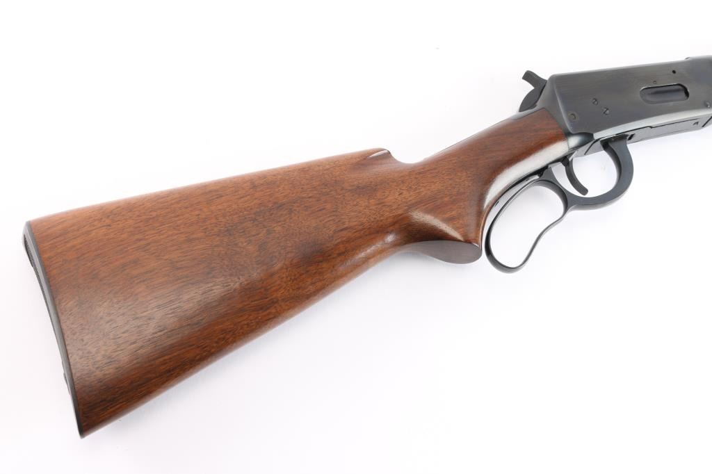 Vintage Winchester lever-action manufactured in 1951. Standard Winchester markings including the factory proof on top of the barrel and receiver. Equipped with a blade/bead front sight mounted on a ramp with a removable hood and a Winchester 22G sporting rear sight. Two thirds tubular type magazine with 5 cartridge capacity. Smooth American walnut pistol grip stock, and forearm and a checkered steel buttplate. 24" round barrel. Bore is excellent/bright, action is crisp/smooth, original blue finish is about 97% with very minor edge wear/scratches, wood is excellent.