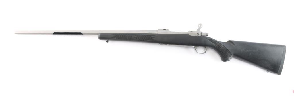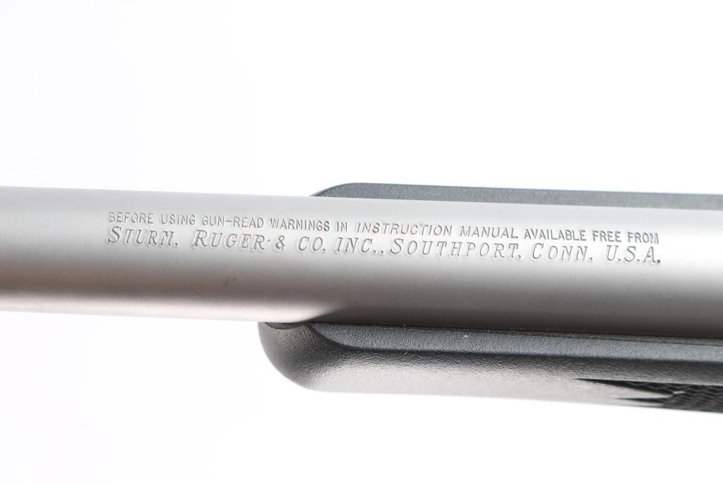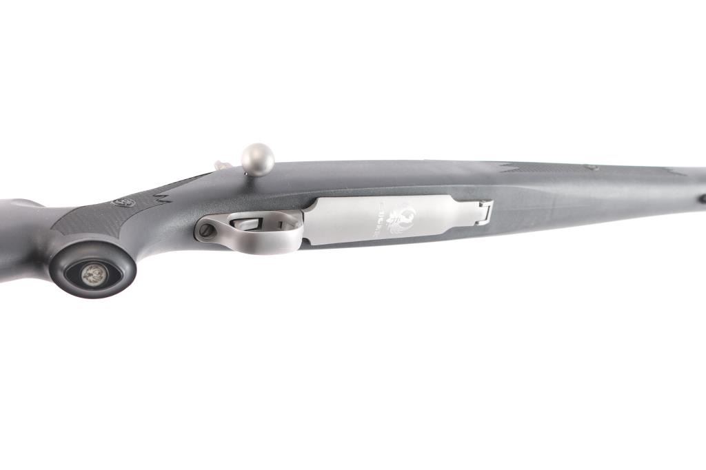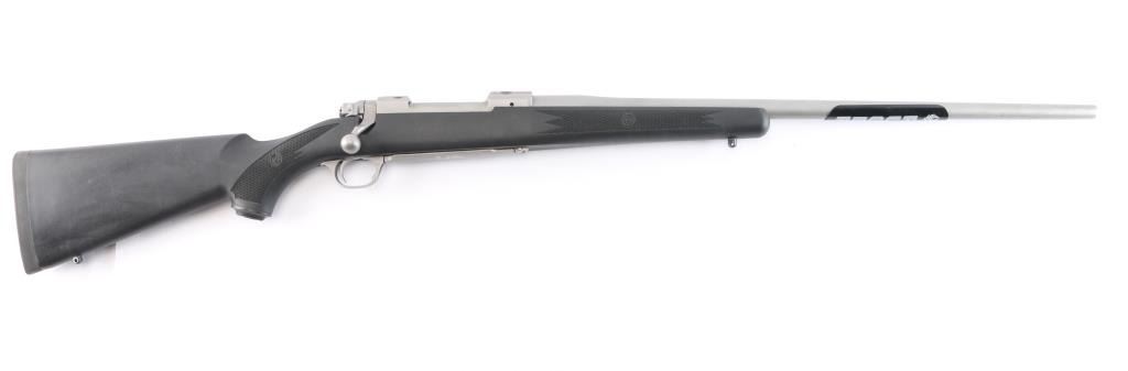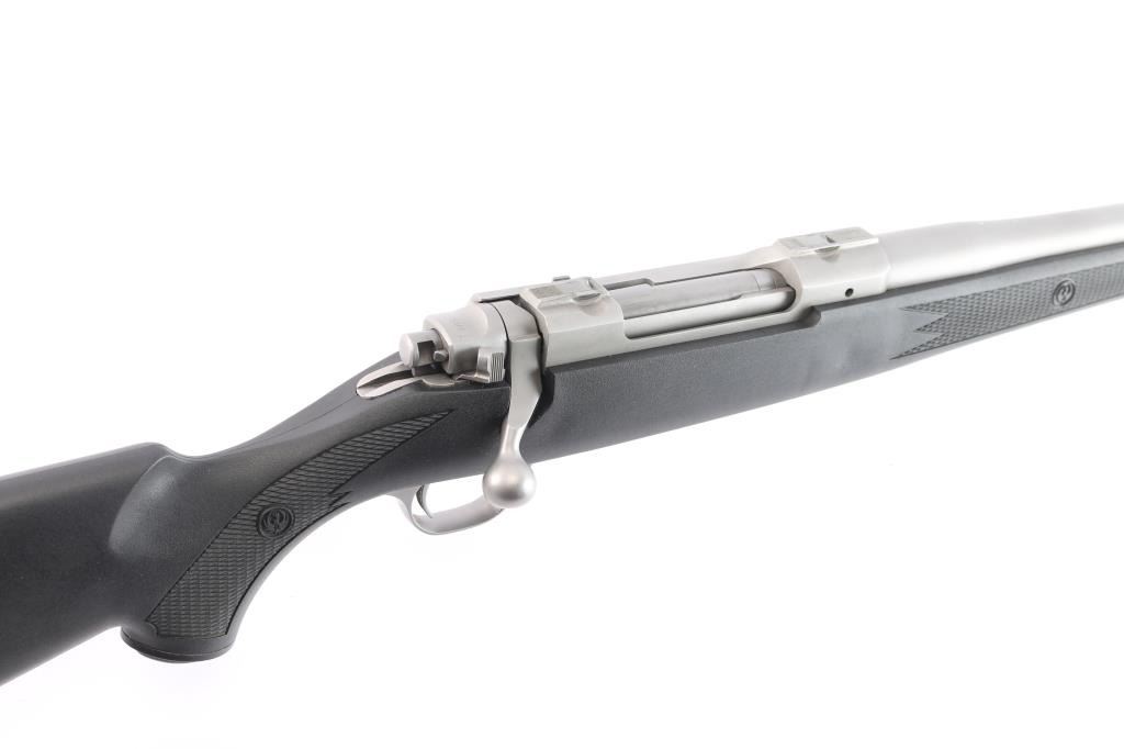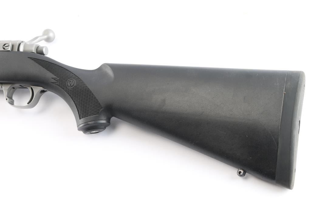 Bolt action rifle features stainless steel construction, black polymer stock with checkered panels at forend & curved wrist (embossed with Ruger emblems), no cheekpiece, thin solid rubber factory recoil pad, sling studs, 24" tapered barrel, no provisions for sights, scalloped dovetails on receiver for scope mounting, hinged floorplate, side swing safety at right rear of action. Bore is excellent/bright. Matte finished stainless is overall very good with some scuffs on the barrel. Polymer is excellent condition.