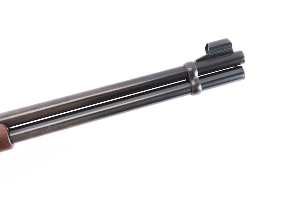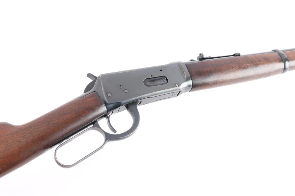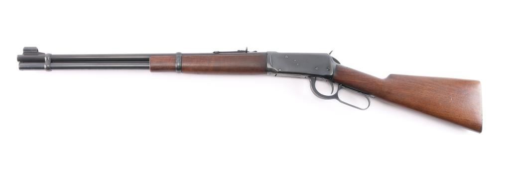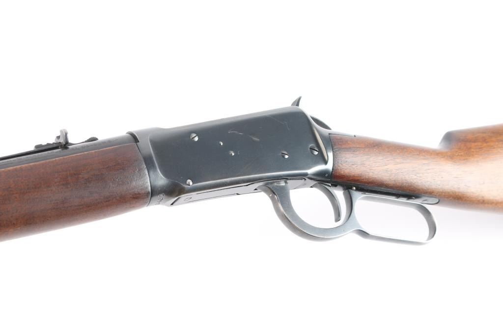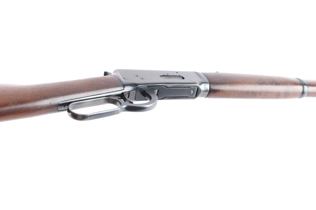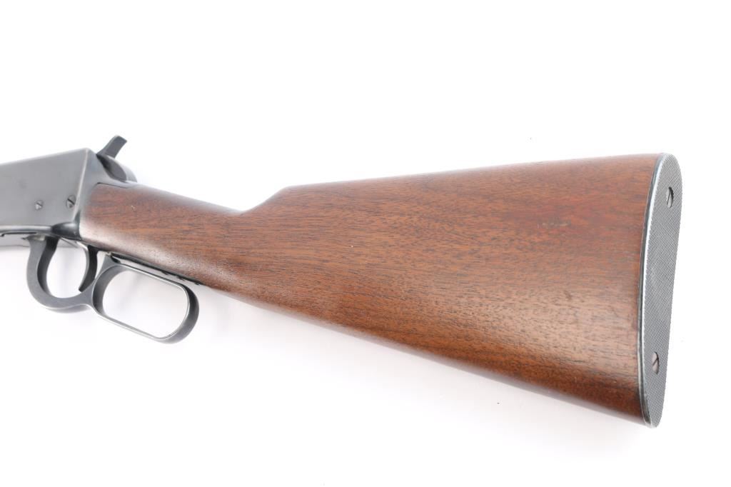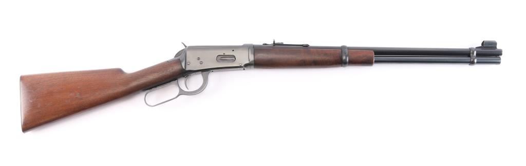 Pre-64 Eastern Carbine' Vintage lever action repeating rifle chambered in .32 Winchester Special, manufactured in New Haven, CT circa 1943-48. (No Records) Features a blued finish, 20" tapered barrel, full-length tube magazine, hooded ramped blade/bead front sight, adjustable sporting rear sight, smooth trigger, serrated hammer spur, steel receiver, two barrel bands, smooth walnut forend and straight grip shoulder stock with knurled metal buttplate. Bore is excellent/bright. Retains 96% original blue finish with minor edge wear, scratches. Wood is near excellent with minor scratches/dings, action is smooth. Winchester markings are crisp/clear.