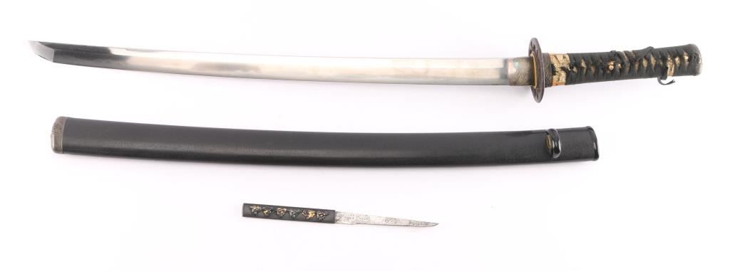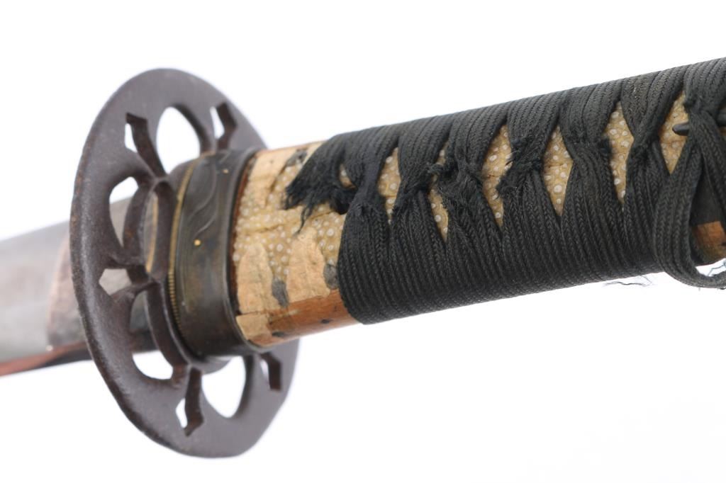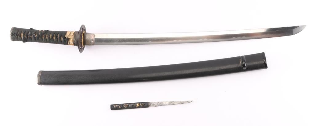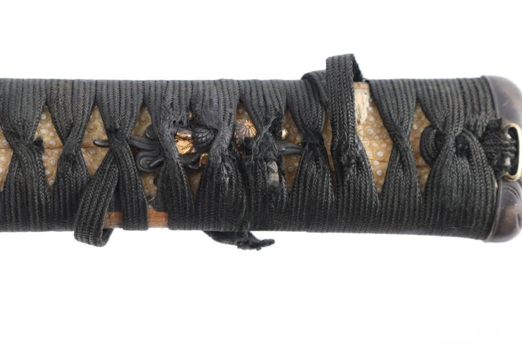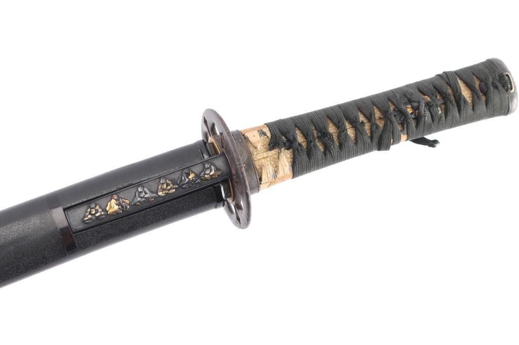 We believe mid-late Edo period. The top of the Kashira (pommel), Fuchi (collar) and the scabbard Kojiri (end cap) all feature an intricate depiction of a storm at sea with powerful waves, drawing heavily from Shinto beliefs and a profound connection to the ocean. The Kashira and Fuchi have small gold inlays. These motifs often embody concepts of strength, resilience, change, and the unpredictable nature of life. 21 3/4" blade with wavy tempered line. The blade’s Nakago (tang) has two Mekugi-Ana (peg holes) indicating some age as it has clearly been mounted two separate times in the past. The Gokatana (blade of the Kozuka) is signed but the wakizashi itself is not. Ray skin hilt with black cloth wrapping, the Menuki appear to be a floral design with gold inlayed flowers/leaves. (Hard to see with the wrap) Circle-shaped iron Tsuba with Kozuka and Kougai holes with two spacers. Black lacquered wood scabbard with Kozuka ( utility/paper knife). It's rectangular handle depicts six Sumo wrestlers with gold inlay. Blade is near excellent with some minor scratches, scabbard is excellent. there is some tears with some loss to the cloth wrapping. Missing peg.