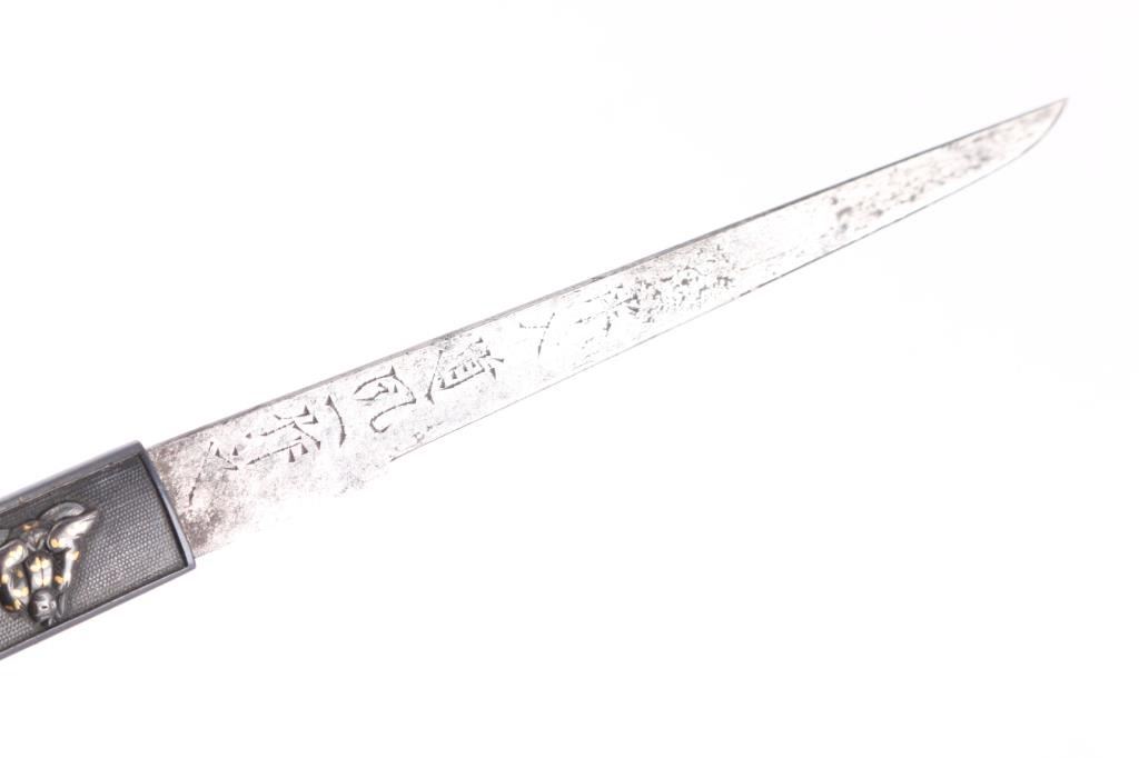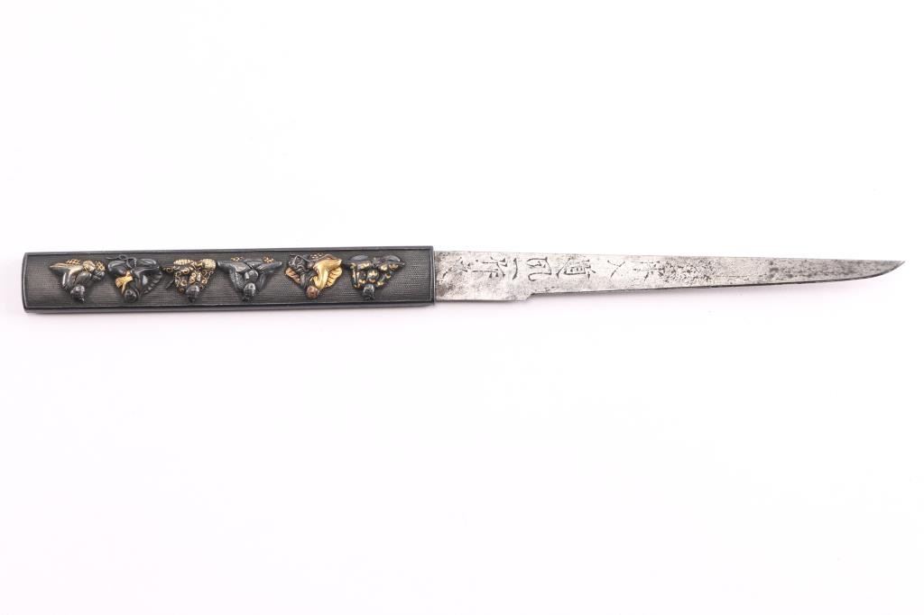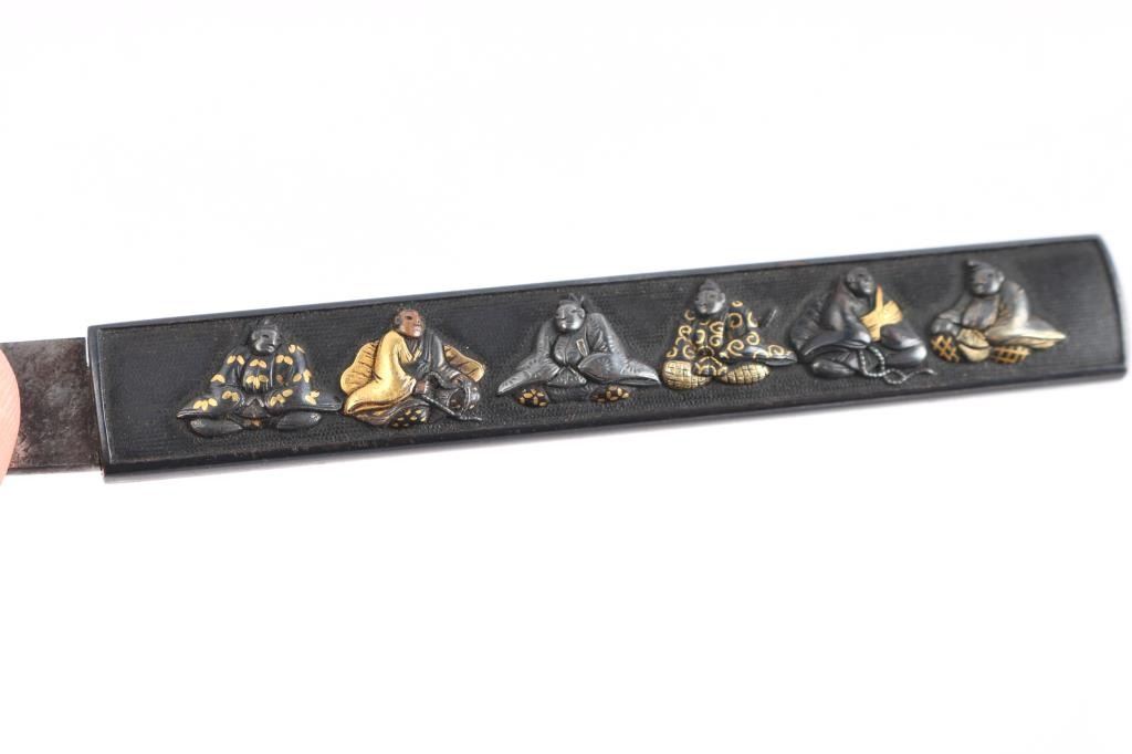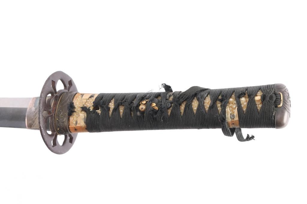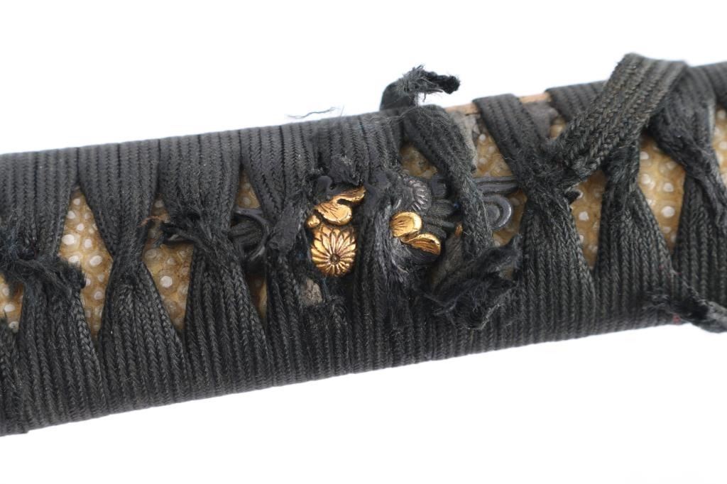 We believe mid-late Edo period. The top of the Kashira (pommel), Fuchi (collar) and the scabbard Kojiri (end cap) all feature an intricate depiction of a storm at sea with powerful waves, drawing heavily from Shinto beliefs and a profound connection to the ocean. The Kashira and Fuchi have small gold inlays. These motifs often embody concepts of strength, resilience, change, and the unpredictable nature of life. 21 3/4" blade with wavy tempered line. The blade’s Nakago (tang) has two Mekugi-Ana (peg holes) indicating some age as it has clearly been mounted two separate times in the past. The Gokatana (blade of the Kozuka) is signed but the wakizashi itself is not. Ray skin hilt with black cloth wrapping, the Menuki appear to be a floral design with gold inlayed flowers/leaves. (Hard to see with the wrap) Circle-shaped iron Tsuba with Kozuka and Kougai holes with two spacers. Black lacquered wood scabbard with Kozuka ( utility/paper knife). It's rectangular handle depicts six Sumo wrestlers with gold inlay. Blade is near excellent with some minor scratches, scabbard is excellent. there is some tears with some loss to the cloth wrapping. Missing peg.