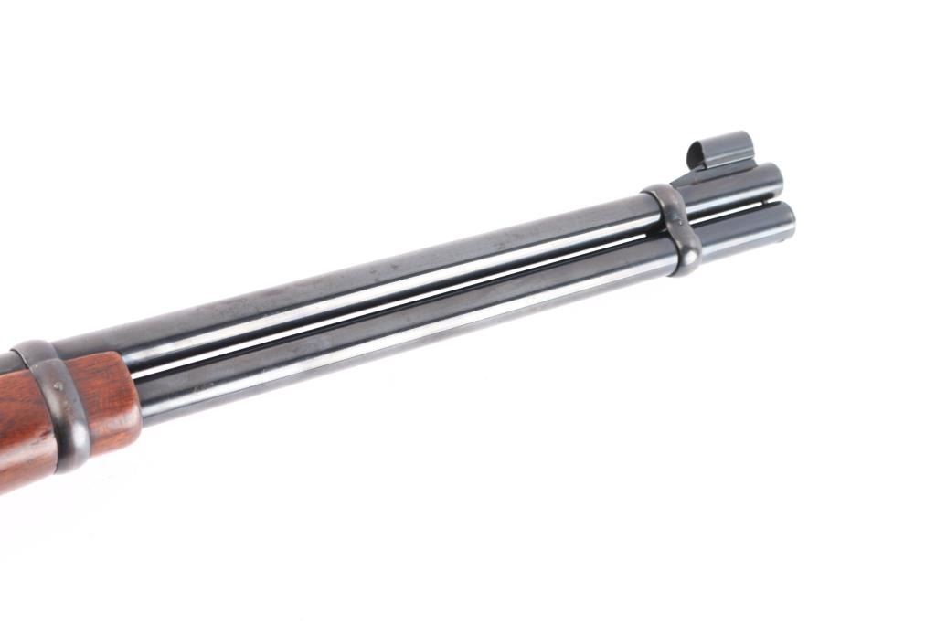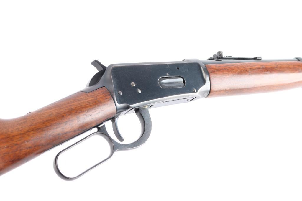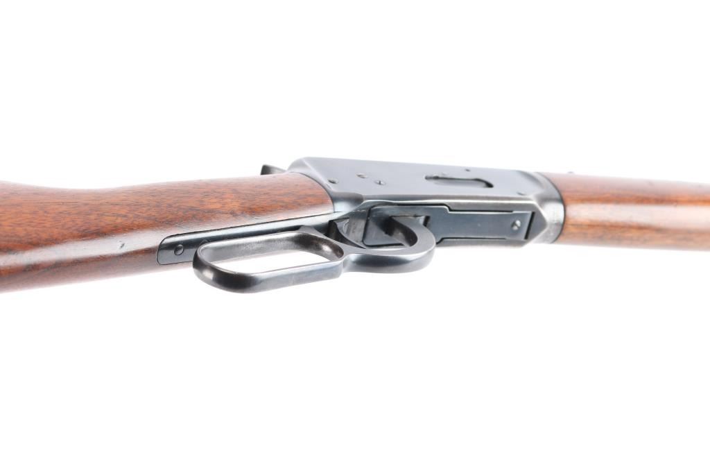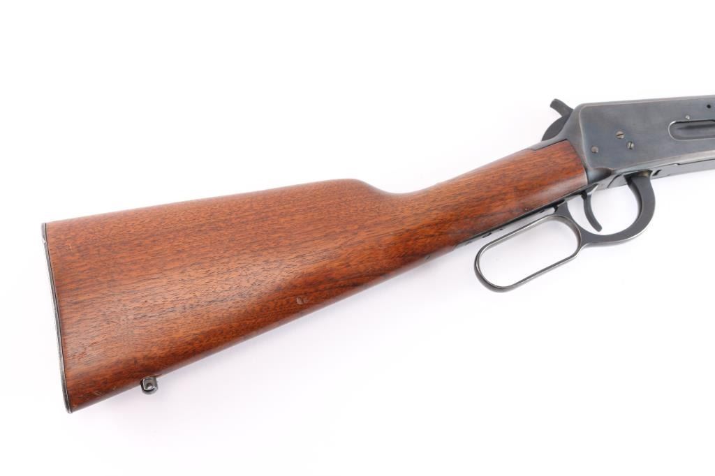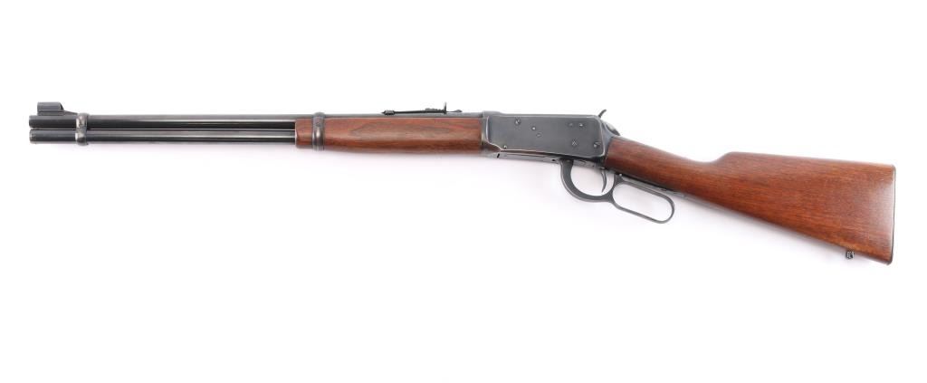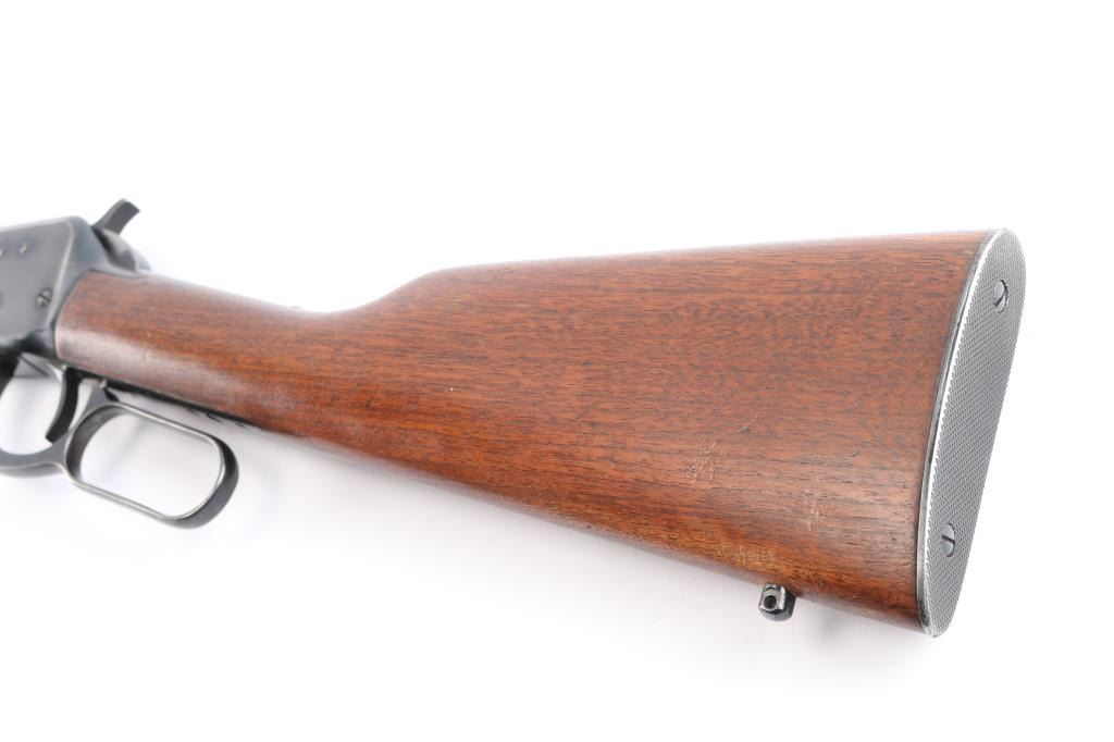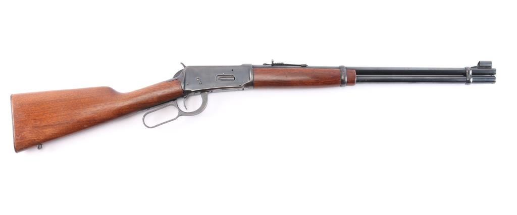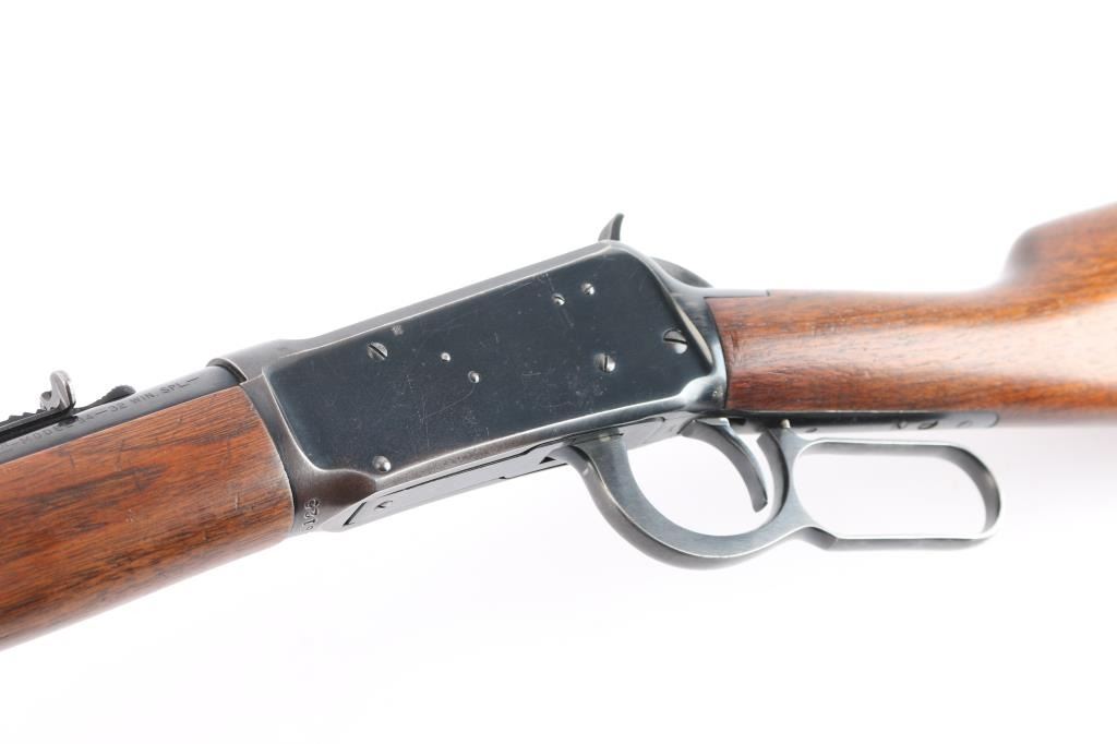 Pre-64 Eastern Carbine' Vintage lever action repeating rifle chambered in .32 Winchester Special, manufactured in New Haven, CT circa 1955. Features a blued finish, 20" tapered barrel, full-length tube magazine, hooded ramped blade/bead front sight, adjustable sporting rear sight, smooth trigger, serrated hammer spur, steel receiver, two barrel bands, smooth walnut forend and straight grip shoulder stock with knurled steel buttplate, rear sling swivel stud. Bore is excellent/bright. Retains 90% original blue finish with minor handling/edge wear, minor scratches. Wood is near excellent with some very minor scratches/dings. Action is smooth. Winchester markings are crisp/clear.