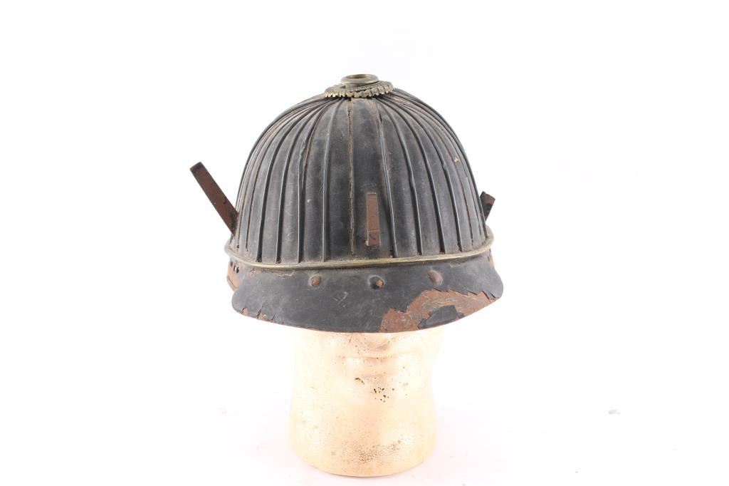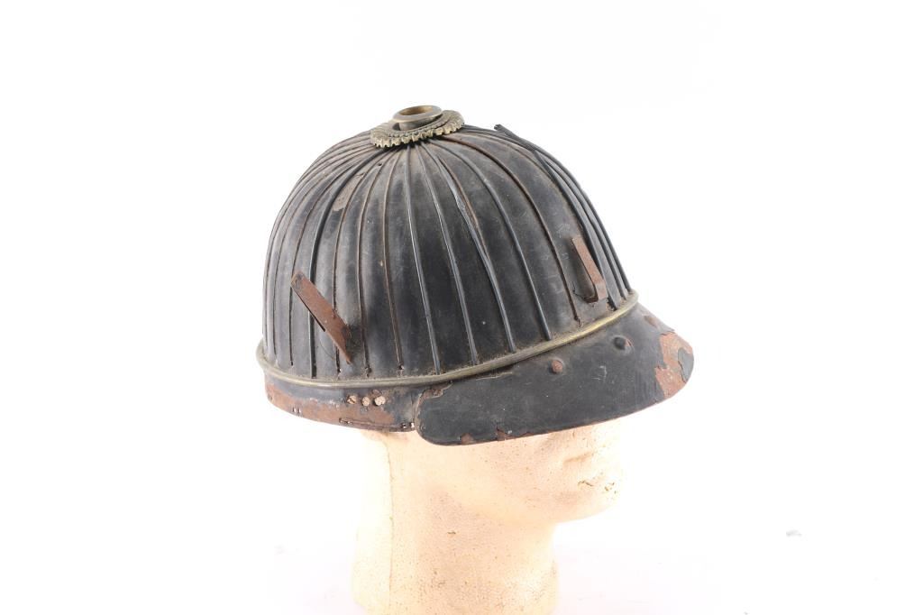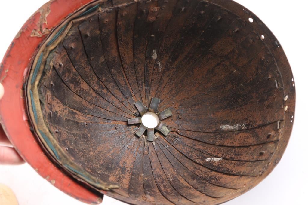 36 plate black lacquered Tetsu (Iron) Suji Bachi helmet, raised ribs where plates join, each plate is connected with five hammered rivets, overall shape is known as akoda-nari due to its resemblance to the akoda, a squash-like fruit. The Tehen (Central top piece) is 4 layered, and the Mabisashi (Visor) has three large rivets, and the traditional red lacquer on the underside (Chipped). Has Wakidate-No-Tsunomoto, side crest holders. (The left one is broken) Has the Haraidate, fore crest holder. No liner, or Shikoro (neck protector). This type of ridged helmet was worn by upper-class samurai beginning in the Muromachi period (1392–1573).