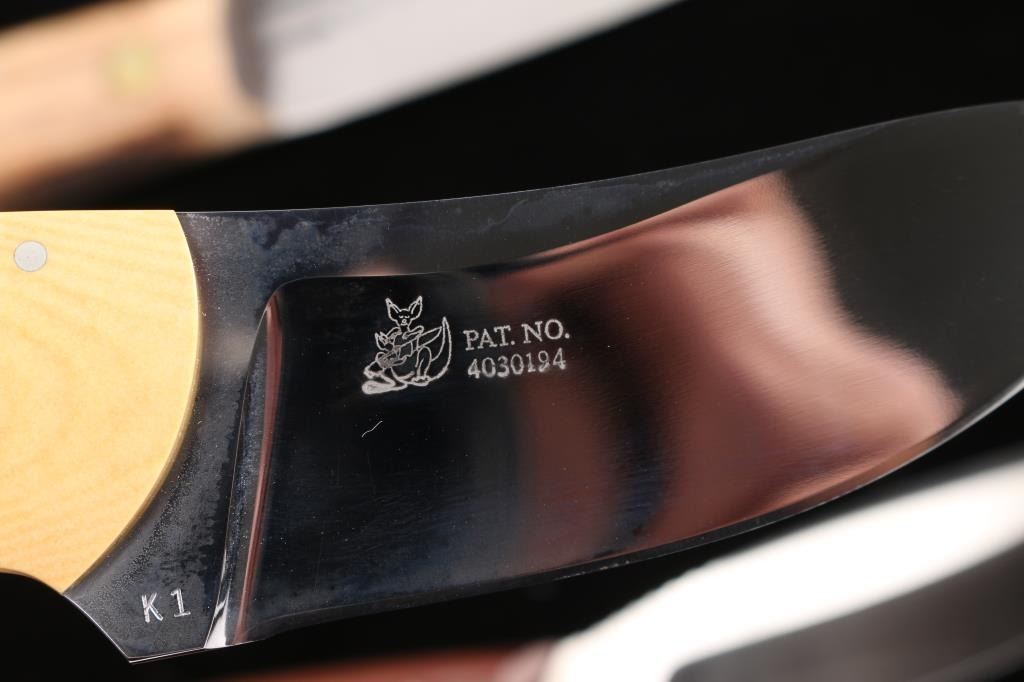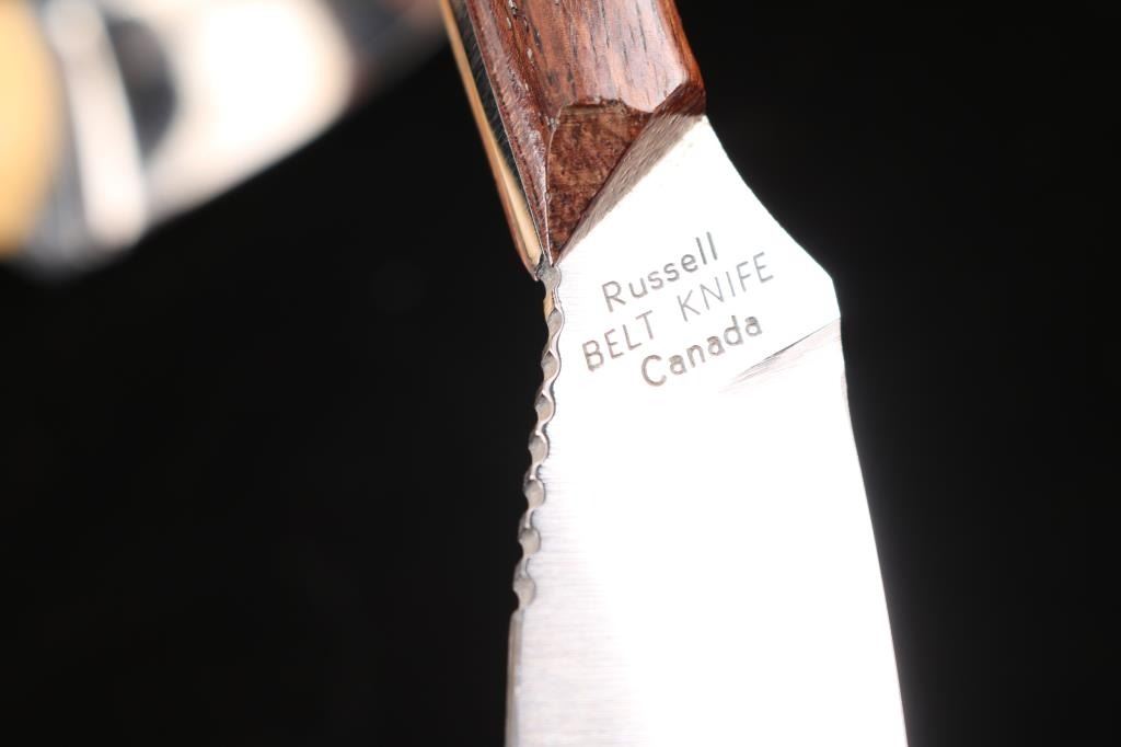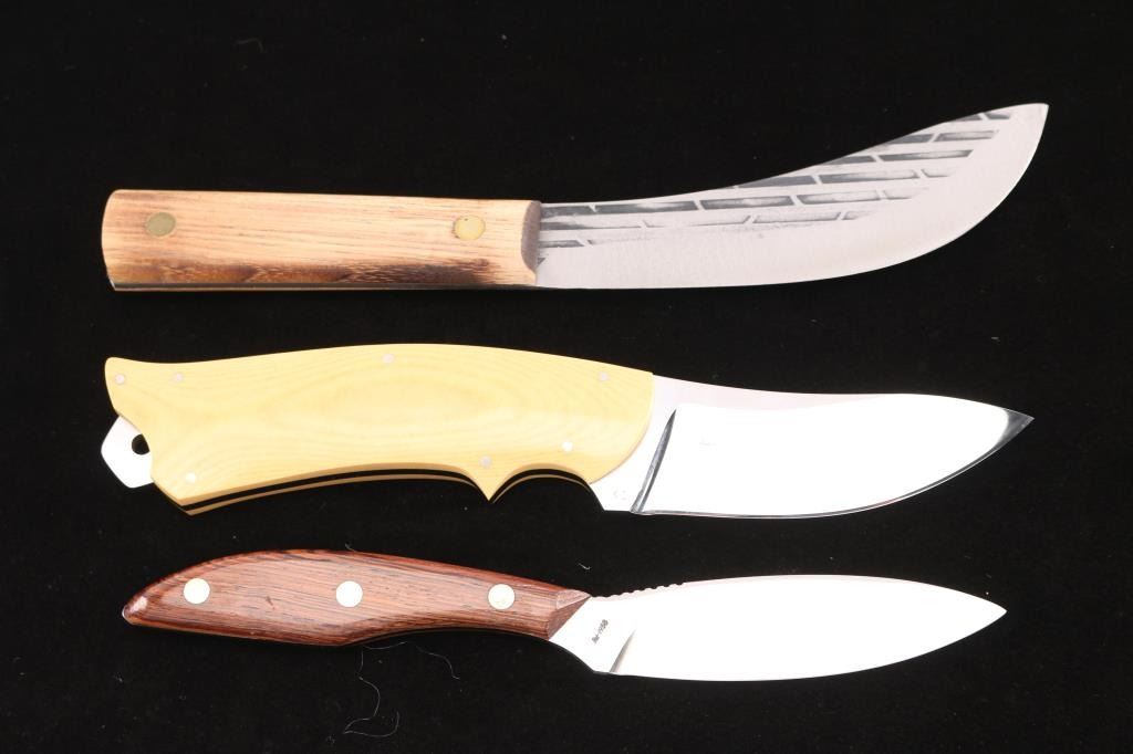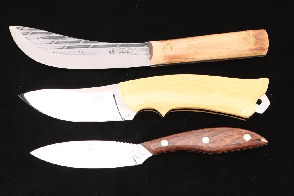 Including: a Hendricks, measuring 9" total and 3 1/2" blade with a blonde wood handle; a Russell belt knife, measuring 8 1/2" total and 4" blade with a wood handle; and a Deep River knife measuring 9 1/2" total and 5" blade.