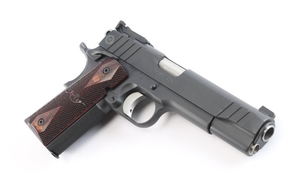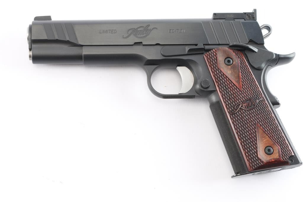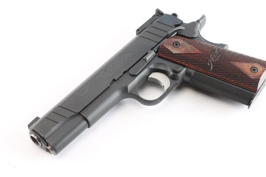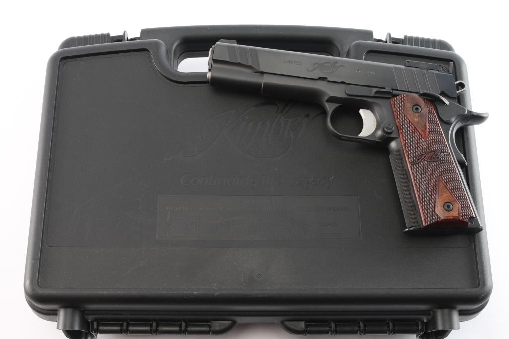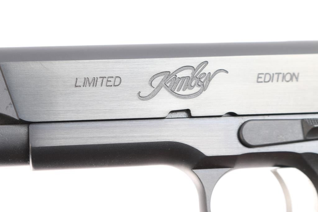 .45 ACP Kimber Target Match, released in a limited-editions of 1,000 guns beginning in 2006. hese pistols have a special consecutive serial number range (KTM0001 to KTM1000, this one is KTM0827). tThe front strap and under the trigger guard are checkered to 30 LPI and the main spring housing is 20 LPI. Pistol is fitted with extended lever safety and an ambi safety and a grip safety with memory bump. The grips are beautifully checker rosewood with burl wood inlaid into the grip diamonds. Also fitted with a fully adjustable rear target sight. Slide has fore & aft cocking serrations, serrated adjustable trigger and full length guide rod.. Pistol is in fine condition, retaining 99%+ of original blue finish. The grips are in very fine condition, The bore is excellent/bright and the action functions perfectly. Comes with its original factory hard case, all paper-work, and (1) 8-round magazine.
