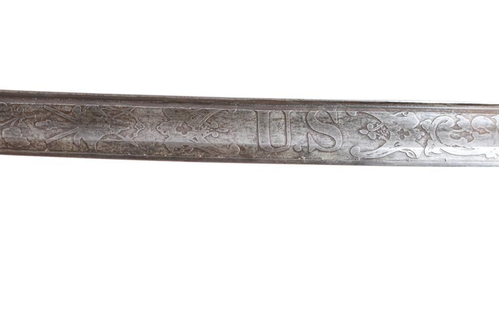 Very good reproduction ornate "Tiffany STYLE" presentation sword. large "US" in the openwork guard,quillon has eagle’s head jutting forward. The grip is silver, twisted with ridges and grooves. The 32 1/2" slightly curved blade is etched with "Tiffany & Co. NY" followed by a series of somewhat geometric floral scrolls followed by "US". The reverse has floral scrolls, followed by American shield, crossed cannons, stand of arms with crossed pikes/rifles with banners. This is followed by another series of geometric floral scrolls turning into a long, leafy vines. No nicks, 16" fuller along the flat. The brass scabbard matches the hilt in having a medium, aged brass patina, floral scrolls, figural ring mounts and screw-fastened, floral scrolled drag. The upper mount incorporates Lady Liberty holding a sword, and American Shield. The middle mount has a bearded charging Union soldier holding a rifle, with pack, bayonet, and "US" marked cartridge box. The inscription, between the ring mounts, with the recipient’s name in Old English and the rest in script: “Presented to / Col. Edward Lyon Bailey / 2nd N.H. Infantry Va. / Men of Co. A..” This is a very good copy sold by "House of Swords" in the 1960'"House of Swords" produced sand retailed as fantasy sword. They were copy's and or fakes resembling high-grade presentation swords. Often they used some real parts to include scabbards, scabbard mounts and blades. .