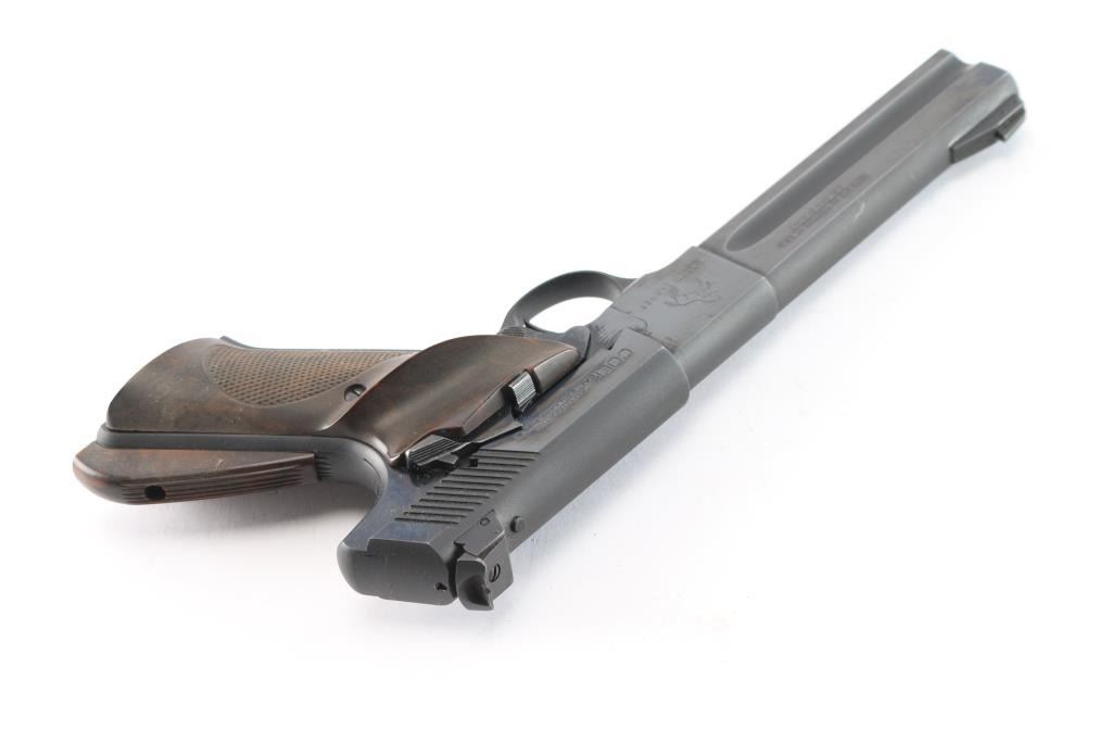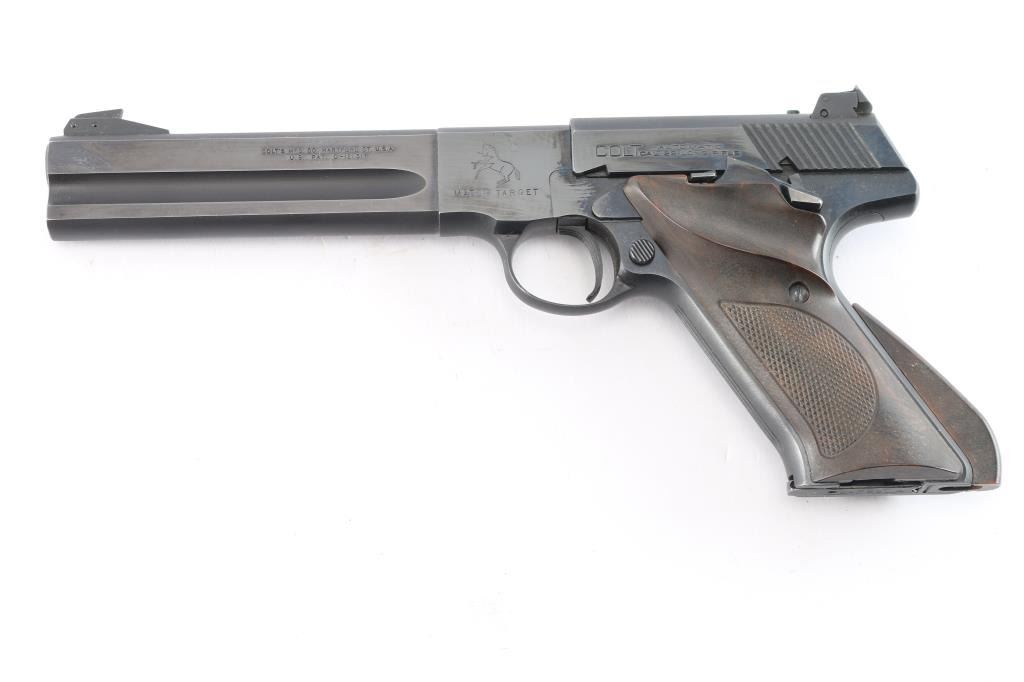 Semiautomatic rimfire pistol manufactured circa 1951, second series match target Woodsman. Features blued finish, checkered 'Coltwood' grips with thumbrest on the left panel, Rampant Colt on the right panel with factory palm swell grip adapter installed on the backstrap. 6" lug barrel, pinned Partridge front & 'Coltmaster' adjustable rear sights, push button magazine release, manual safety. Smooth trigger, serrated fore & backstraps. Bore is pristine. Retains 98% original blue finish with slight edge wear. Grips are excellent condition. Markings include "MATCH TARGET" under Rampant Colt. Markings are crisp and even. Colt marked magazine. Has seen very little use.