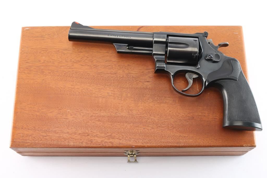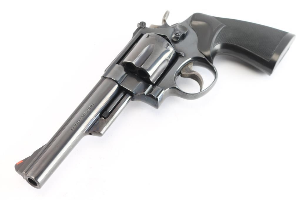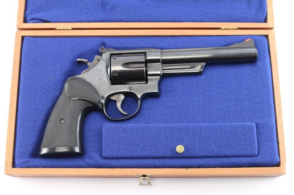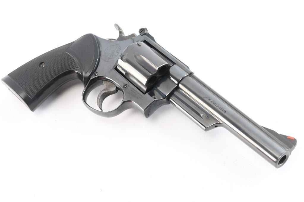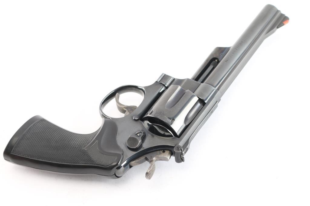 Large frame double-action 6 shot revolver chambered for .44 Magnum ammunition. Features a blued finish, 6" barrel with a raised serrated ramp front sight with a red insert on a serrated full barrel rib and a micrometer adjustable white square notch rear sight, case colored .400" wide serrated target trigger, case colored .500" wide checkered spur target hammer, checkered black rubber Pachmayr Presentation grips. Bore is excellent with strong rifling. Action is smooth with tight lock-up. Retains 95% finish with slight edge wear and a noticeable cylinder drag line. Grips are excellent. Includes a factory presentation case with custom lining. Condition is NRA very good. *** Modern Firearm ***