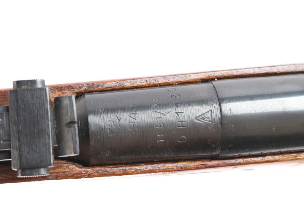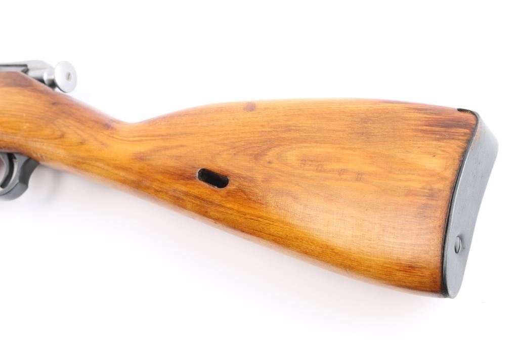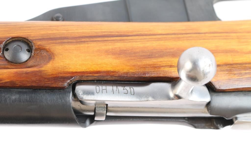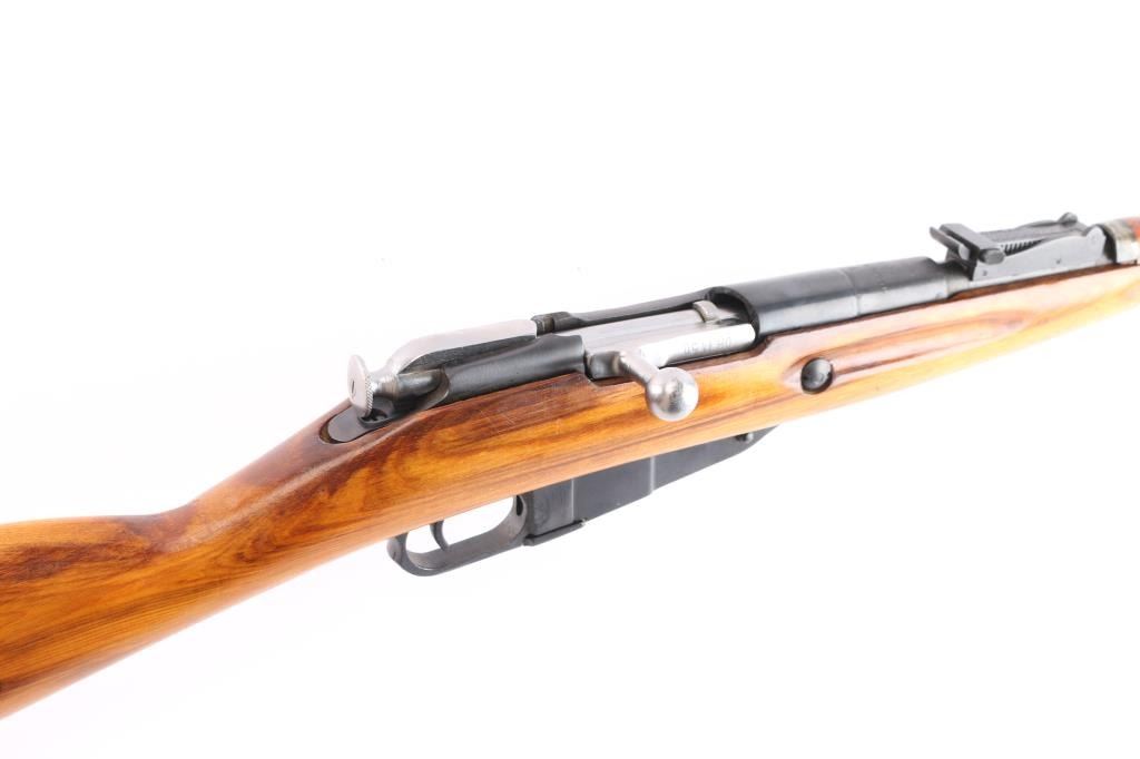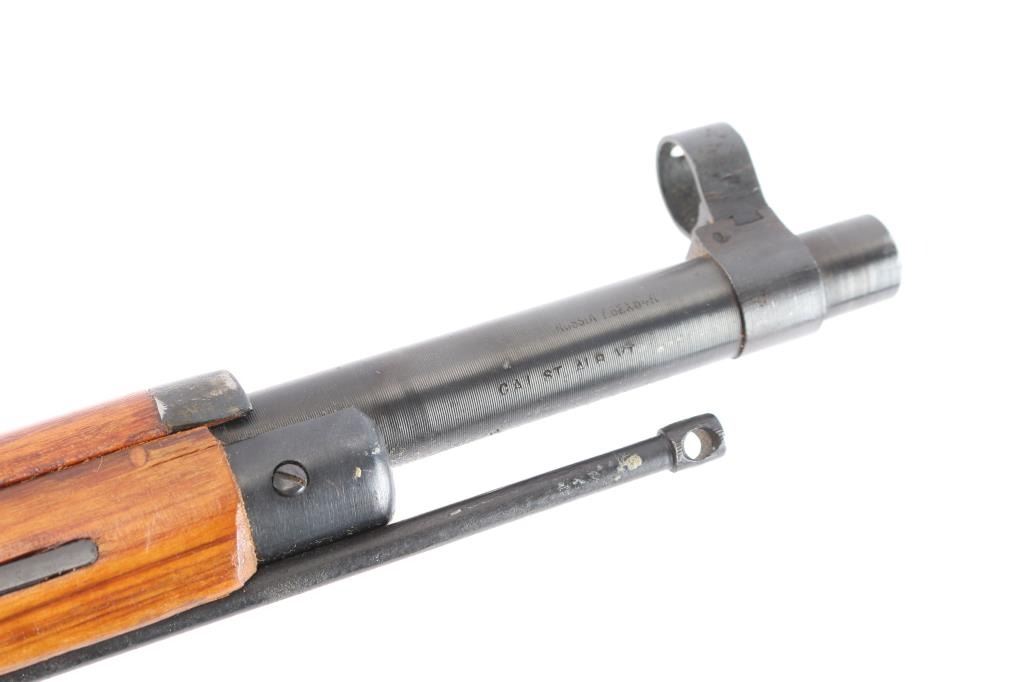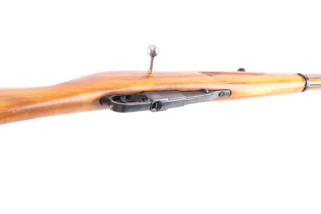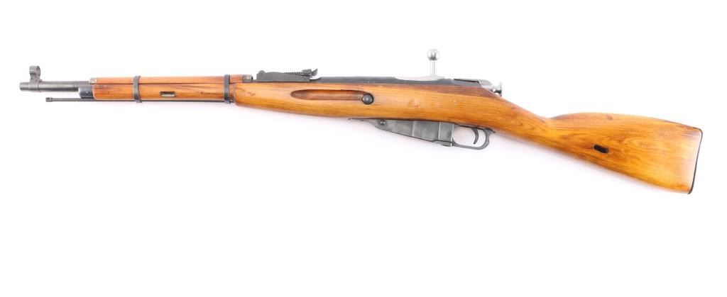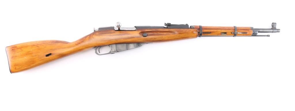Reconditioned WW2 Russian military bolt action service rifle chambered in 7.62x54R, circa 1943. Features a blued finish, Izhevsk marked 20.25" barrel, hooded adjustasble post front sight, graduated rear sight to 1,000 meters, cleaning rod, two barrel bands, 5 round fixed magazine, straight bolt handle, smooth wood handguard and straight grip shoulder stock with metal buttplate. Matching serial numbers on barrel, receiver, floorplate, steel butt plate, & bolt. CAI import marks on barrel. Rifle retains approximately 98% of it's blued finish. Action performs well, bore is very good/bright, strong rifling, light frosting in the grooves. and wood stocks are very good.
