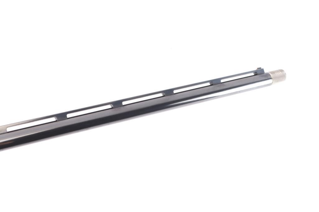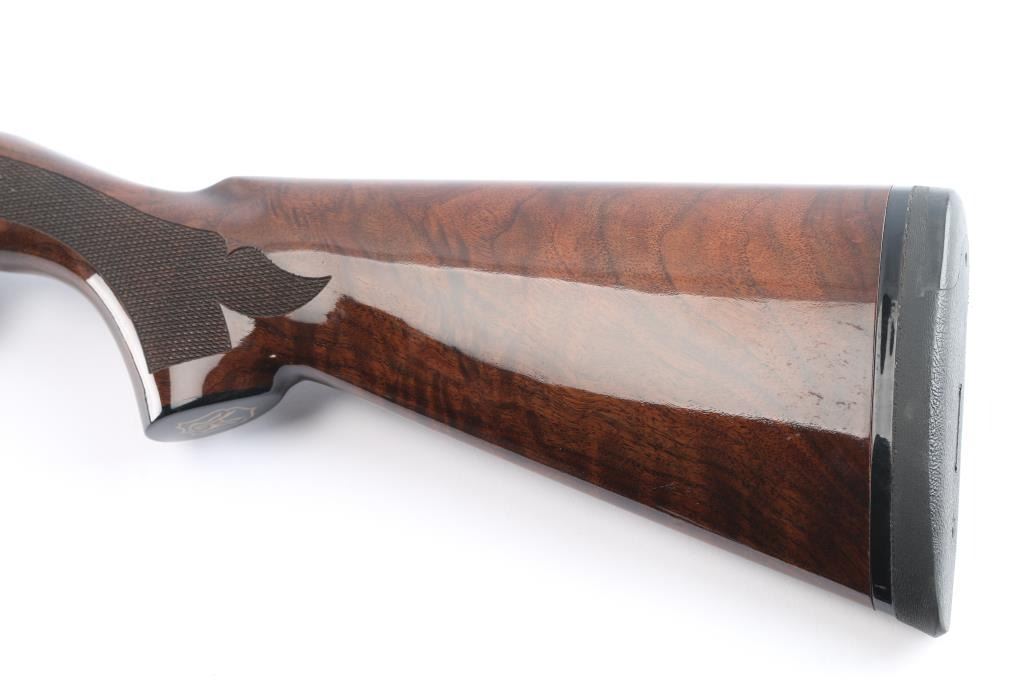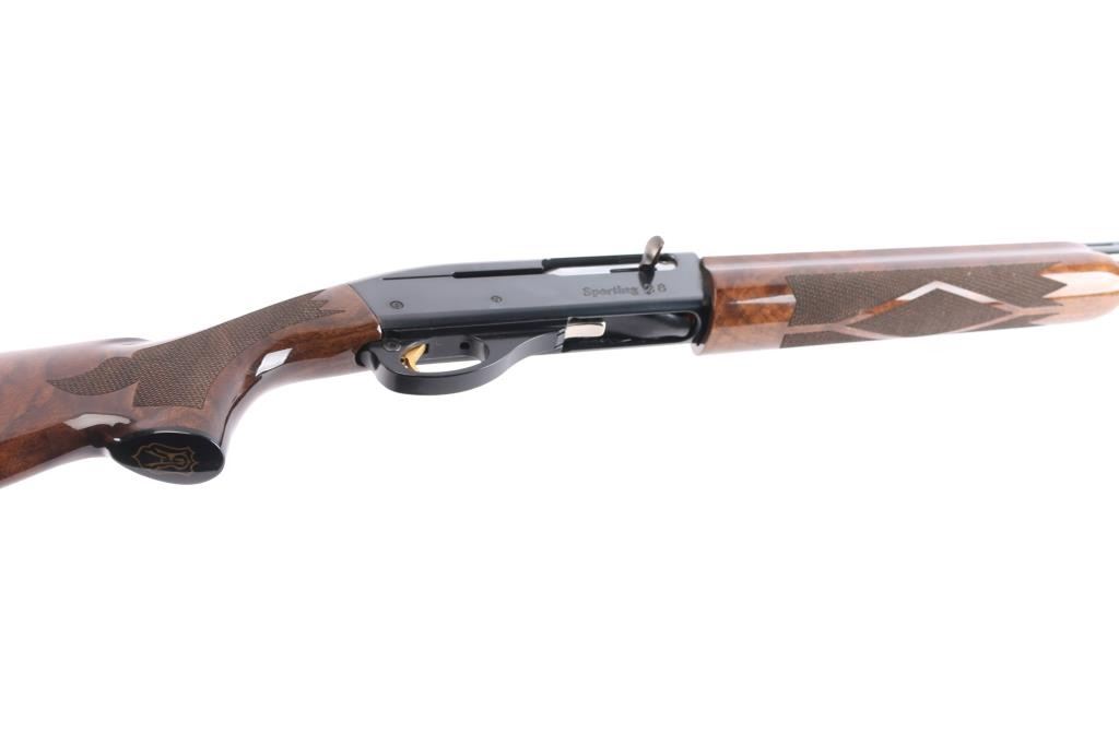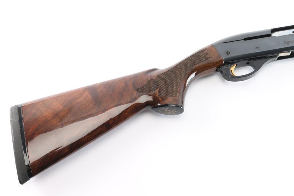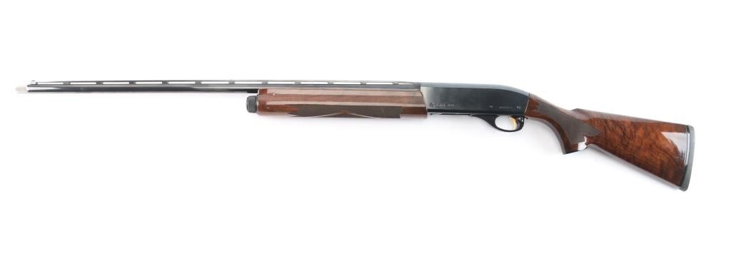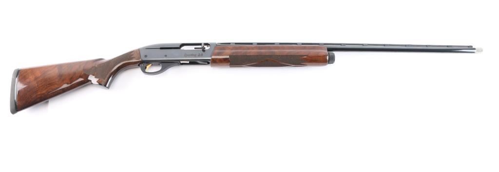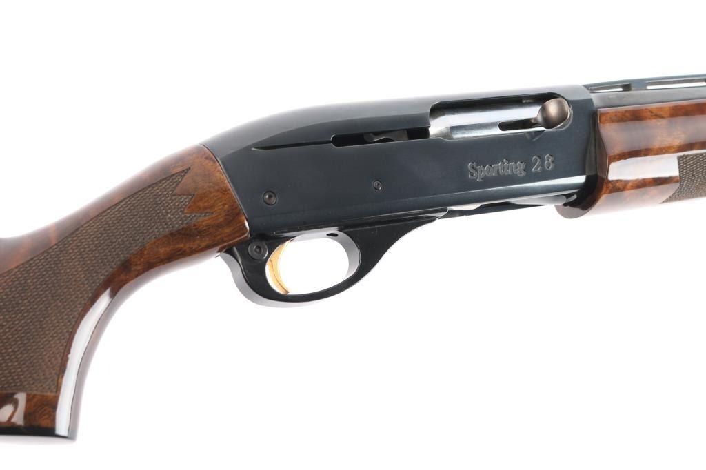 The 'Sporting 28'. Semiautomatic shotgun accepts 2-3/4" shells and Remington chokes (Mod installed). Features 27" 1/2 vent rib barrel, Bradley style white bead front sight, steel mid bead, push button safety, gold toned serrated trigger, blued finish, high gloss walnut butt stock & forend with checkering at wrist and forend, solid rubber recoil pad, black plastic "RA"grip cap. LOP is 13 3/4". Bore is excellent/bright. Retains about 98% finish with minor scratches on receiver. Wood is excellent. Action is smooth.
