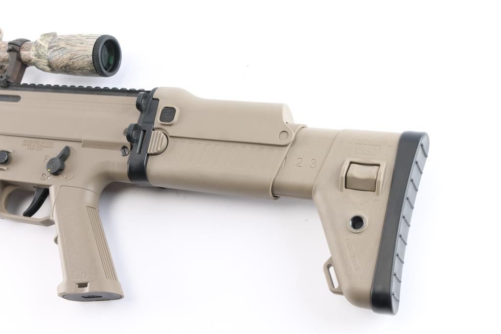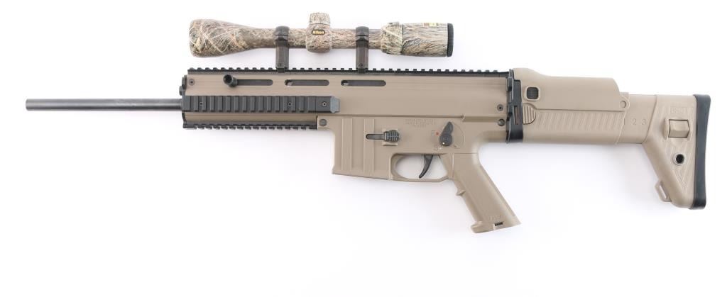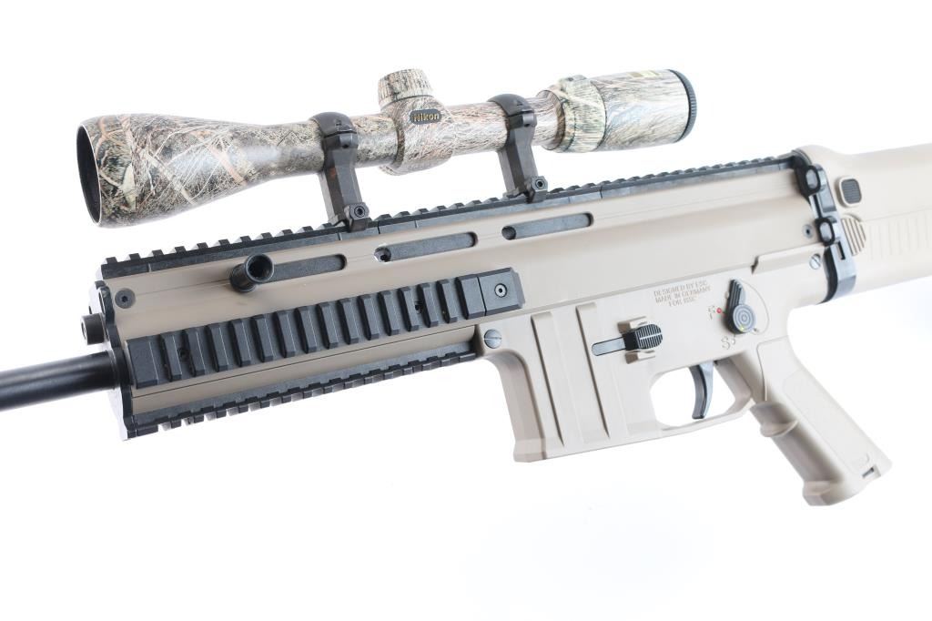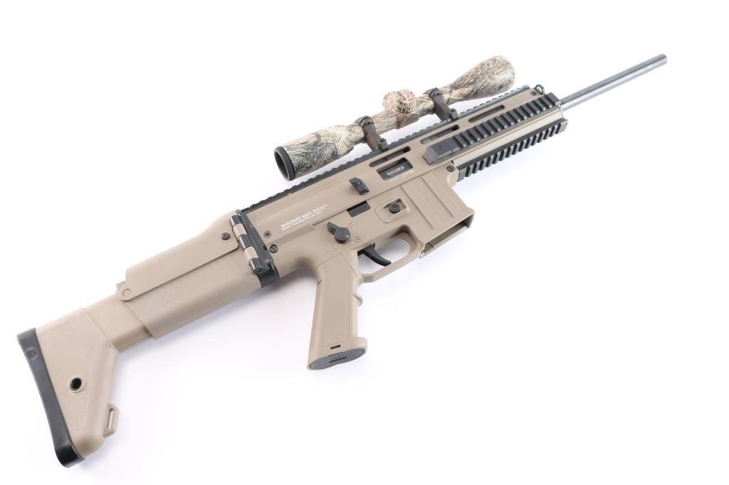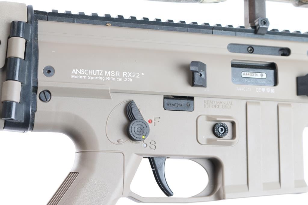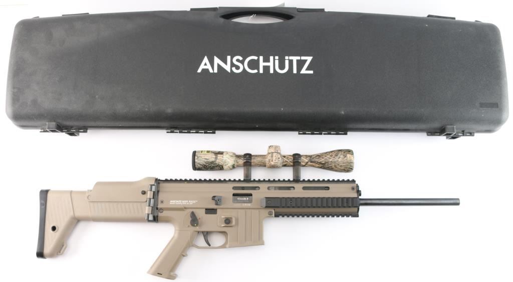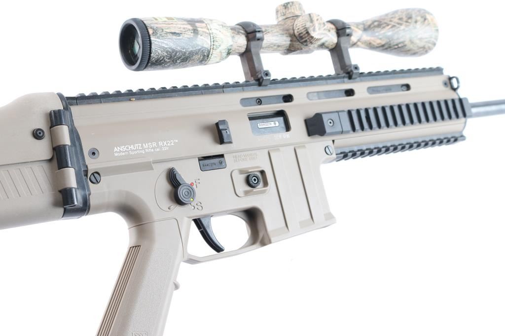 Anschutz semi-automatic precision rifle chambered in .22 LR. The MSR RX 22 is a joint development by three German companies: Anschutz, GSG and ESC Ulm. Made in a SCAR configuration, a force-locking blowback action with a hammer lock, Anschutz sports barrel, high-quality trigger system, single-stage adjustable target trigger 3.3-5.5 lbs. Desert tan finish, 16" blued barrel, ambidextrous thumb safety, shell deflector, quad rail handguard, right folding stock with adjustable length and comb. Mounted with a Nikon 3-9X40 scope, Realtree camo, BDC reticle, clear optics. Bore is excellent/bright, overall condition is excellent. Comes in the original factory hard case with factory sights, owners manual. No Magazine.