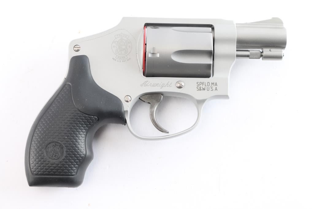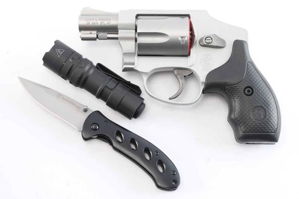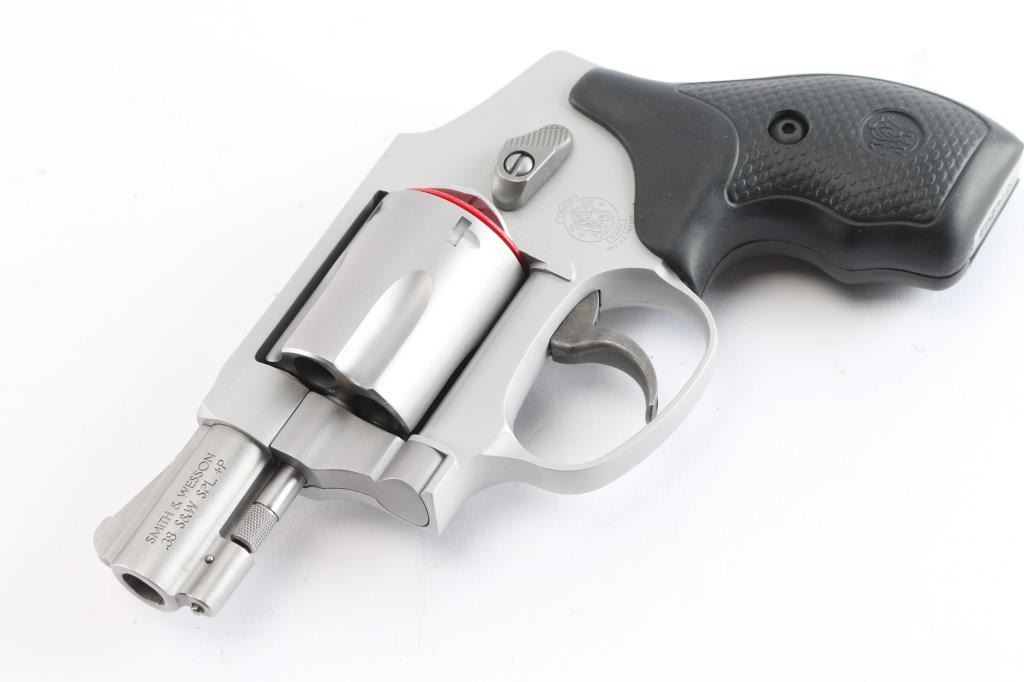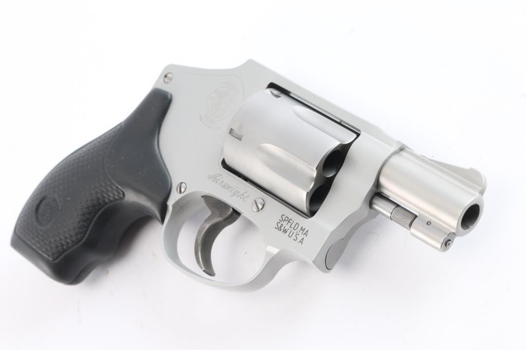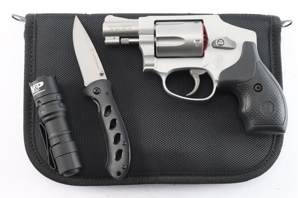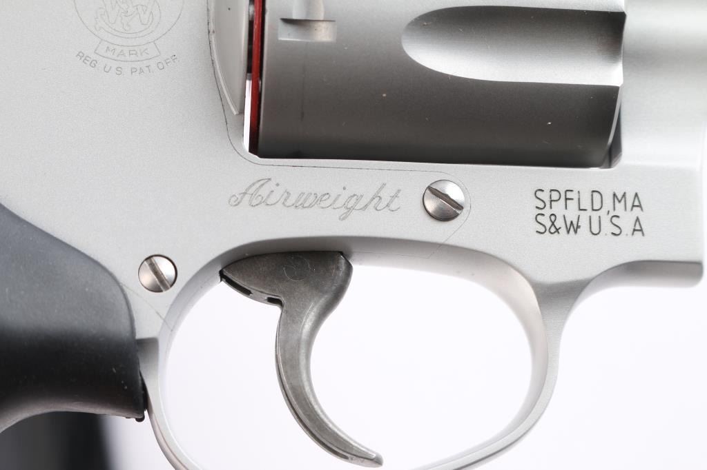 'Centennial Airweight' American made lightweight small frame double-action-only concealed hammer revolver rated for .38 Special +P ammunition. Features a satin matte finished 1 7/8" stainless steel barrel, serrated ramp front sight, integral square notched rear sight, fluted five-shot stainless steel cylinder, non-shrouded ejector rod, case hardened smooth trigger, concealed hammer, clear finished three screw round butt aluminum alloy J frame and a two checkered black rubber grips with S&W insignias. Bore is excellent and lockup tight. Retains approx. 98% finish with little wear. Includes black nylon factory soft case with flashlight and folder/knife, factory cardboard box w/manual. lock and shipping carton. Condition is NRA excellent. ***Modern Firearm***