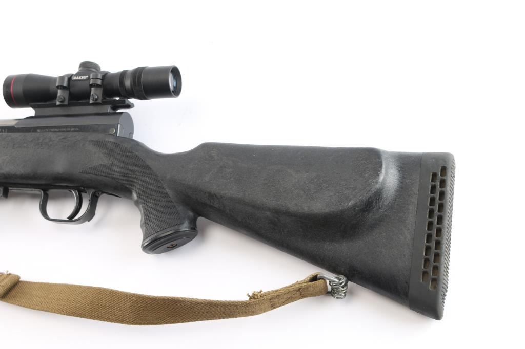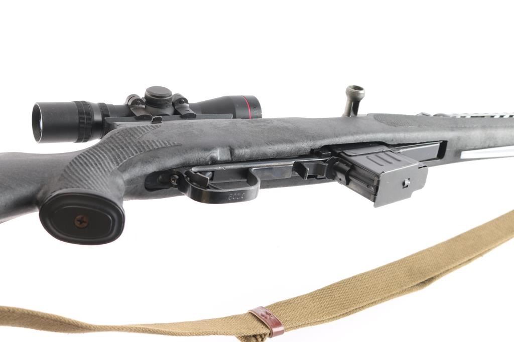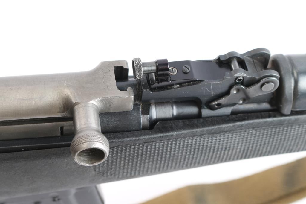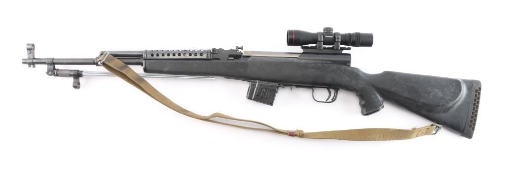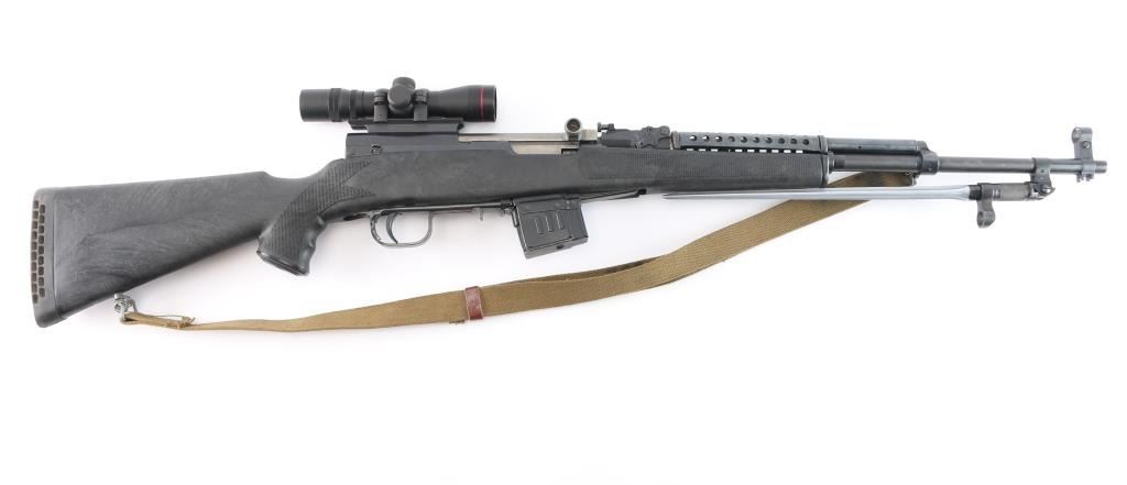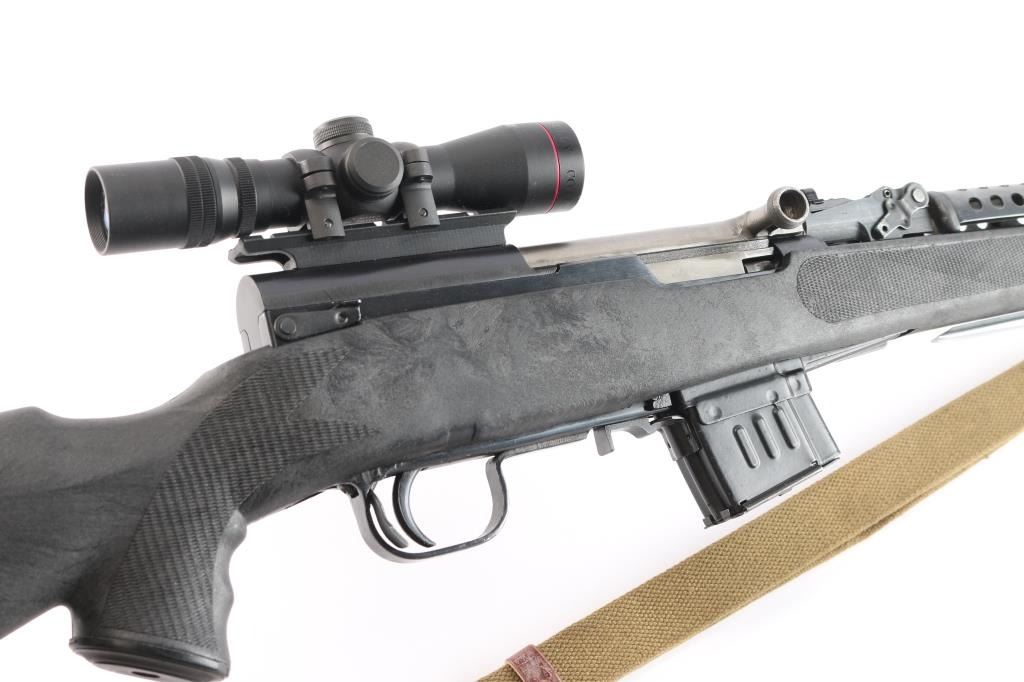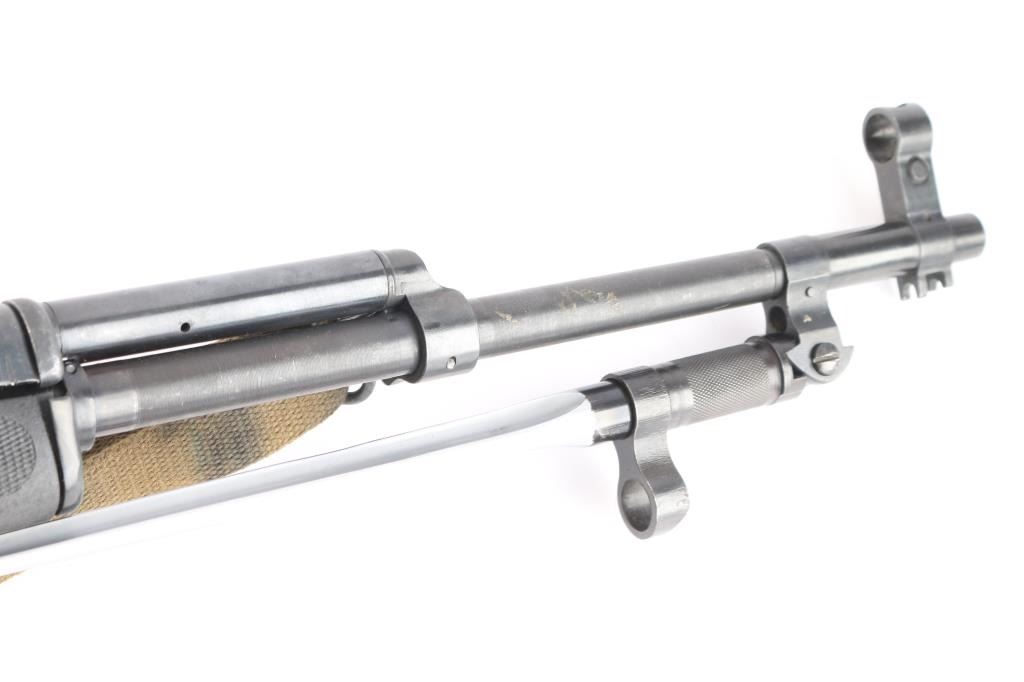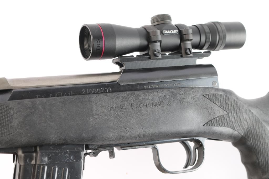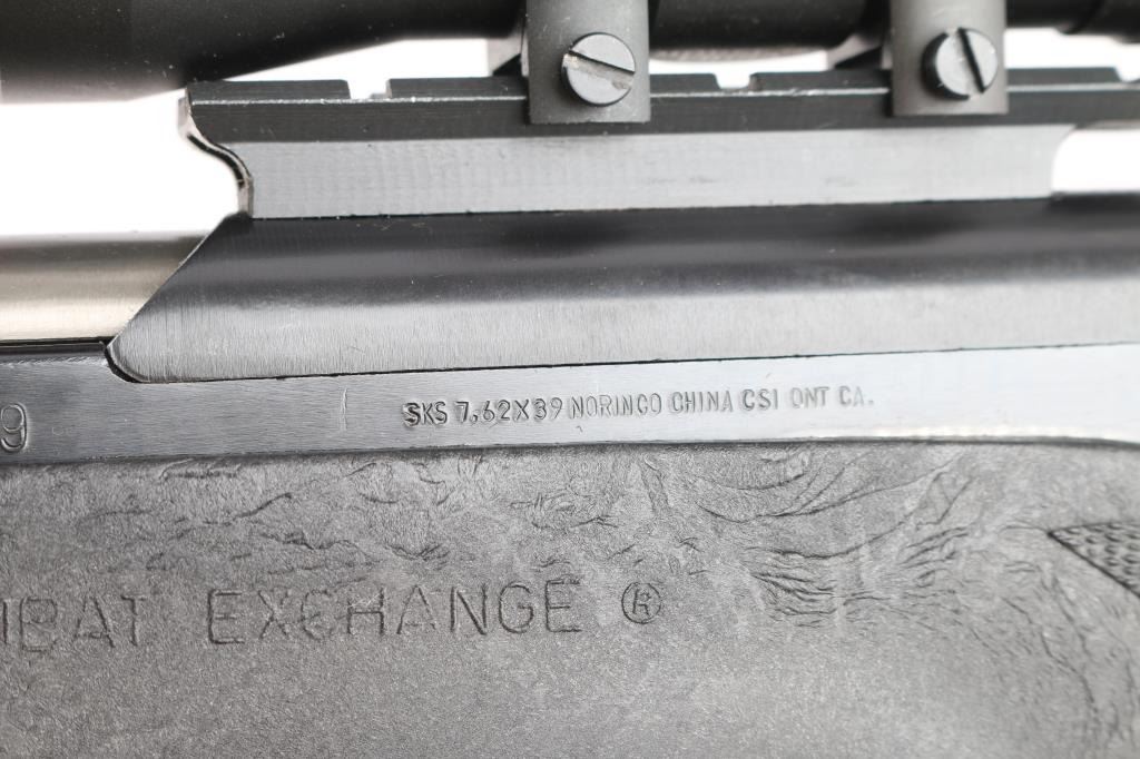 0141 marked on left receiver rail (Chinese Public Security), imported by CSI Ont. CA. Features approx 20" chrome lined barrel, folding spike bayonet, missing the bracket for cleaning rod (No cleaning rod included), military hooded post sight, Rear sight replaced with Williams WSKS-Aperture Sigh, upgraded with a detachable 10 round magazine, manual safety in triggerguard. Bore is excellent condition, appears hard chrome lined. Metal retains about 95% dark even bluing, with handling marks, minor scratches/scuffs. Stock is very good condition commercial replacement marked "Combat Exchange", Monte Carlo style sporter shape, black plastic, right handed cheek rest, rubber recoil pad, checkered surfaces at wrist & forend. Handguard is a commercial replacement, black vented steel. Mounted with a Simmons 2x28 scope with duplex reticle, clear optics. All observed numbers match.(Bolt & Receiver)