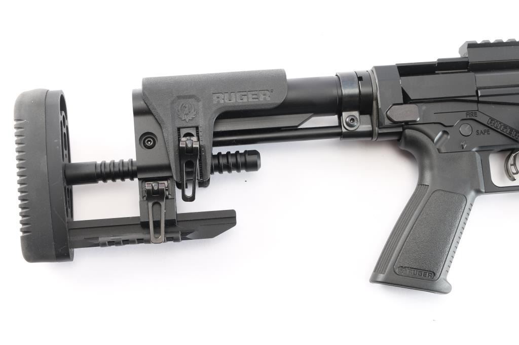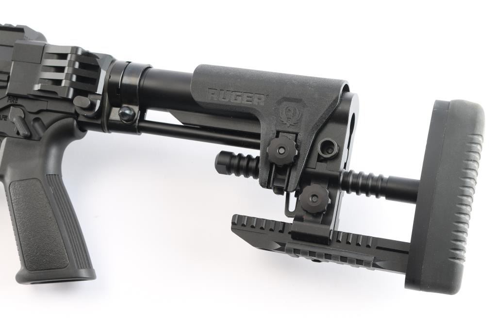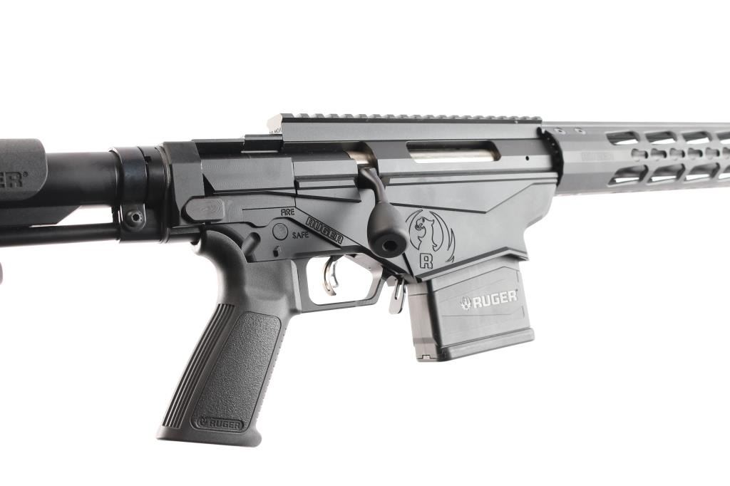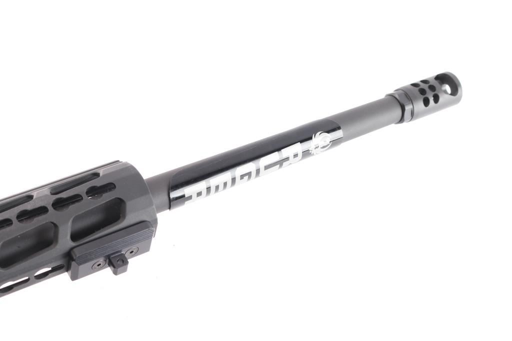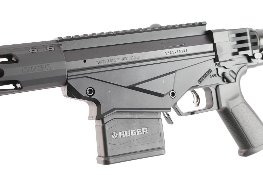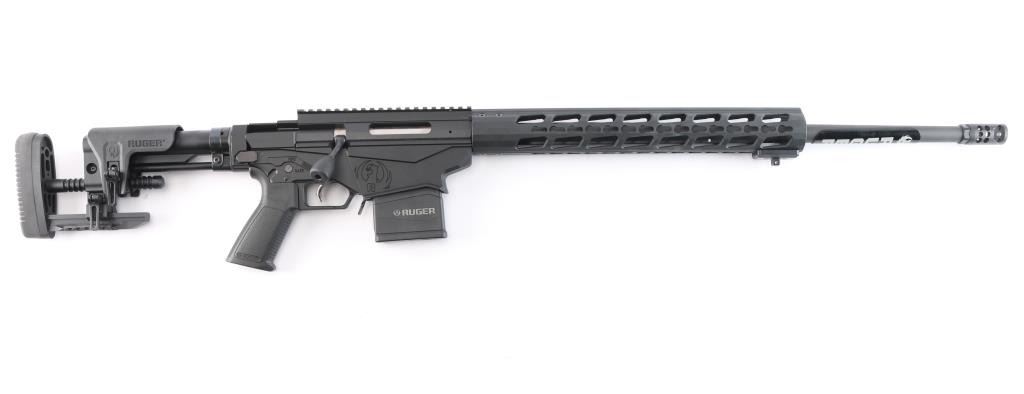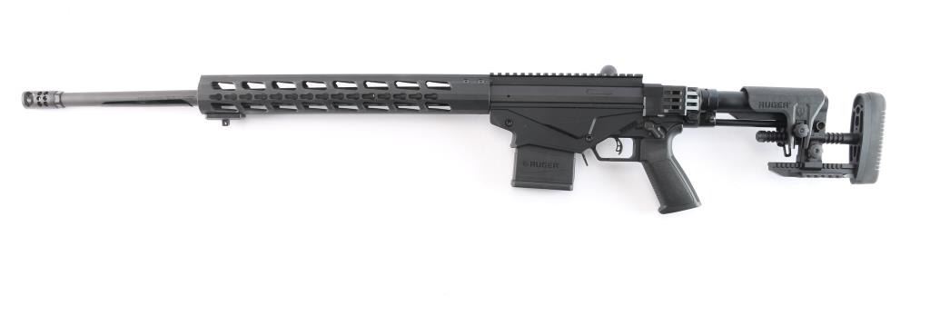 Optics Ready. Magazine fed bolt action target rifle chambered in 6.5 Creedmoor, manufactured in Newport, NH circa 2017. Features matte black finish, heavy contour 24” barrel with ported muzzle break, three-lug bolt with 70 degree throw & oversized knob, Marksman Adjustable trigger, accepts AI pattern magazines, one factory 10 rd magazine provided, manual safety, 15” aluminum free-float key-mod handguard, Picatinny rail section on receiver, sling stud attached to handguard at 6 o'clock position, AR style Ruger pistol grip, Ruger left-side folding shoulder stock adjustable for comb height & length of pull, rubber recoil pad. Bore is excellent. Retains 99% finish. Like new.