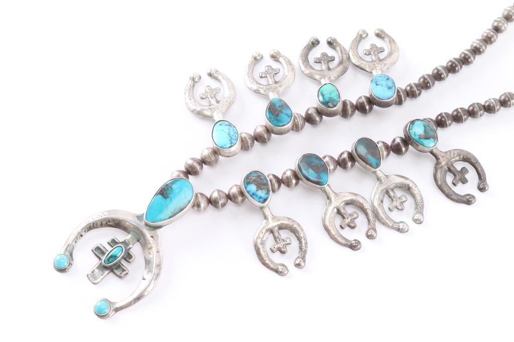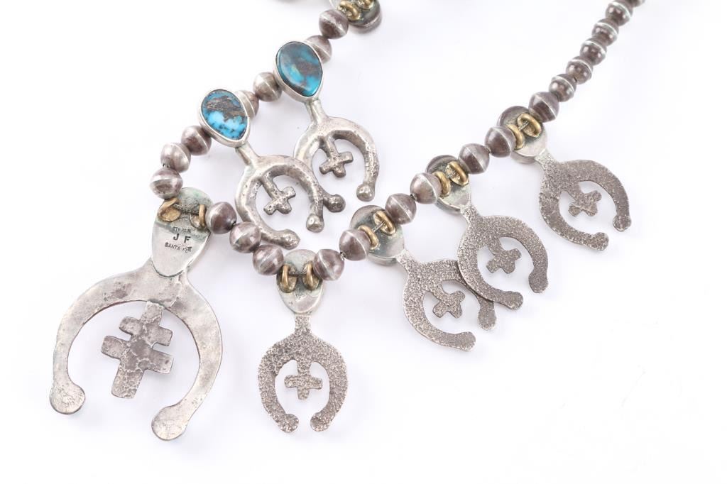 Older sterling type with hanging naja with crosses with oval cut turquoise accents