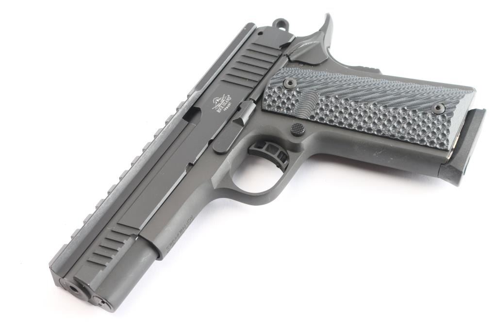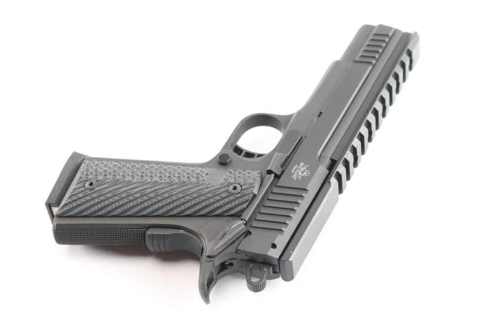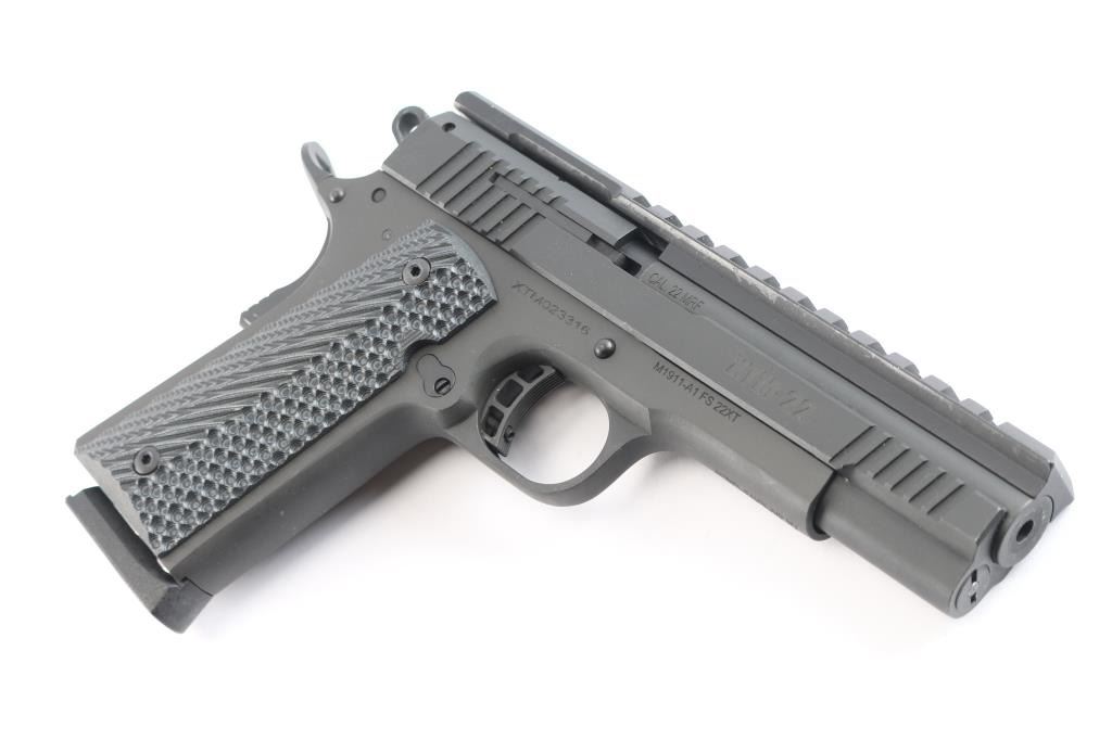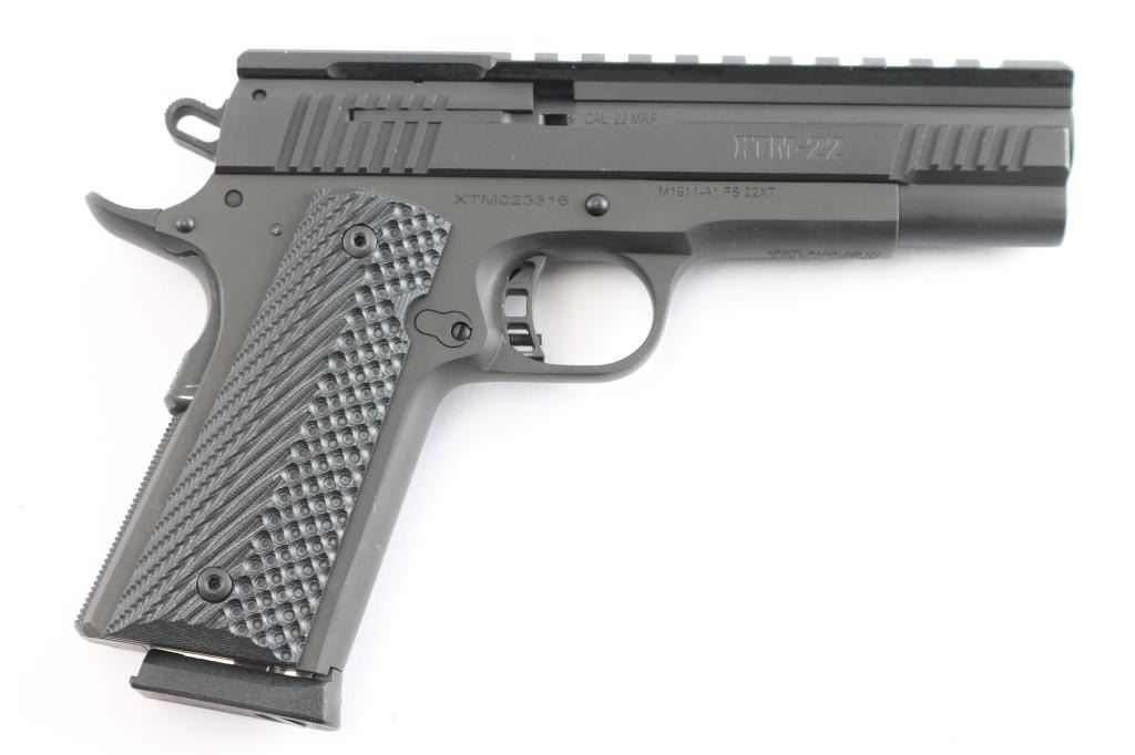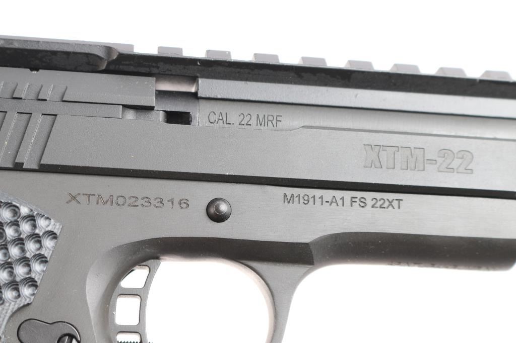 #XTM023316. Semiautomatic pistol chambered in 22 Magnum. Manufactured in the Philippines. Features a matte black finish, 4 5/8" barrel. no sights, full length Picatinny rail installed, thumb safety, skeletonized trigger adjustable for over travel,upswept beavertail grip safety, full length guide rod, G10 grips. One 10-rd magazine Bore is excellent/bright. Overall condition is excellent. Come with factory hard case with matching label, owners manual.