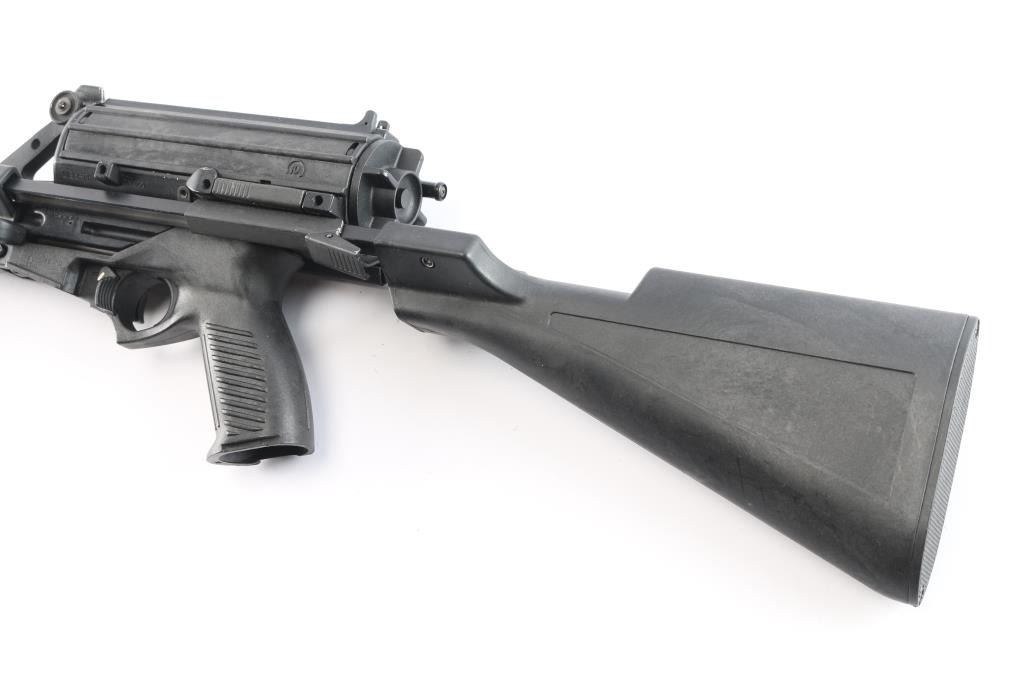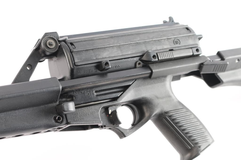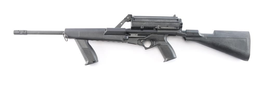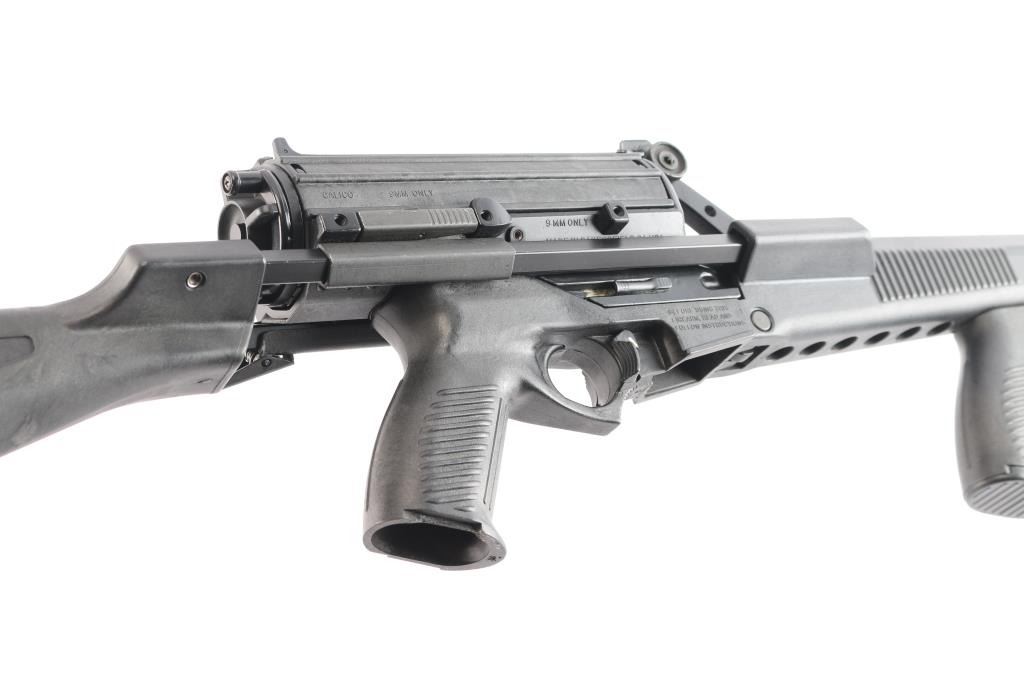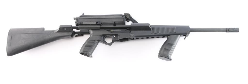 Unique helical-magazine-fed semi automatic rifle chambered in 9x19mm. Features a parkerized 16.1" barrel with muzzle brake, adjustable post front sight with white dot, flip-up aperture/two-dot rear sight, 50 round detachable magazine, black finished alloy receiver, ambidextrous paddle safety, smooth trigger, ventilated black polymer handguard, grooved pistol grip and telescoping shoulder stock. Rifle retains approximately 95% of its original finish showing superficial scratches/scuffs and contact wear on the metal stock arms. Stocks are very good with cap missing from the pistol grip. The bore is excellent, bright. Condition is NRA Very Good