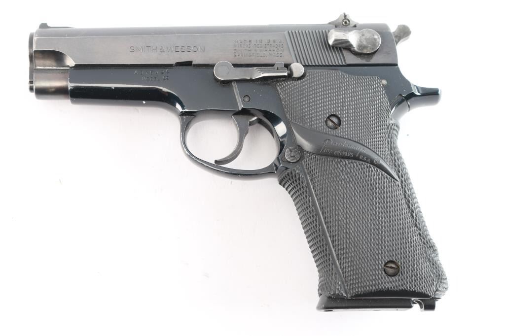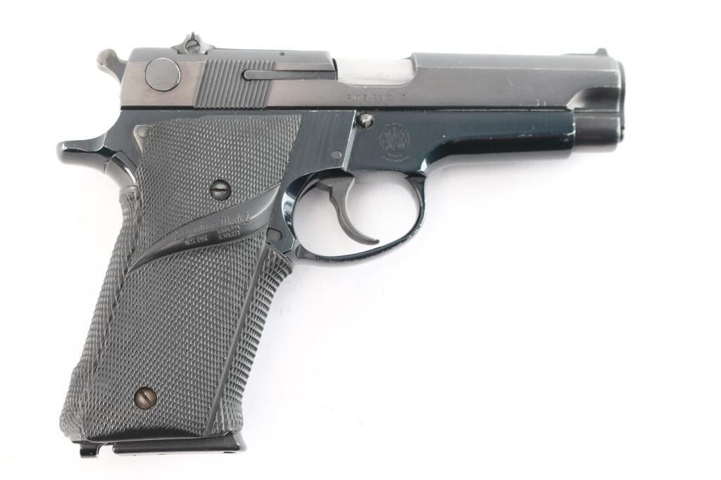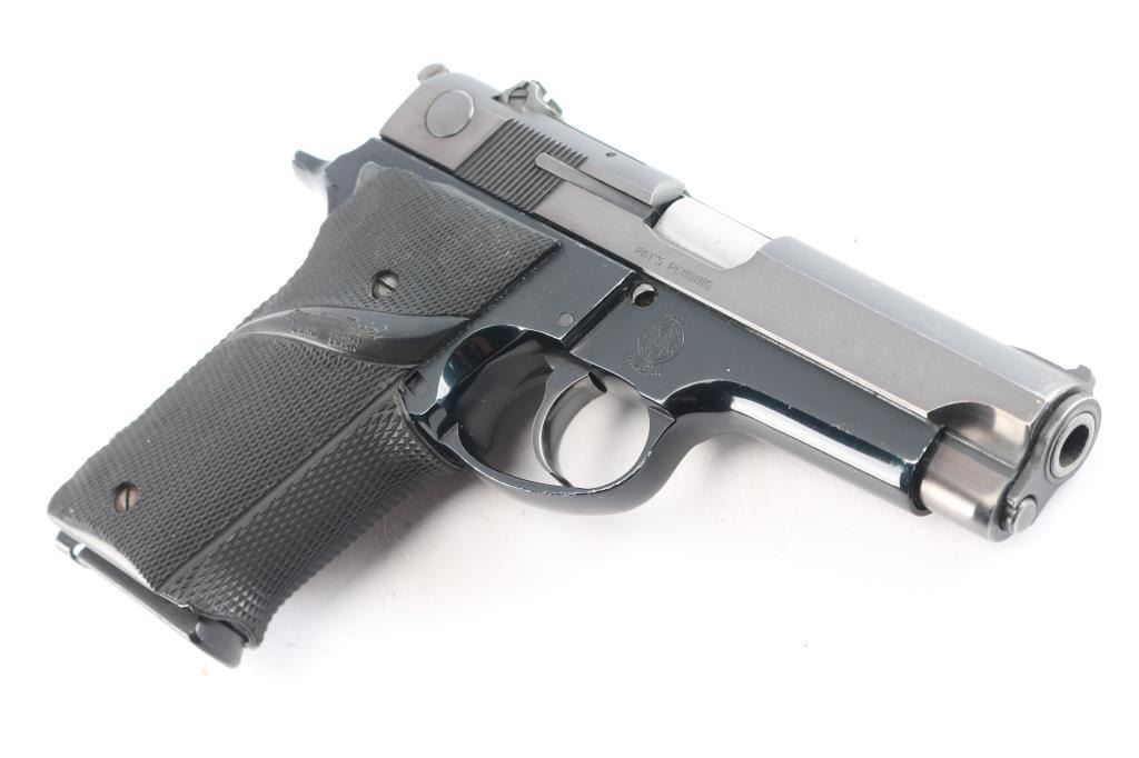 Double action semi-automatic ‘wonder-nine’ pistol chambered in 9x19mm, manufactured in Springfield, MA circa 1976-1977. Features a blued steel slide, 4" barrel, full-length steel guide rod, ramp front sight, which has been modified to Patridge style adjustable rear sight, smooth wide trigger, serrated round hammer spur, manual safety/decocking lever on the left side of the slide, magazine disconnect safety, push button magazine release, black anodized alloy frame with serrated front strap, serrated alloy mainspring housing with lanyard loop and black rubber checkered Pachmayr signature wrap-around grip. Pistol retains approximately 70% of its original finish showing losses on the safety/decocker, rear sight, hammer, slide stop and edges. Action is crisp, the bore is very good and the grips are good. Comes with one 10rd (California legal) magazine. Condition is NRA Good. ***Modern Firearm***.
