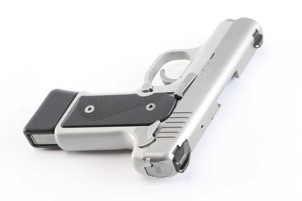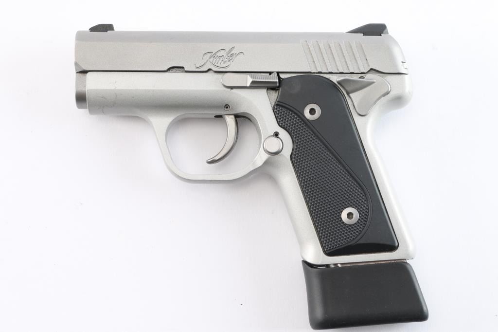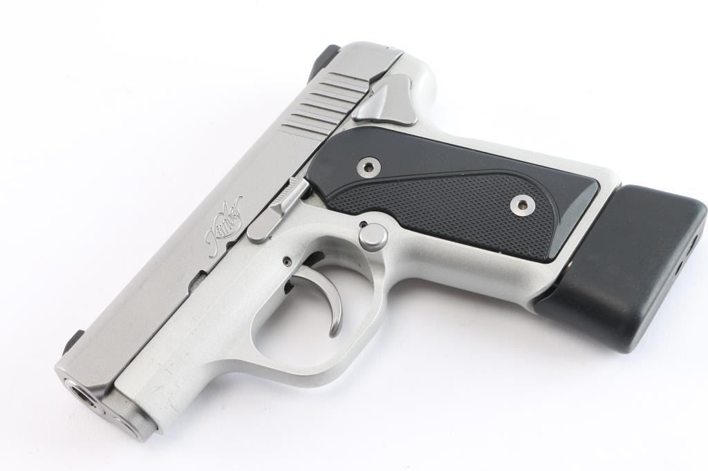 This micro-compact Kimber Solo Carry 9MM pistol features a high-grade aluminum frame with KimPro II finish, satin silver stainless steel slide, 2.7" stainless steel barrel, ambidextrous magazine release button and thumb safety, dovetail mounted low-profile white dot sights, checkered and smooth black synthetic grips, and a striker-fired trigger. One 8-rd magazine with extended floorplate. Bore is excellent/bright, action is smooth, finish and grips are overall excellent with a couple of very minor scratches.