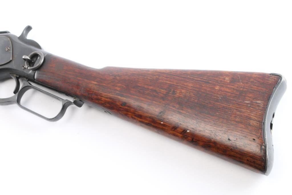 1873 Winchester S.R.C. 44-40 caliber, #256696. Shows old reblued finish with legible address and caliber marking. Dust cover replaced. Butt stock an old replacement. Saddle ring in place. Action working. Bore surprisingly good with strong lands and grooves and minor pitting. Winchester markings are clear, brass lifter unmarked. Manufactured 1887.