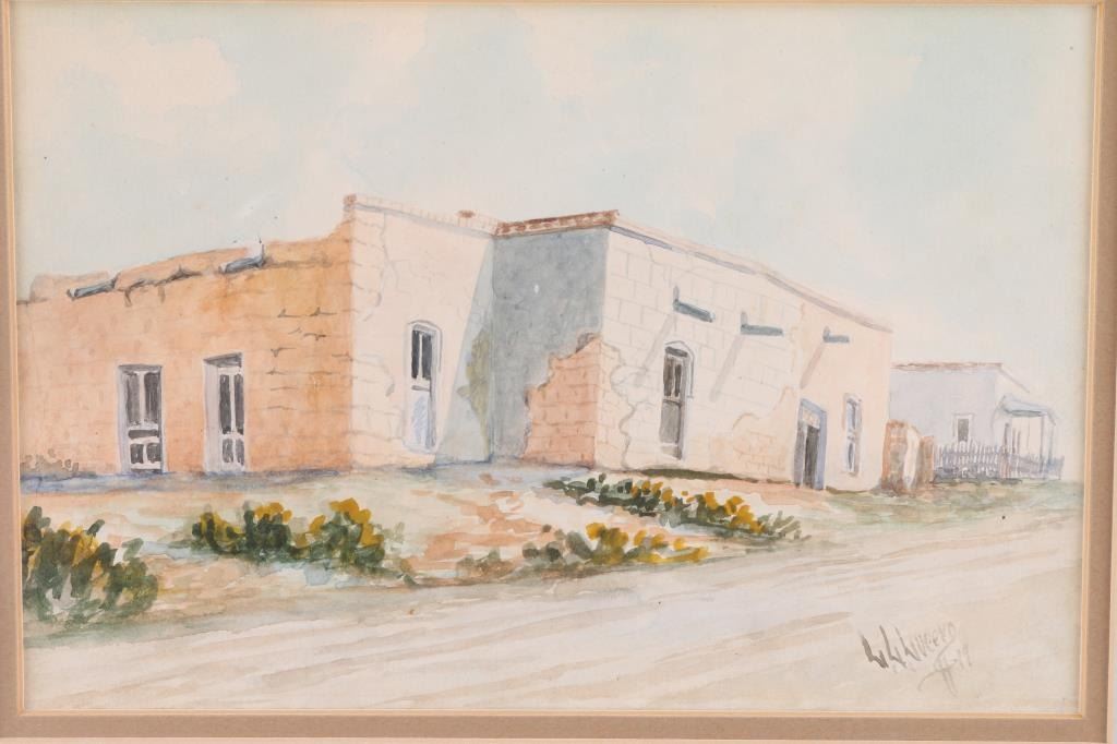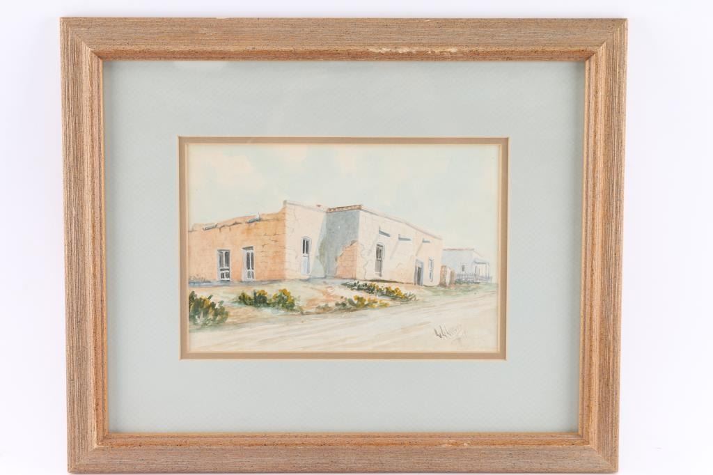 Signed lower right corner, undecipherable. Measures 14" x 17", double matted and framed behind glass. Watercolor measures 6 1/2" x 9 1/2".