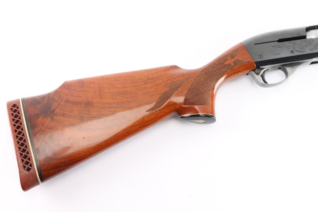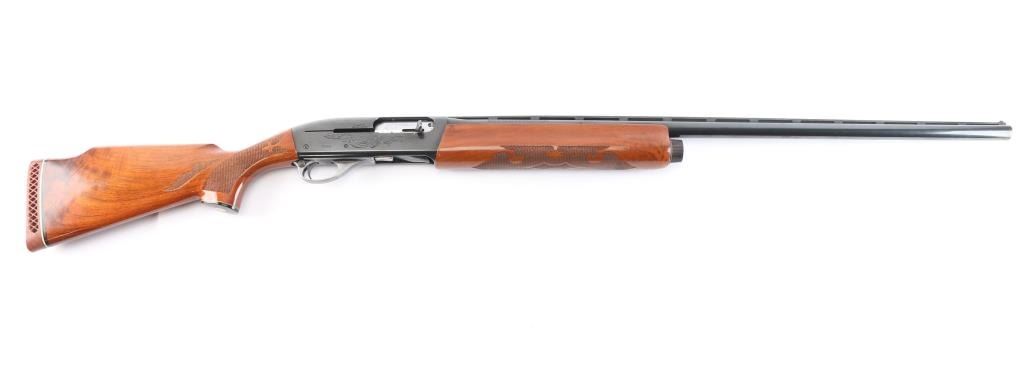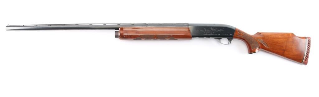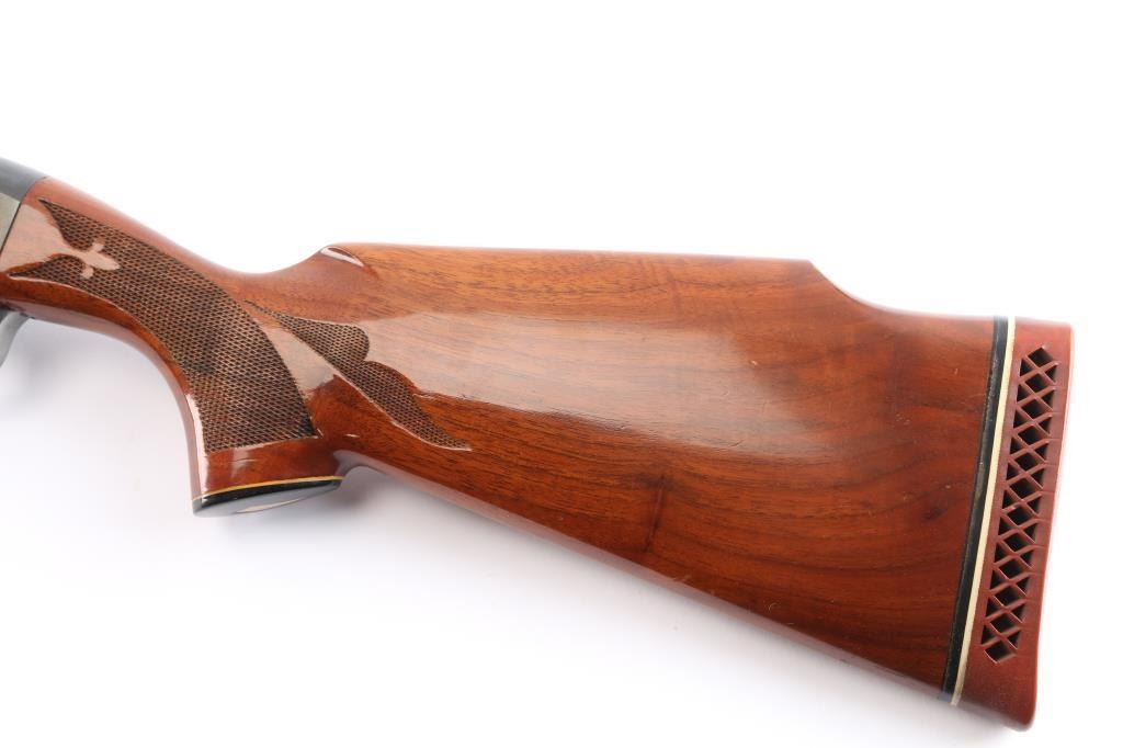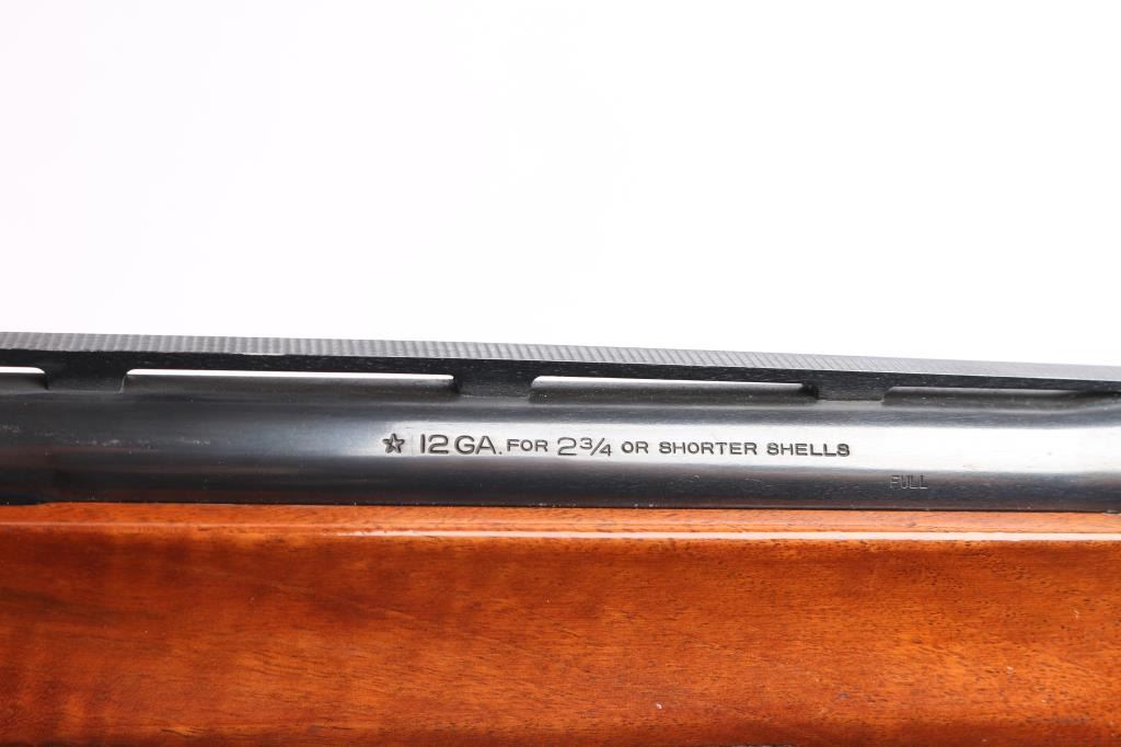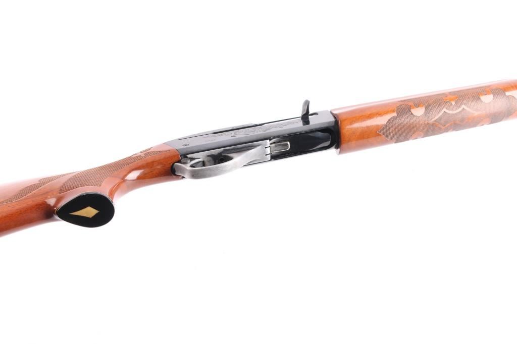 Engraved recoil operated semi-automatic shotgun chambered for 2 3/4" 12 Gauge shells, and built on a 12 gauge frame Manufactured 2002. Features a blued finish, Full fixed choked 30" vent rib barrel, white bead front sight, small silver bead mid-sight, half length magazine tube, scroll engraved receiver & bolt, push button safety, beveled trigger, glossy press checkered walnut forend and pistol grip shoulder stock with factory recoil pad & high comb. 14 1/2" LOP. Shotgun exhibits approximately 90% of it's original blued finish showing some minor scratches on the receiver and the alloy triggerguard mostly in the white from handling. Action is smooth, bore is excellent/bright and wood stocks are near fine with a few very minor scratches.