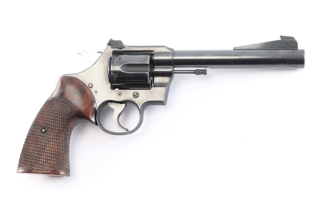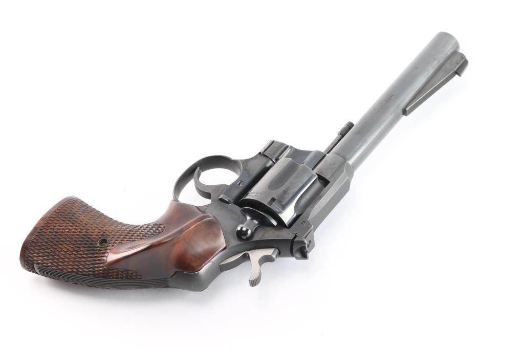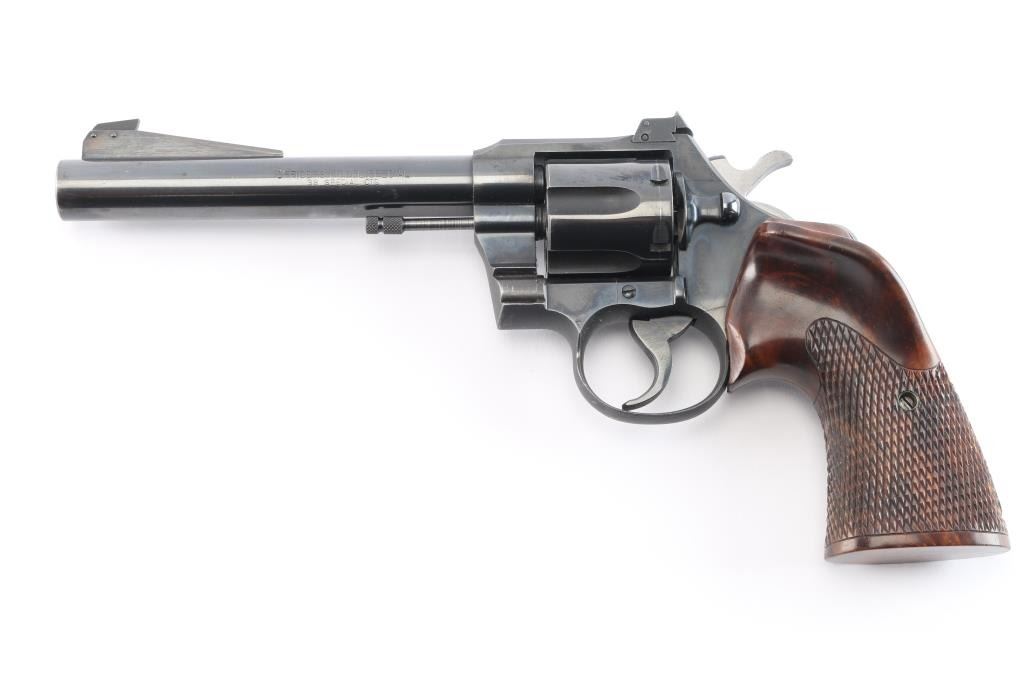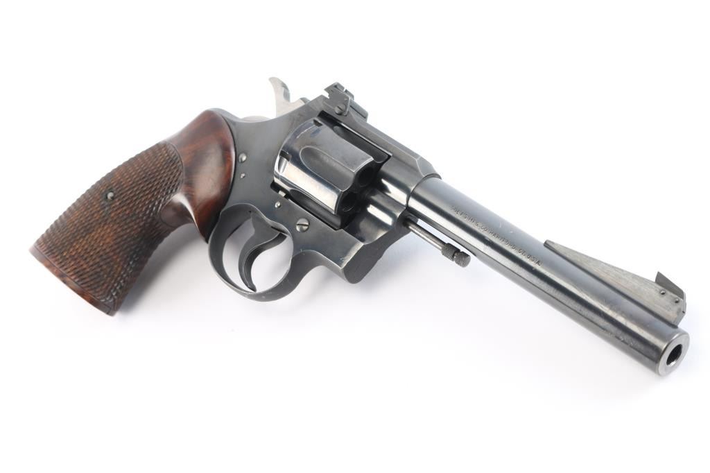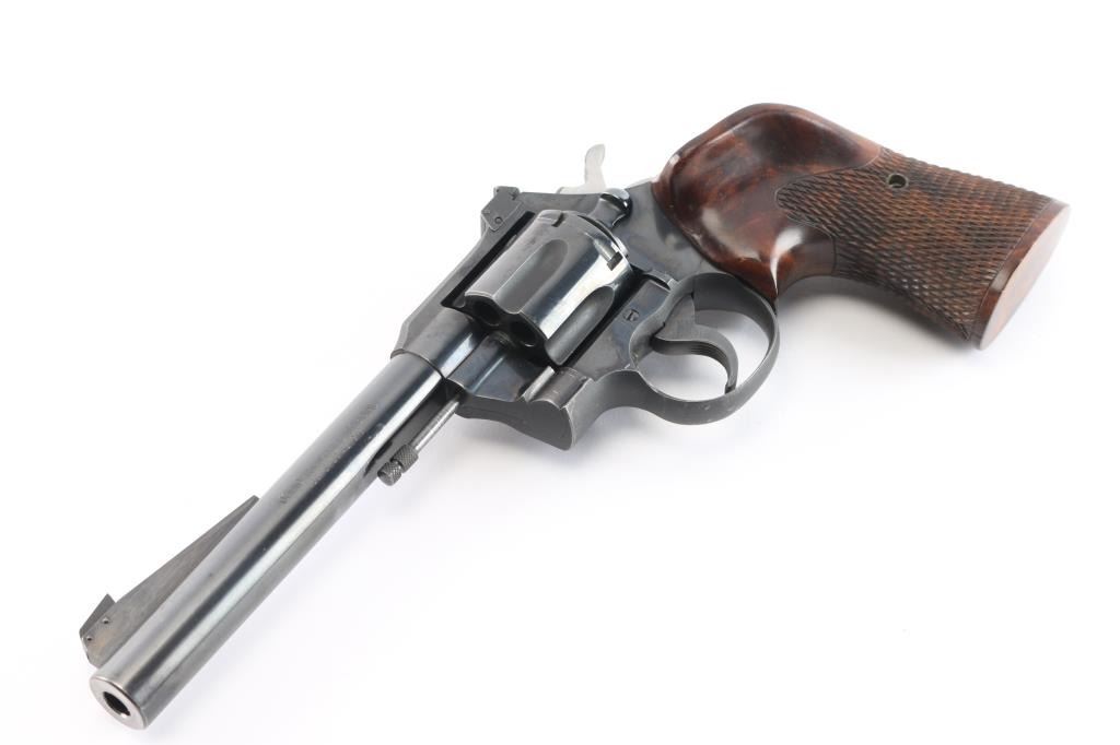 Vintage Colt double-action revolver, manufactured circa 1950. Features a blue finish, polished hammer sides, 6 round fluted swing out cylinder, 6" barrel, pinned blade front sight mounted on a serrated ramp, adjustable square notch rear sight, flat top frame, serrated hammer spur and trigger, checkered wood target grips with thumb rest. Retains approximately 98% of finish with slight muzzle/edge wear, a few very minor scratches, action is crisp with tight lock-up, grips are fine and the bore is excellent/bright.