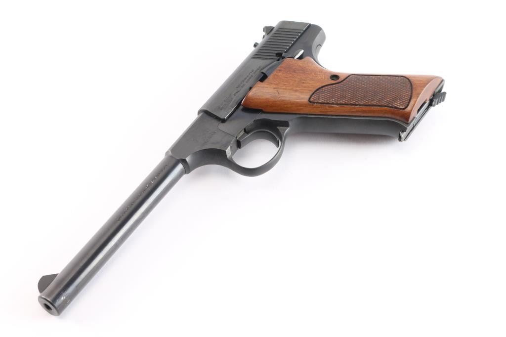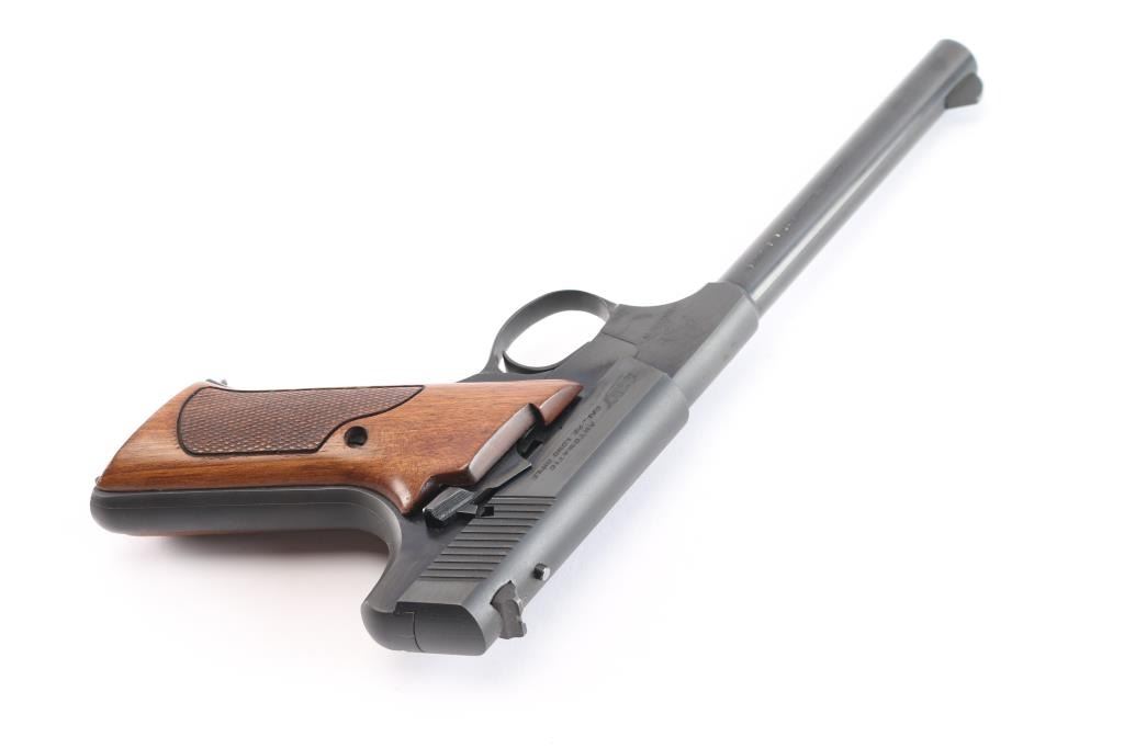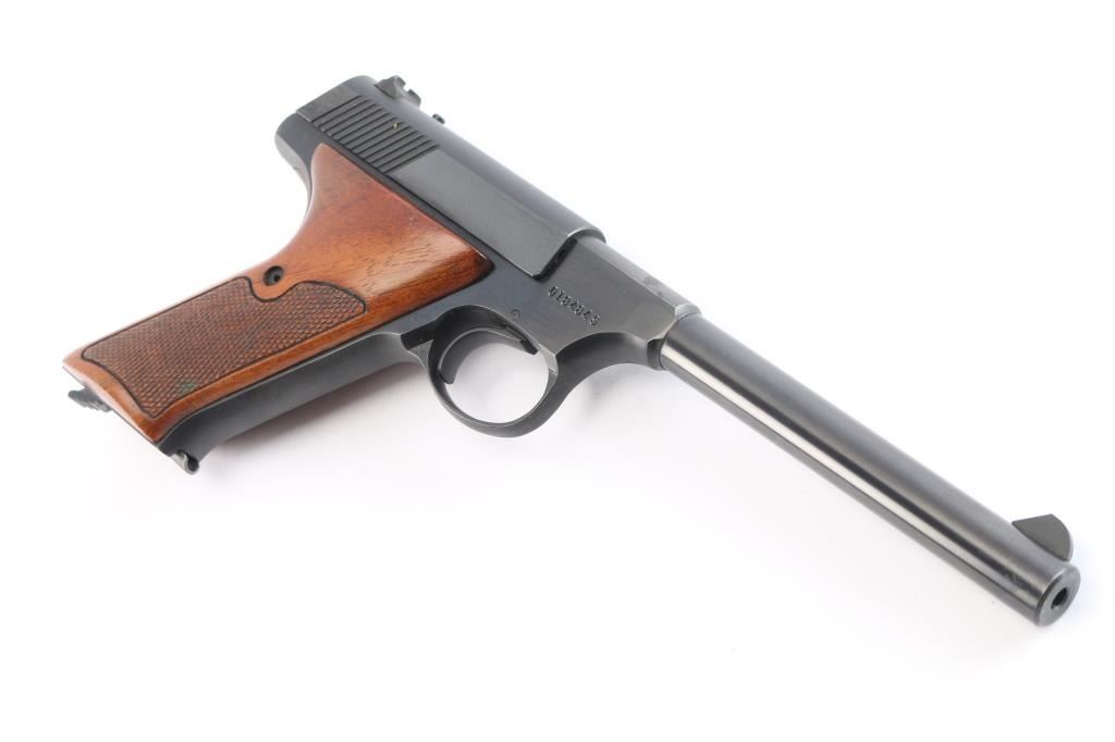 'Third Series' Vintage single action semi-automatic target pistol chambered in .22 Long Rifle, manufactured circa 1968. Features a matte/polished blued finish, 6" round barrel, serrated blade front sight, dovetailed rear sight with square notch, smooth wide trigger, thumb safety/slide catch on the left slide of the frame, heel magazine release, 10 round factory magazine, steel frame and two piece checkered walnut grips. Includes the original two-piece wood grain cardboard box with owners manual, intact with some scuffs. Pistol exhibits approximately 98% of it's original finish with slight muzzle wear, there is a small patch of pin-prick pitting on top of the chamber. Action is smooth, the bore is pristine, markings are crisp and the wood grips are fine.Would be Excellent if not for the pitting.