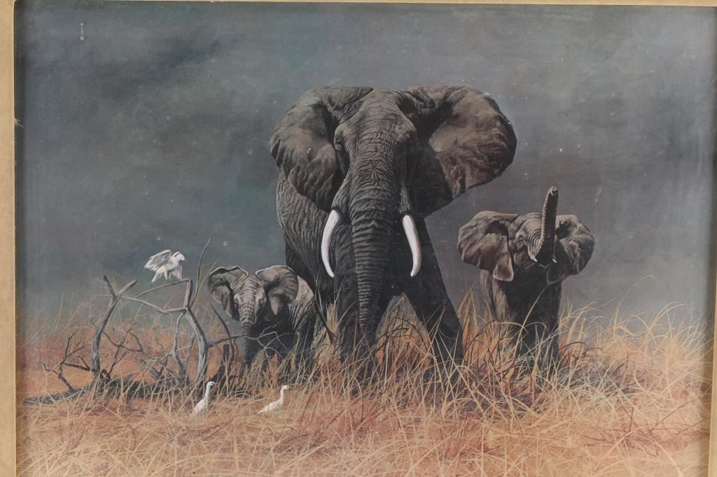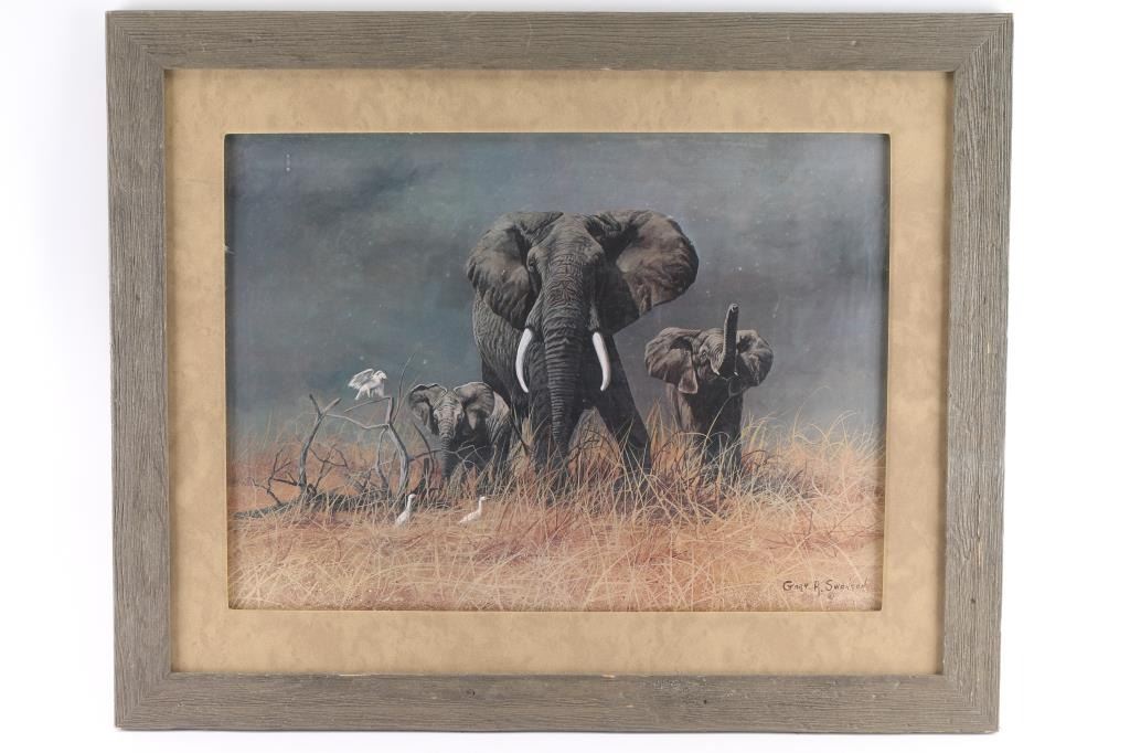Subject is elephants in the wild in a storm. Print signature located in lower right corner. Measures 24 1/2" x 30 1/2" in brown suede matting and brown wood frame. Print measures 16" x 22 1/2". Swanson is known for his wildlife paintings and prints.