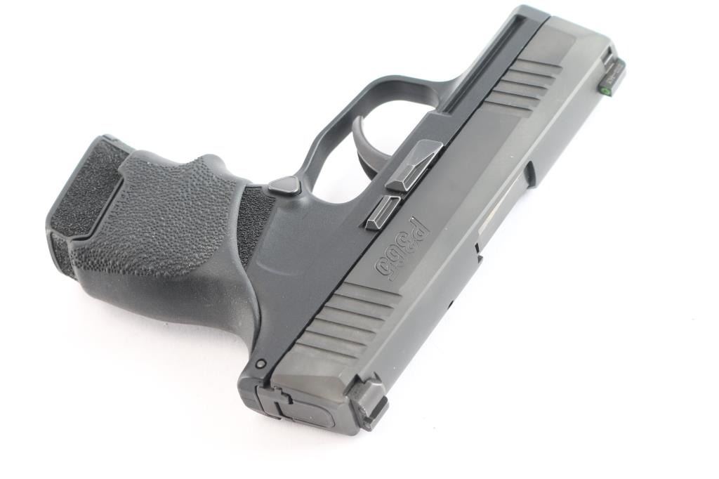 Modular striker fired semi-automatic sub-compact pistol rated for +P 9x19mm ammunition. Features a black Nitron finished stainless steel slide with fore & aft cocking serrations, 3.1" barrel with loaded chamber viewing window, captured recoil spring, XRAY3 three-dot tritium day/night sights, smooth curved trigger, push button magazine release, factory 12 round magazine with grip extension, and black polymer module with integral accessory rail, stippled grip panels, & Hogue pebbled black rubber slip-on grip sleeve. Includes a factory hard case with manual and OEM 10 round flush-fit magazine. Pistol retains approximately 99% of its original finish showing minute edge wear and a couple small scratches. The action is mechanically sound, the bore is excellent, the night sights have some glow, and the polymer is excellent.