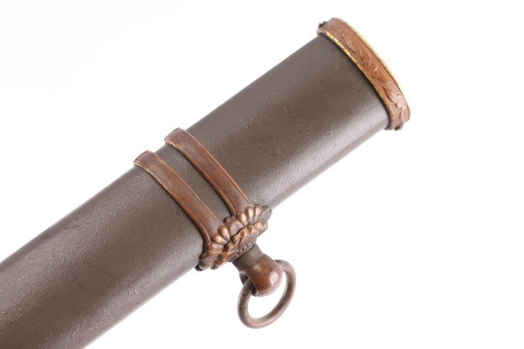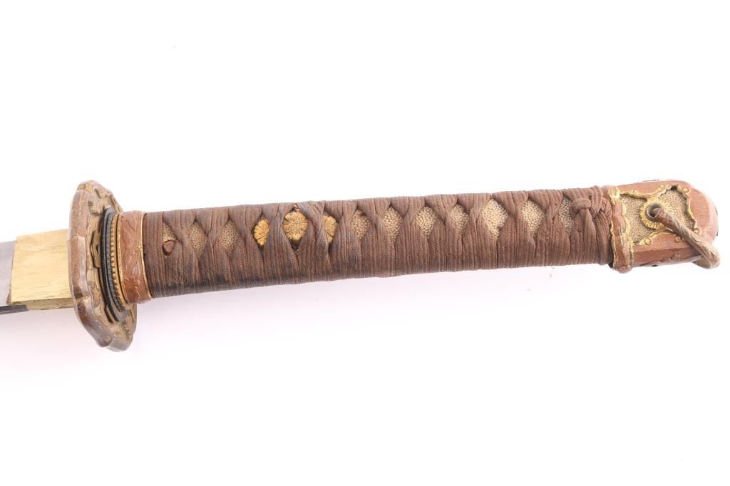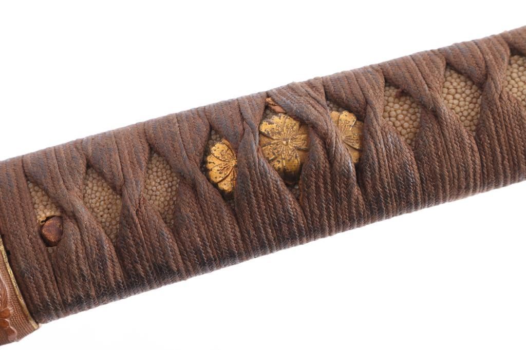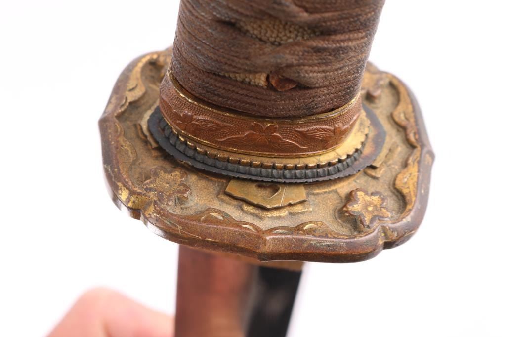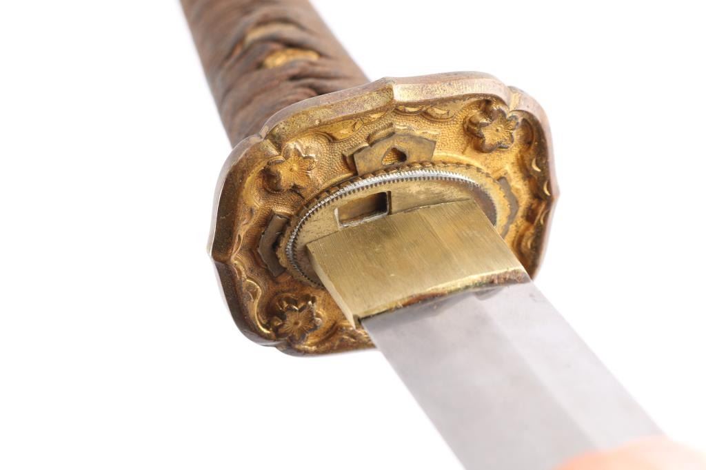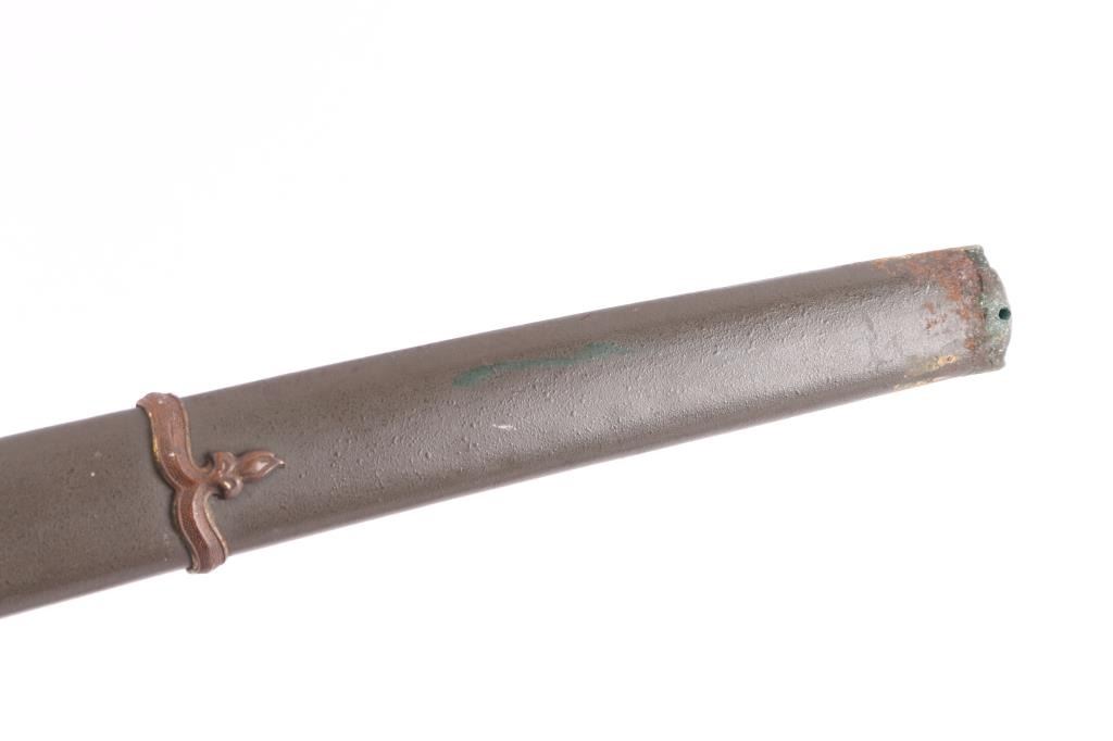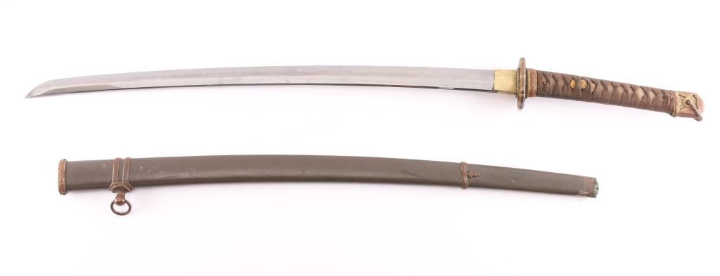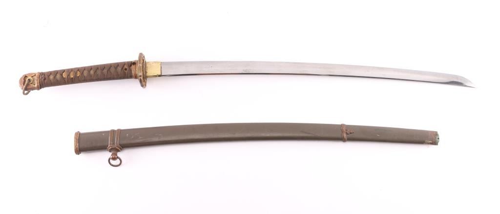 Japanese Type 98 Army Shin-Gunto officer’s sword. The beautiful, 26" blade is in excellent condition, bright, with a distinct wavy temper line. This blade is seated through a multi-piece closed tsuba, with the tang secured with a bamboo peg. The tang is unmarked. The military-style hilt is typical officer quality, complete, and all original. It is constructed of a wood base, covered in ray skin with the traditional 3 brass cherry blossoms all wrapped in original brown cloth tape with a twist. The kabuto-gane, (pommel) is copper/brass. There are 8 Seppa (spacers) around the cross guard to keep the fit tight, and all are inletted for the scabbard lock. The scabbard (saya) is steel, and retains nearly all of the original olive paint. The ornate copper/brass ashi is in place for carrying. As is most often the case with these scabbards, a spring clip retention system is employed which is missing, the Tsuba is loose and the scabbard is missing the ishizuki.( end fitting)