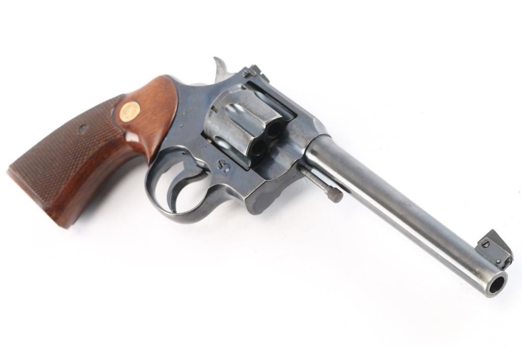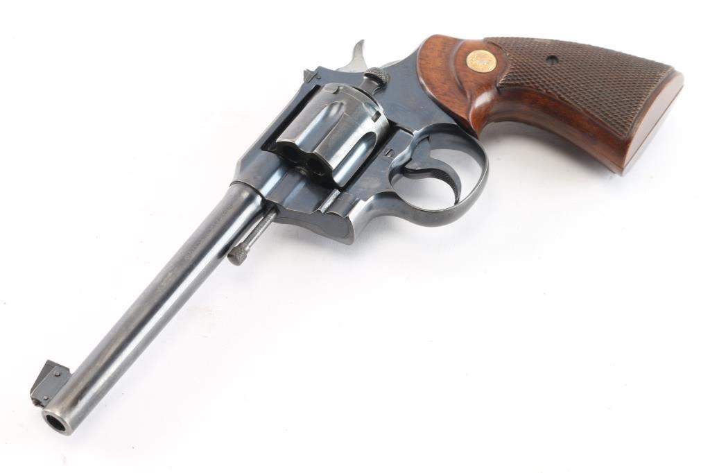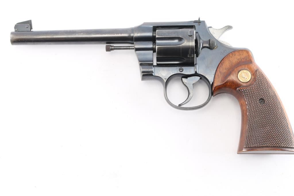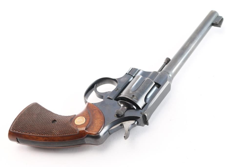 Pre-War 'Target" revolver chambered for .38 Spl , pre war revolver. Manufactured 1926, (shared serial number range with Army Specials) blued finish with polished hammer sides,checkered wood grips sporting the gold toned Colt medallions. 6" round, tapered barrel. It has a raised ramp, pinned, front sight with adjustable square notch rear sights. Knurled trigger and knurled hammer spur. Exposed extractor rod. Bore and cylinder are excellent. All Colt markings are crisp/clear. Grips are excellent. Action is crisp/tight. Blue is about 90% with edge/muzzle wear, track lines on the cylinder, and a few scratches, handling wear on the barrel..