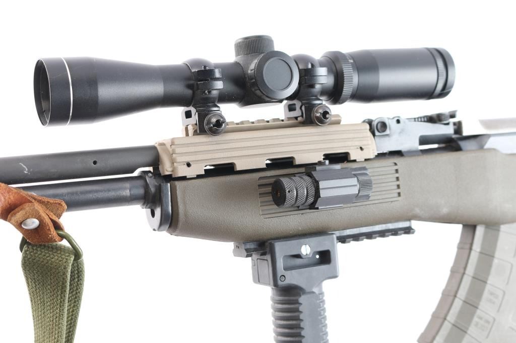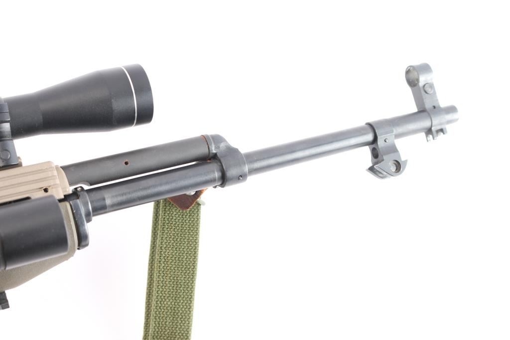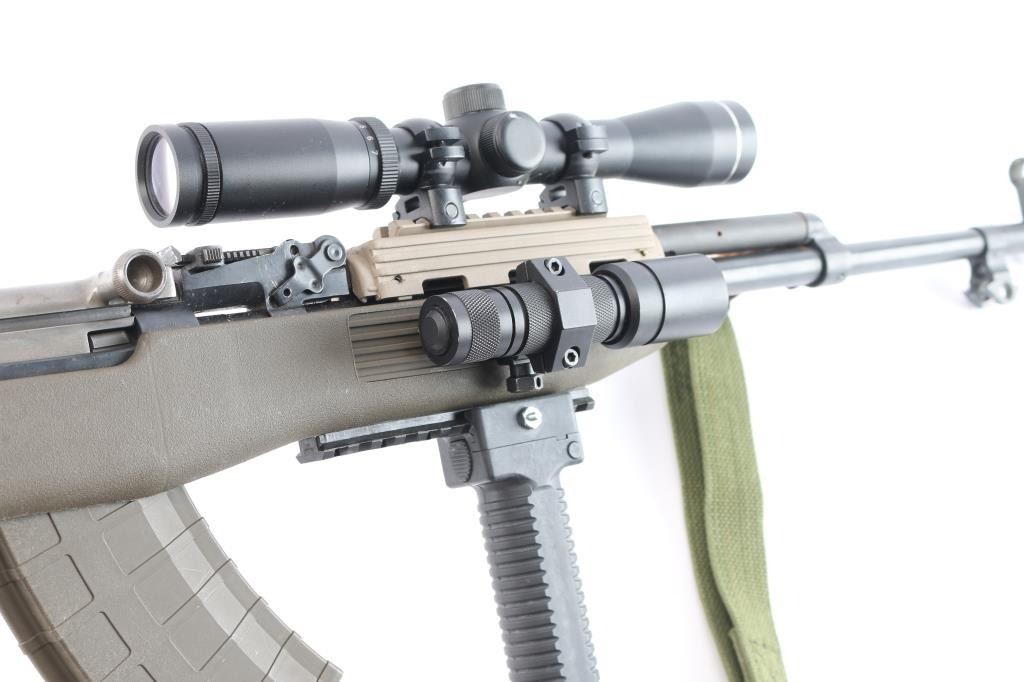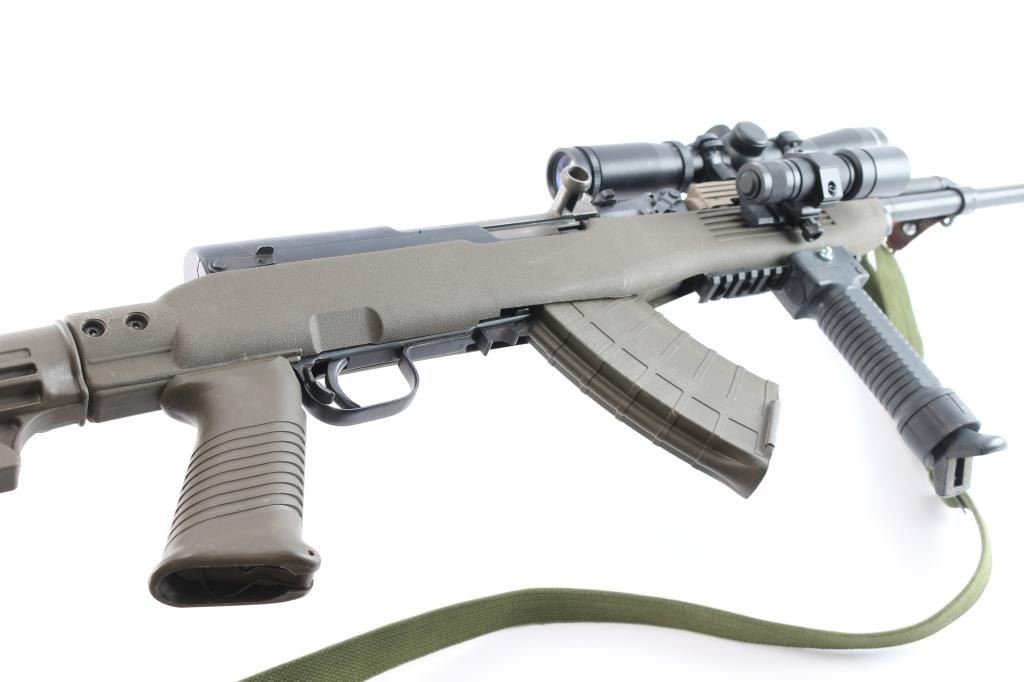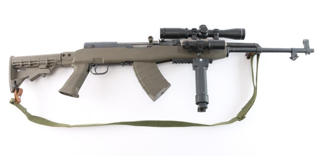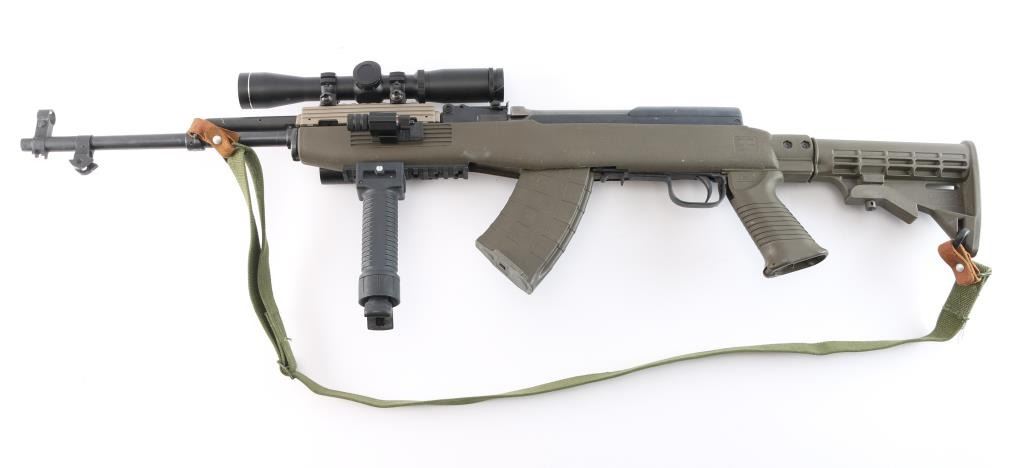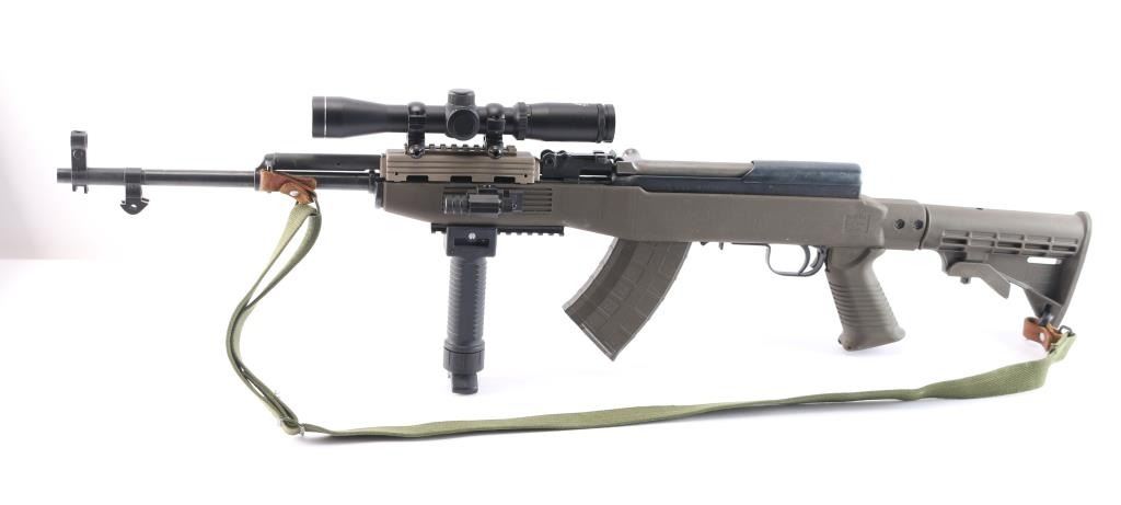 Sporterized Chinese military semi-automatic rifle. Imported by IA Co. Arsenal marked People's Liberation Army Factory No. 6618. Formerly Xiangyang Locomotive Factory ran by the PLA railway corps. This was not recorded on SKS-Files. Bayonet removed, no cleaning rod, standard sights, manual safety in triggerguard, serial number matched on bolt & receiver, no others observed. Green polymer Tapco tactical pistol grip stock with attached foregrip with projecting bipod, collasping shoulder stock, vented handguard mounted with a NcSTAR 2-7X32E scope with duplex reticle, clear optics, tactical flashlight installed on right fore stock, needs batteries and red dot laser sight installed on the left, in good working order. Comes with one TAPCO 20-rd polymer magazine and Chinese military web sling. Bore is very good/bright, overall very good condition.