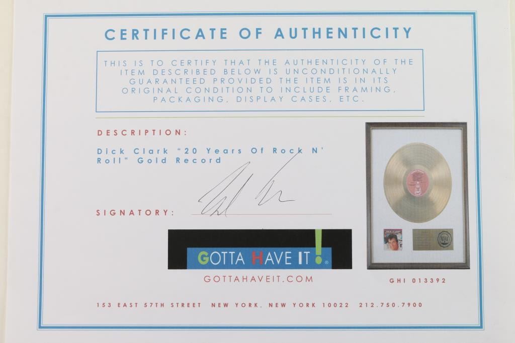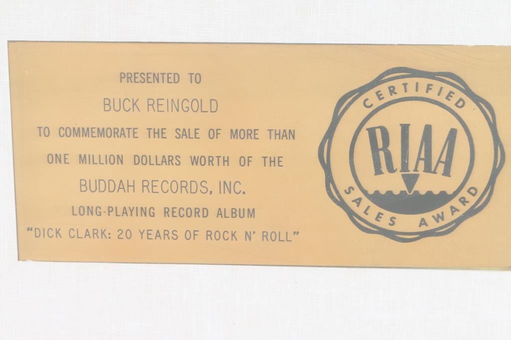Plaque states: "Presented to Buck Reingold, to commemorate the sale of more than one million dollars worth of the Buddah Records Inc. long- laying record album 'Dick Clark 20 Years of Rock N' Roll'". Measures 21 1/2" x 17 1/2" in wood frame. Purchased at Barrett-Jackson Auction, Scottsdale AZ for $700 in 2007. Comes with Certificate of Authenticity from the Rock & Roll Trust in New York, New York.